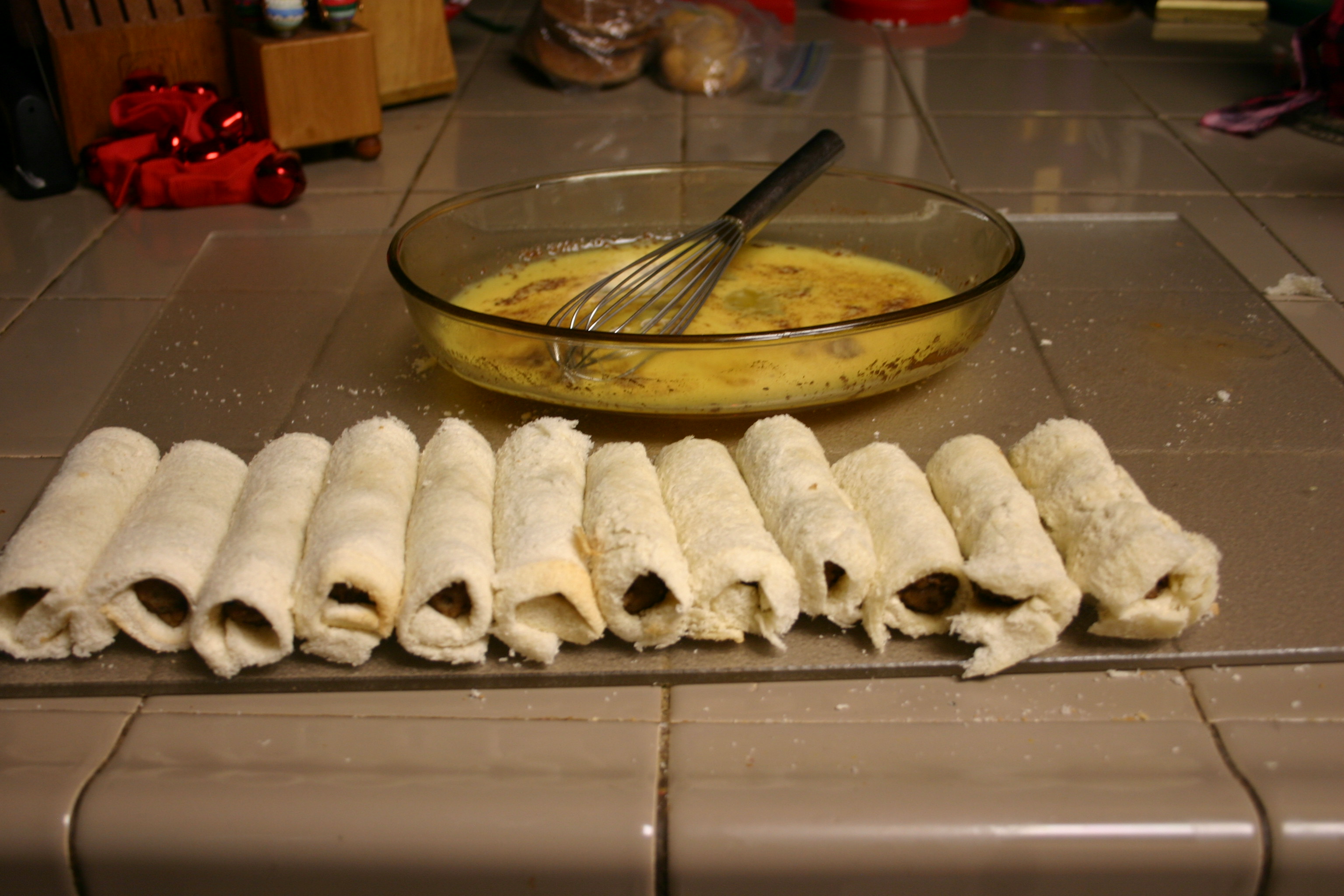Gently roll the bread wrap in the egg mixture, let any excess egg drip back into the bowl. Place roll ups in the warmed skillet, seam side down. Allow to fry for a few minutes, until golden brown. Give a quarter turn, continue to grill until all the sides are golden.