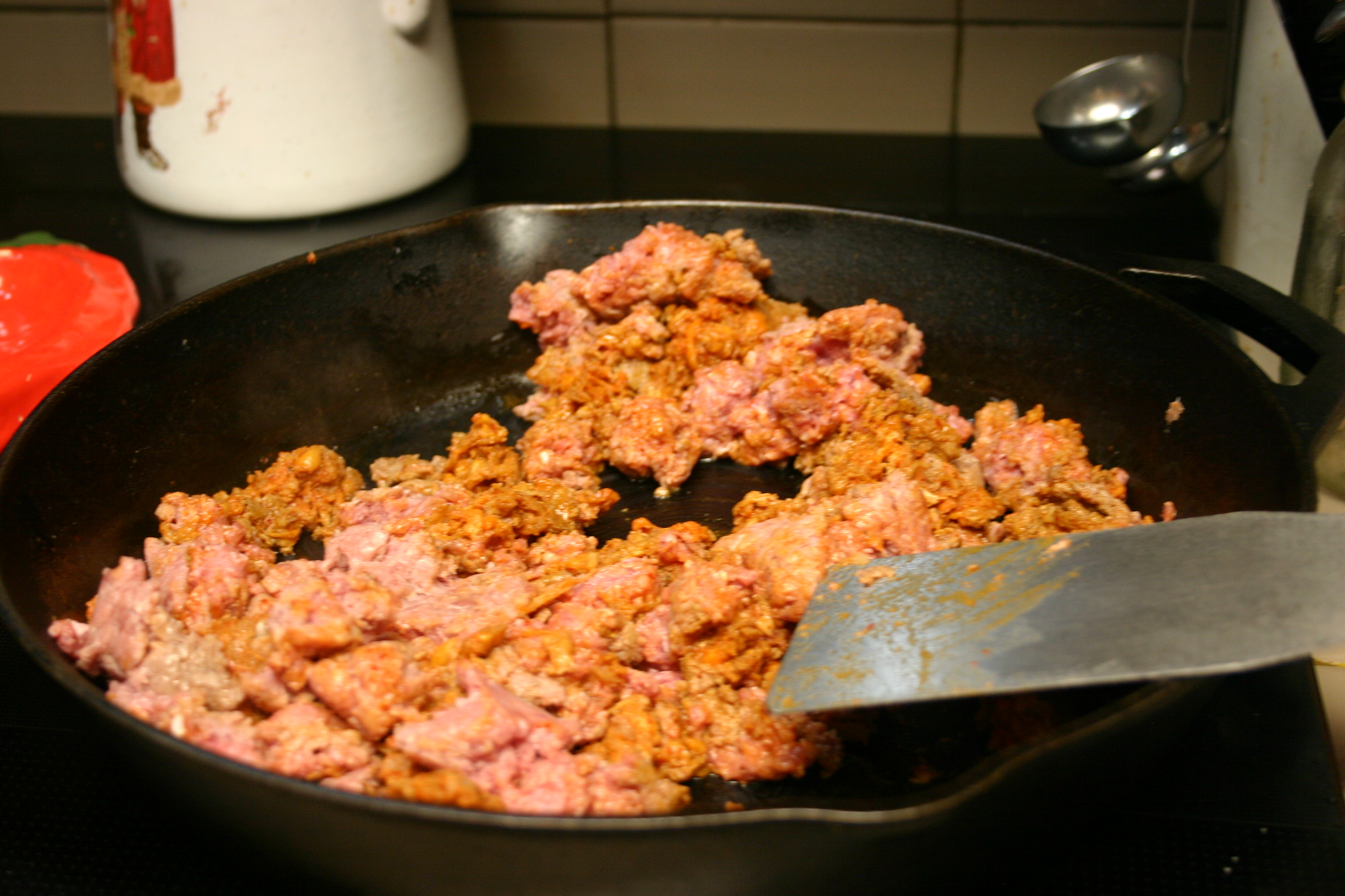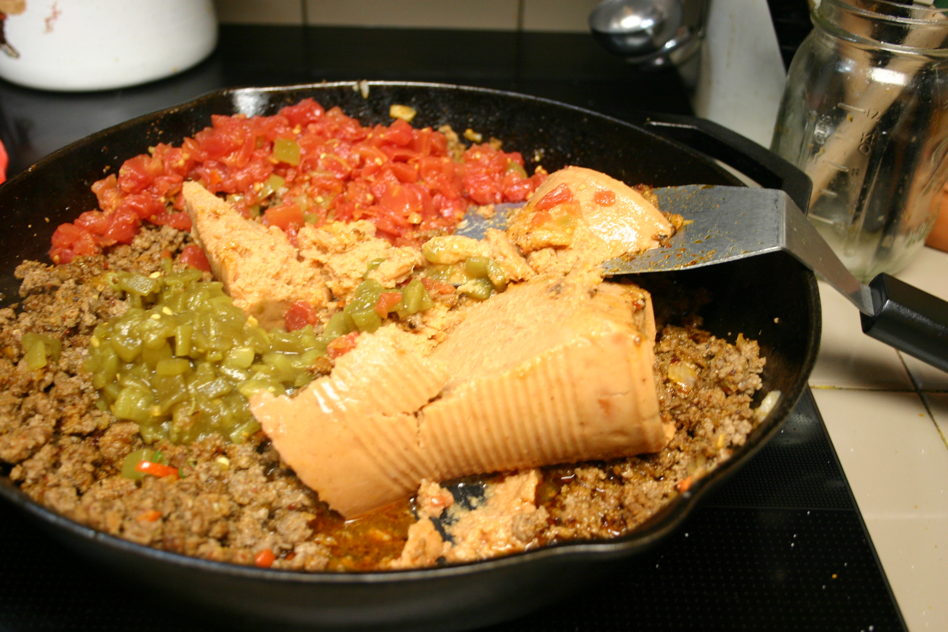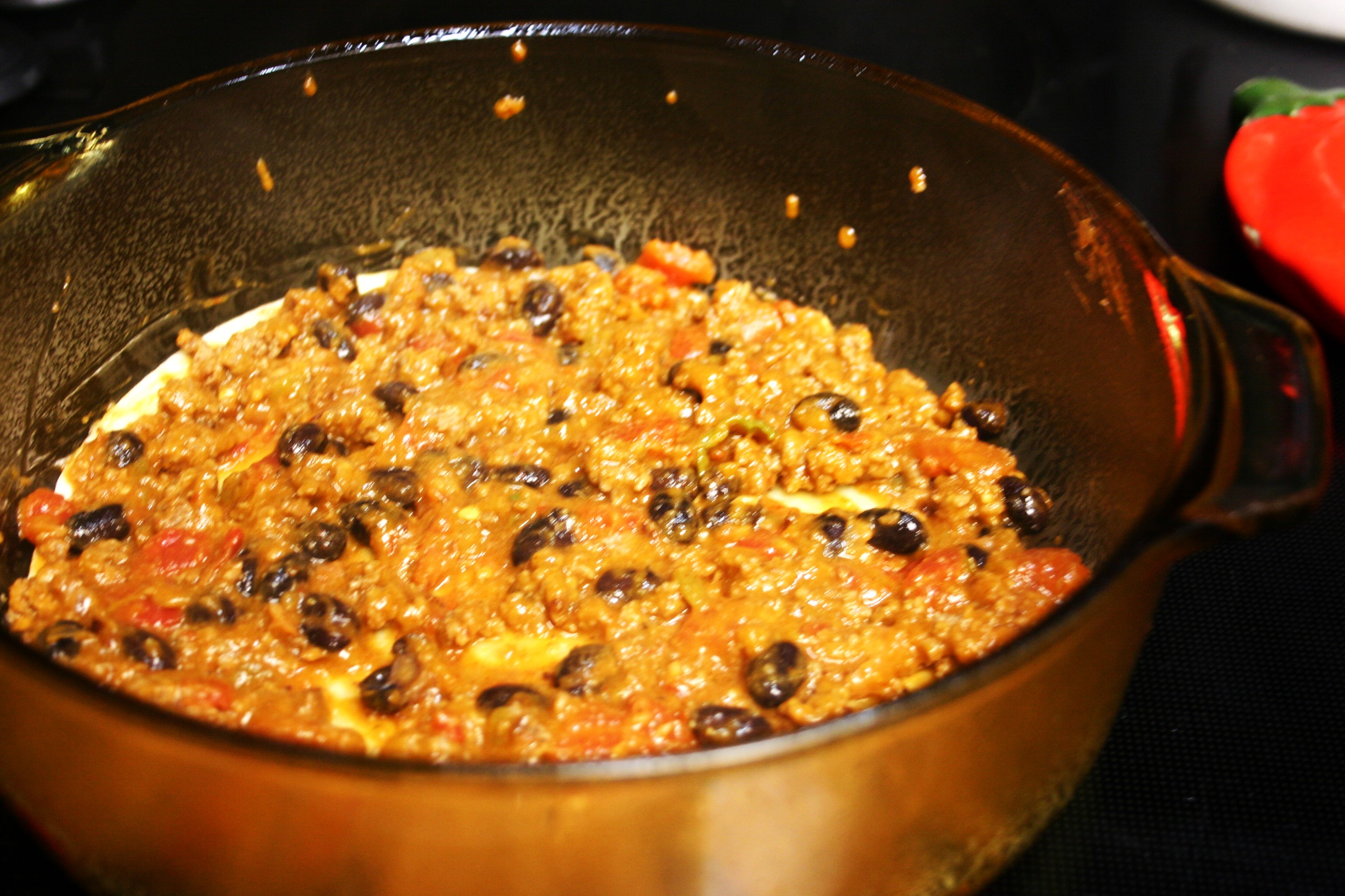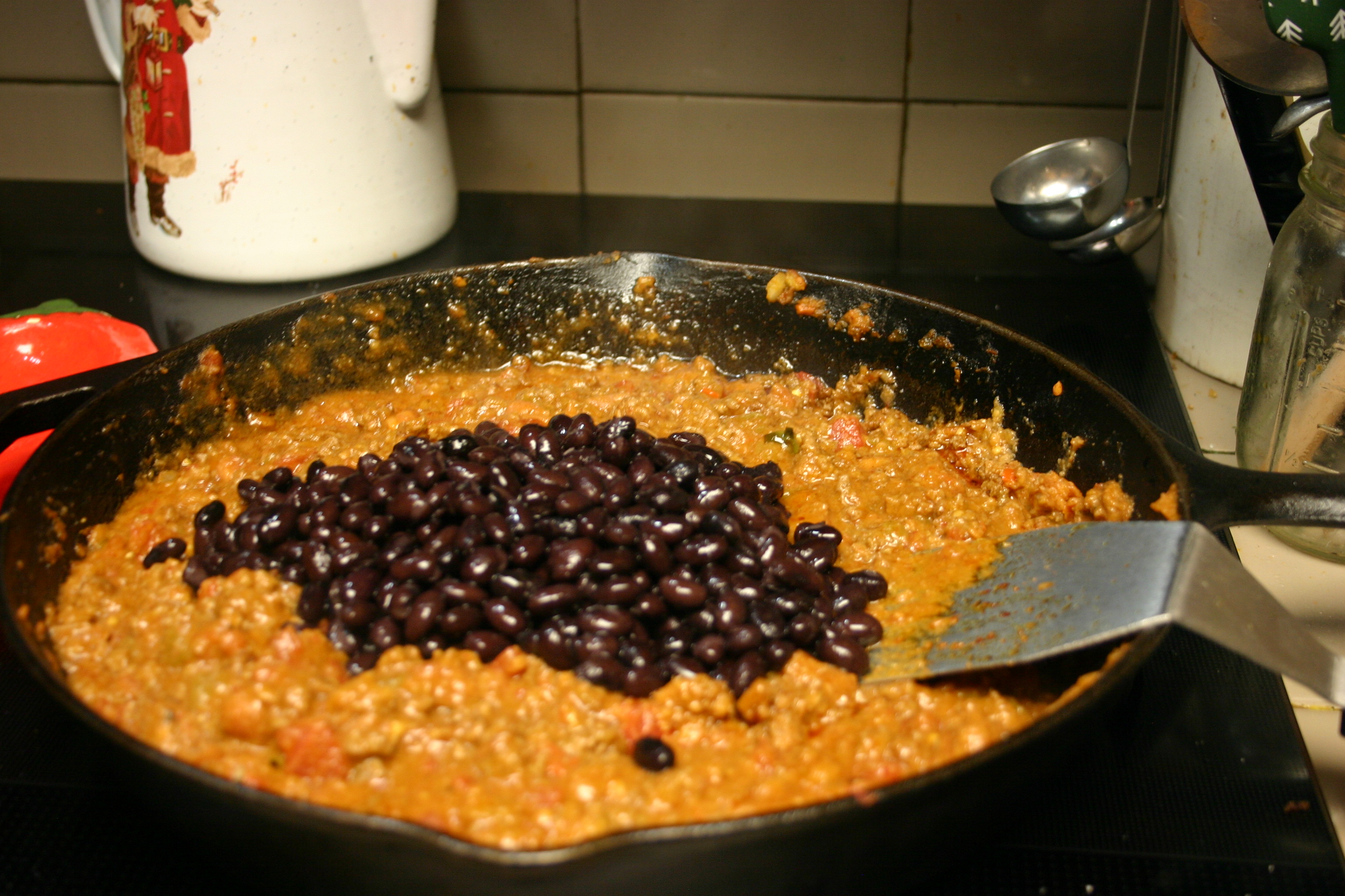 Drain and rinse the whole black beans. Gently stir whole beans into the meat mixture, set aside.