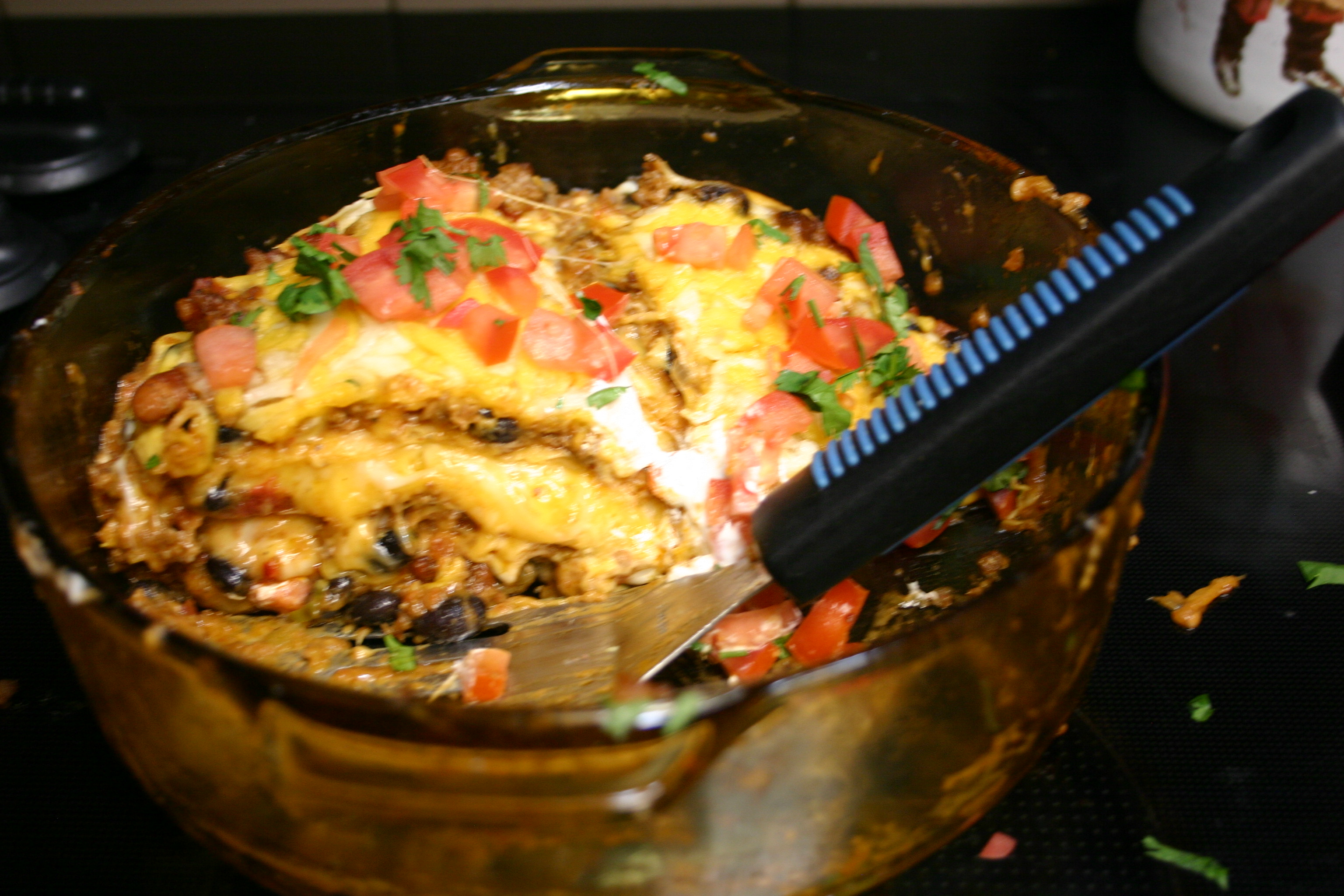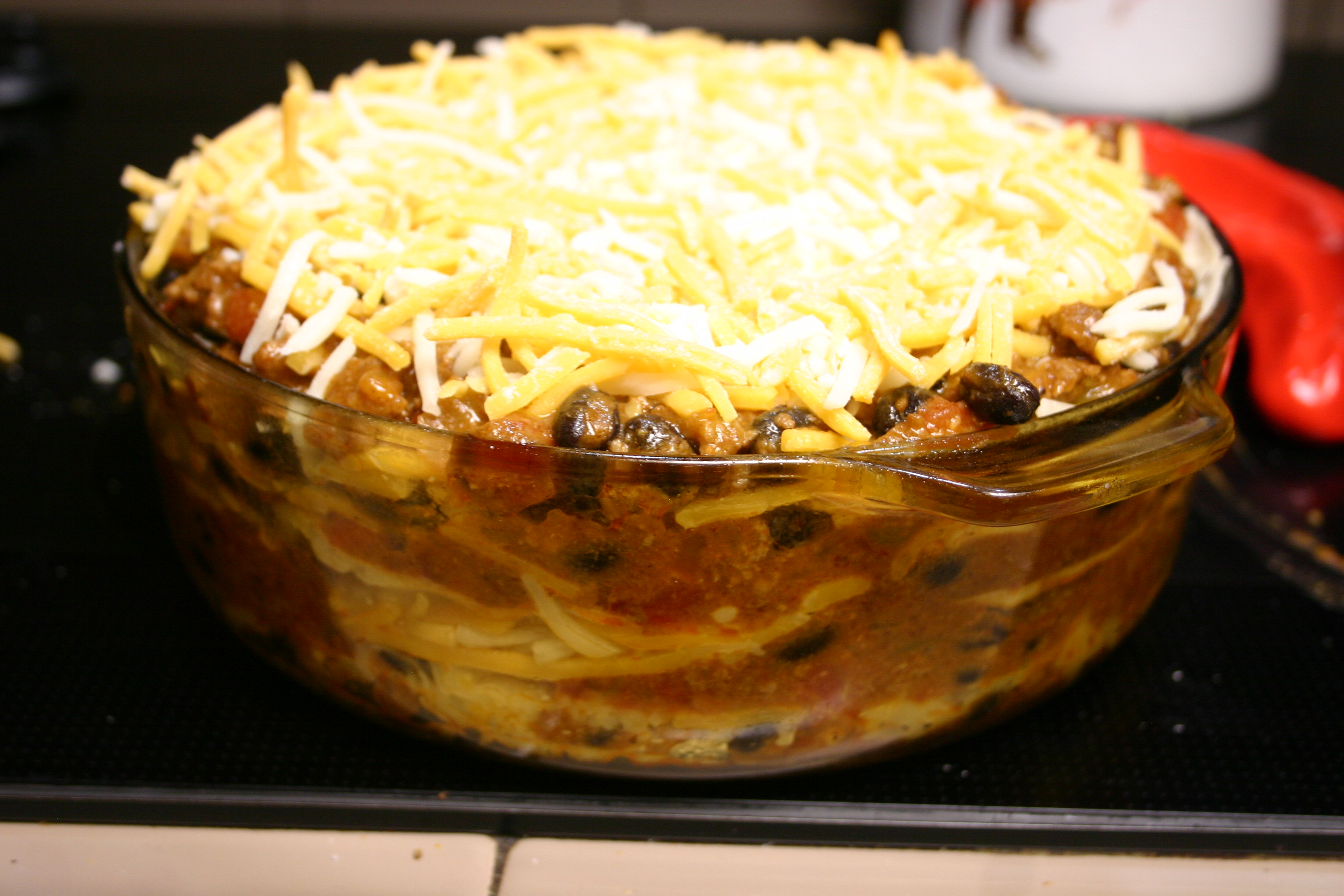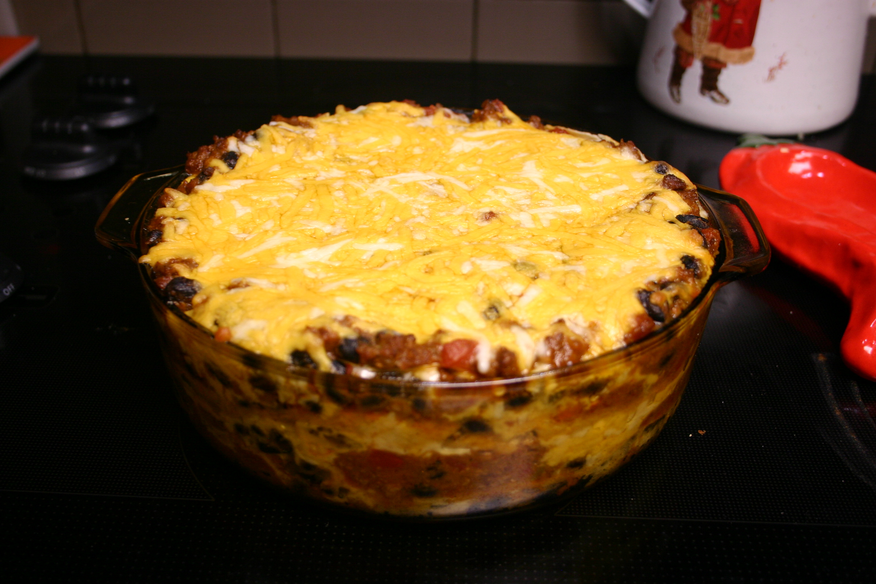 Place a tortilla in the bottom of the prepared dish. Cover tortilla with a think even lay of meat sauce followed by a layer of cheese. Repeat tortilla, meat, cheese until the casserole dish if full, ending with the meat and cheese layers.