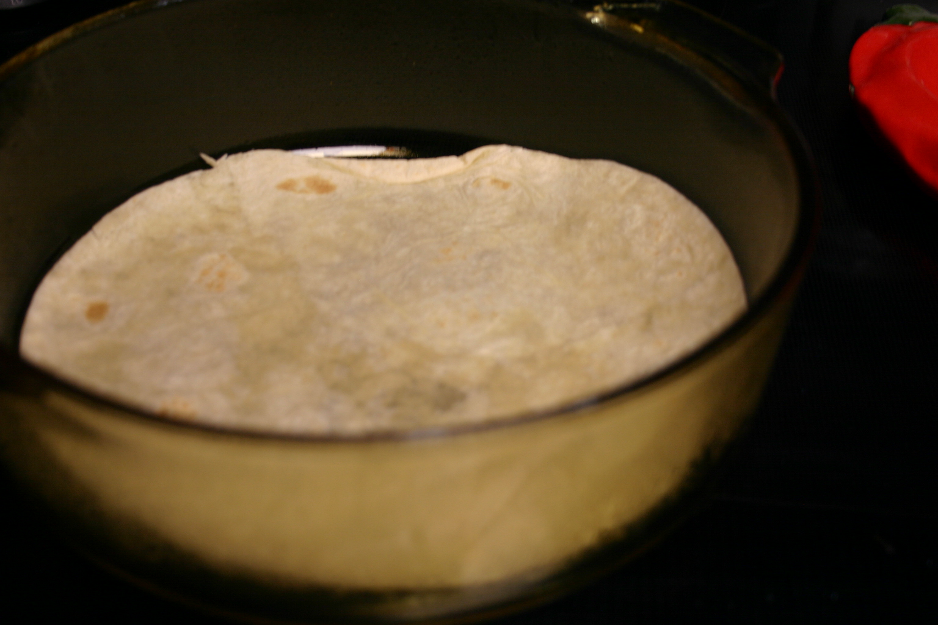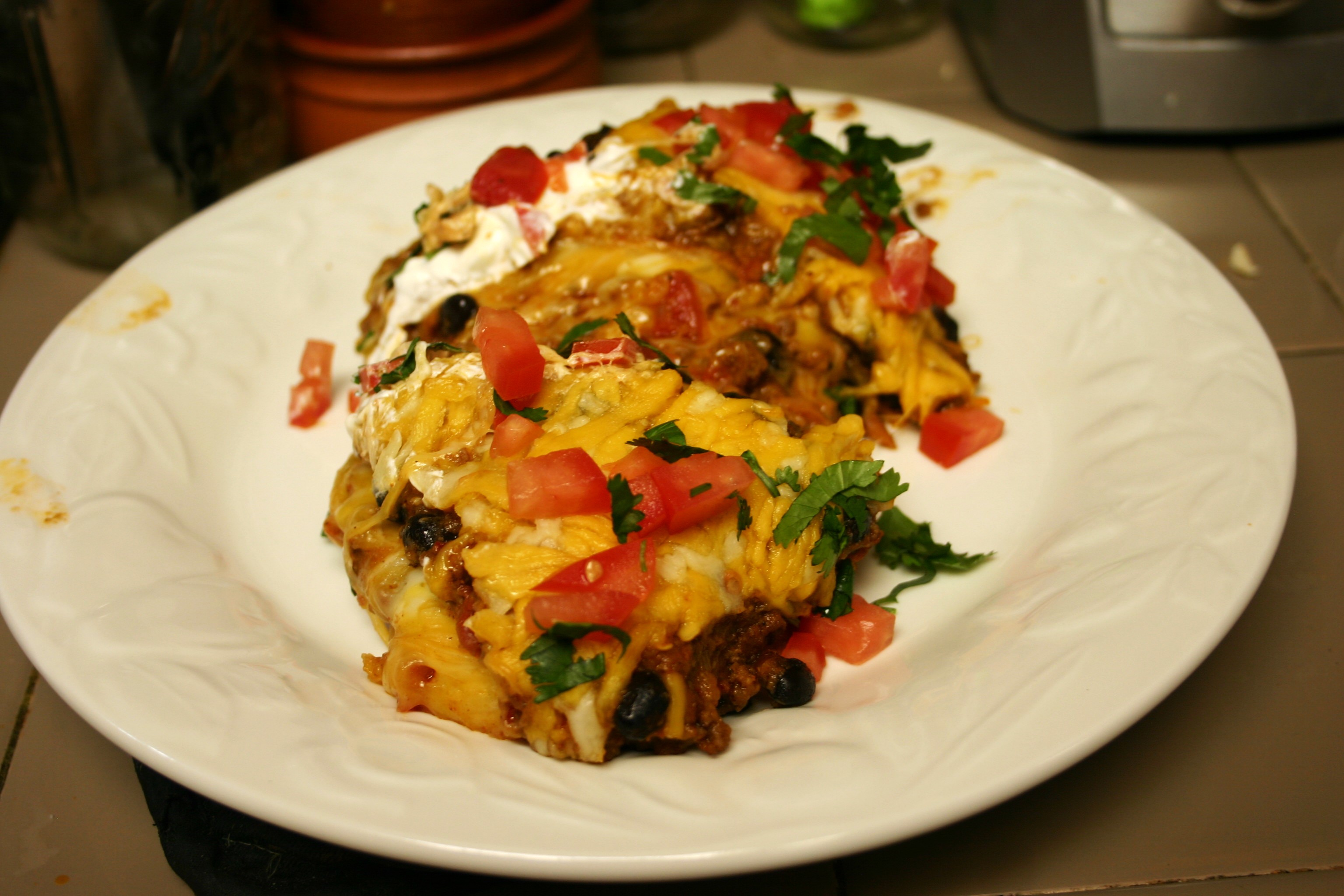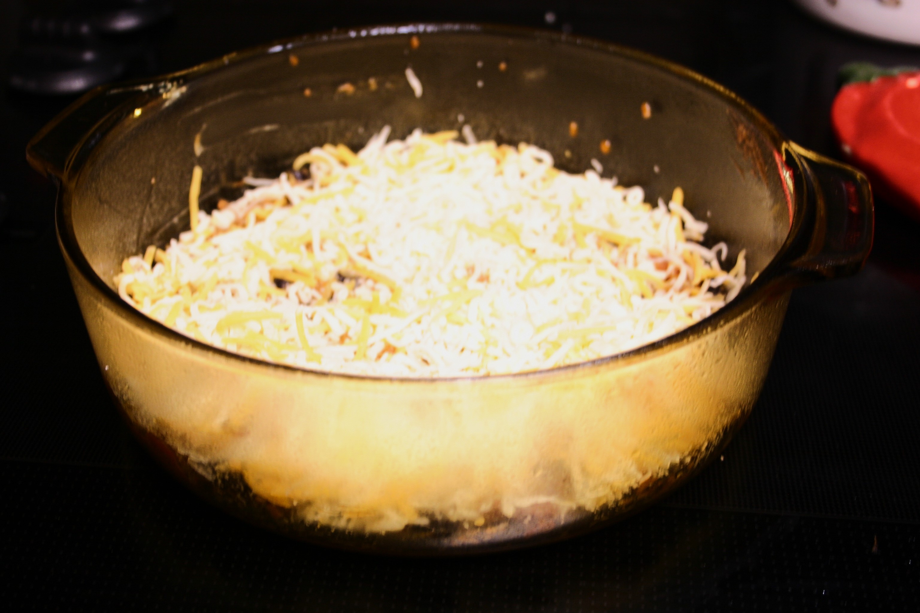Place a tortilla in the bottom of the prepared dish. Cover tortilla with a think even lay of meat sauce followed by a layer of cheese. Repeat tortilla, meat, cheese until the casserole dish if full, ending with the meat and cheese layers.