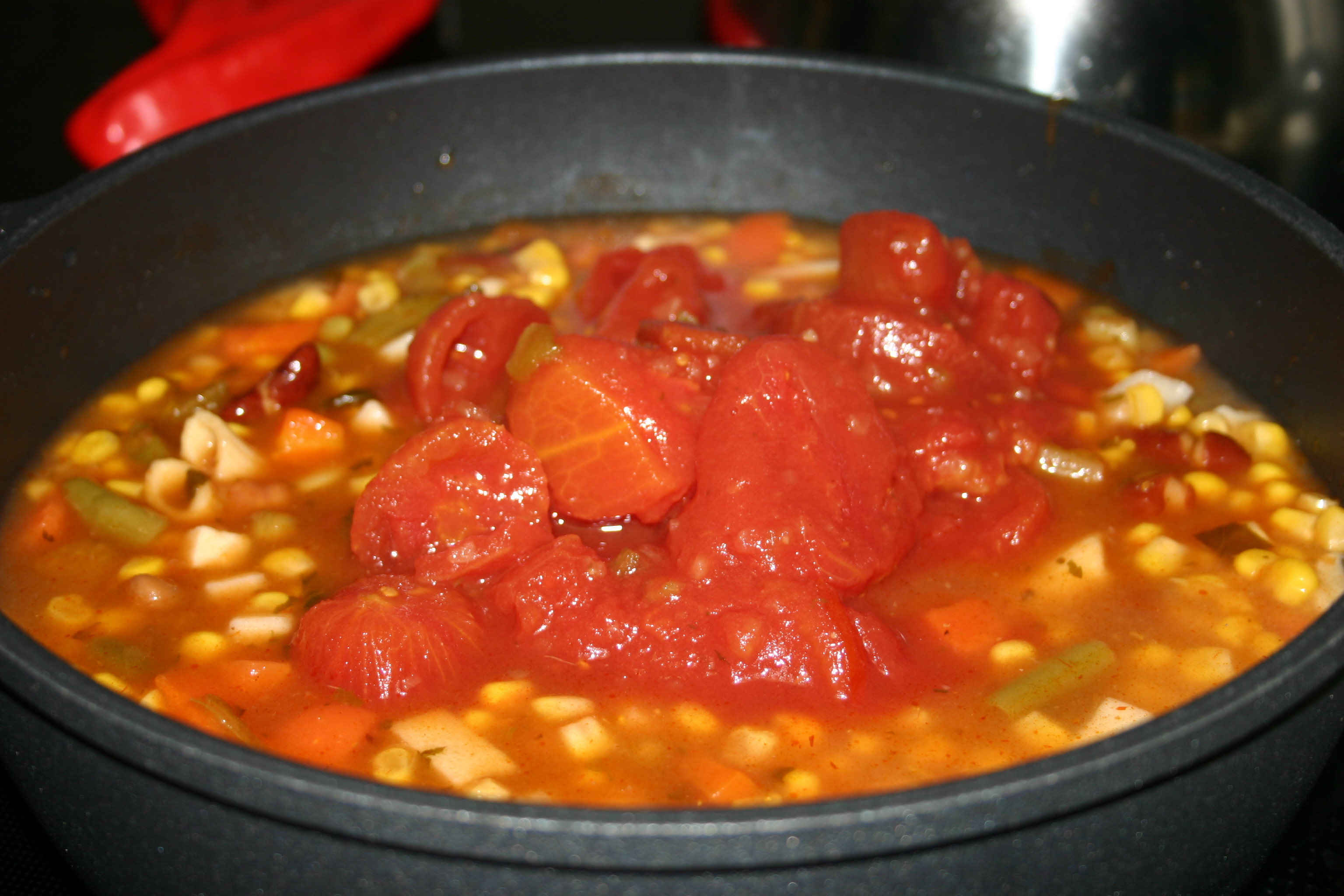 Dump the mixed vegetables into a pot. Drain the corn, dump into the pot with the mixed vegetables. Dump the Minestrone soup and the diced tomatoes into the pot.