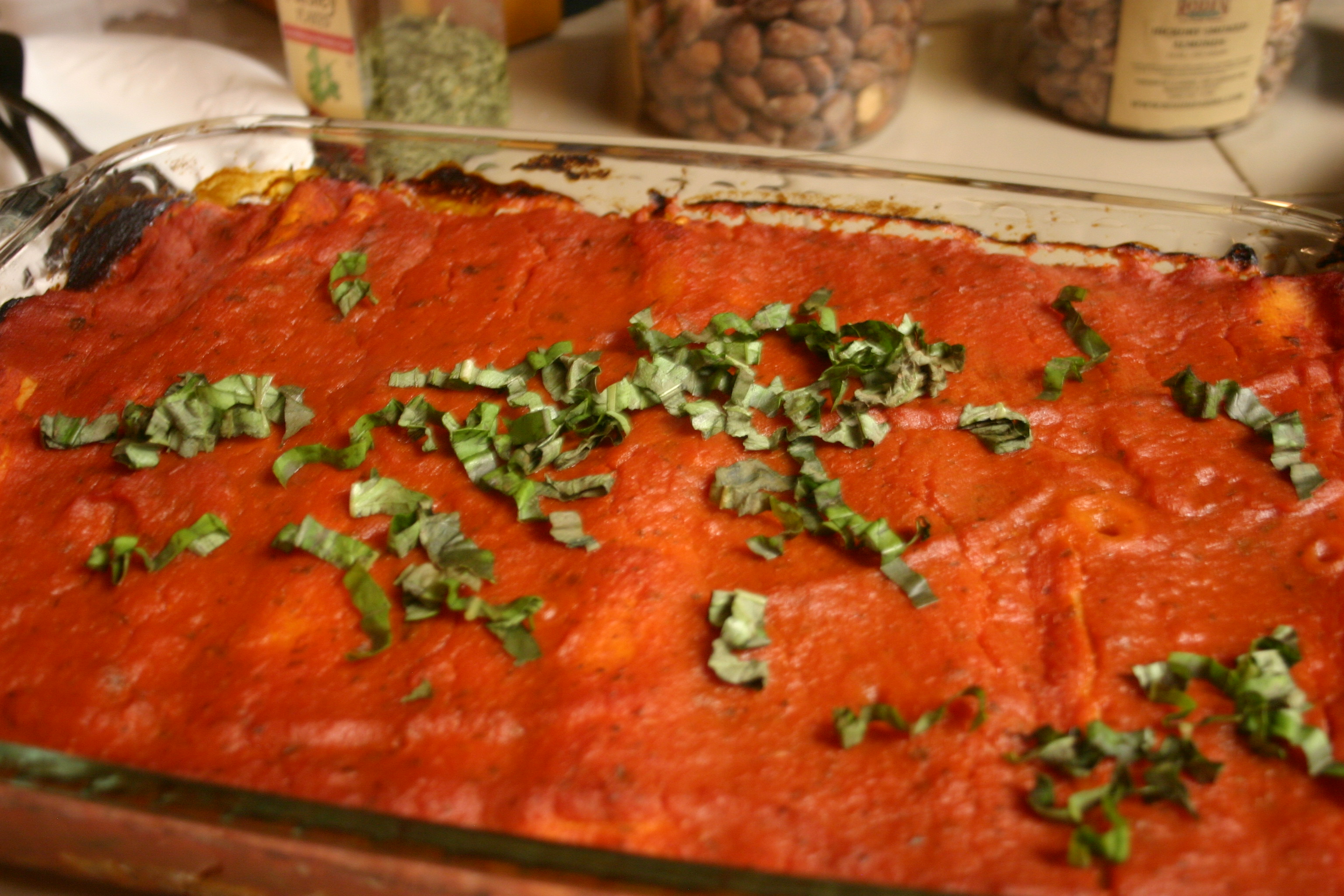 Cover, bake in the heated oven for 35 minutes. Remove from oven, sprinkle with Romano Cheese and basil as a garnish just before serving.