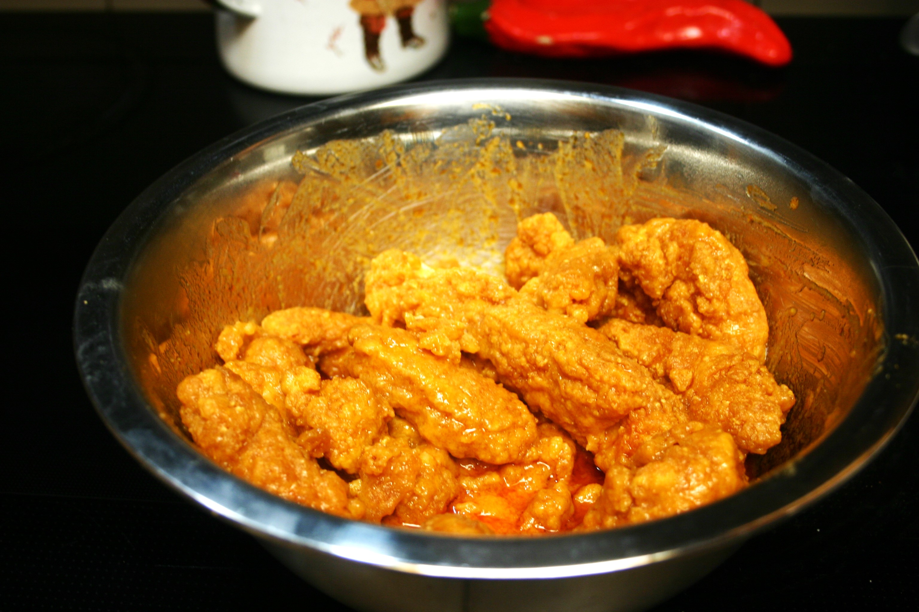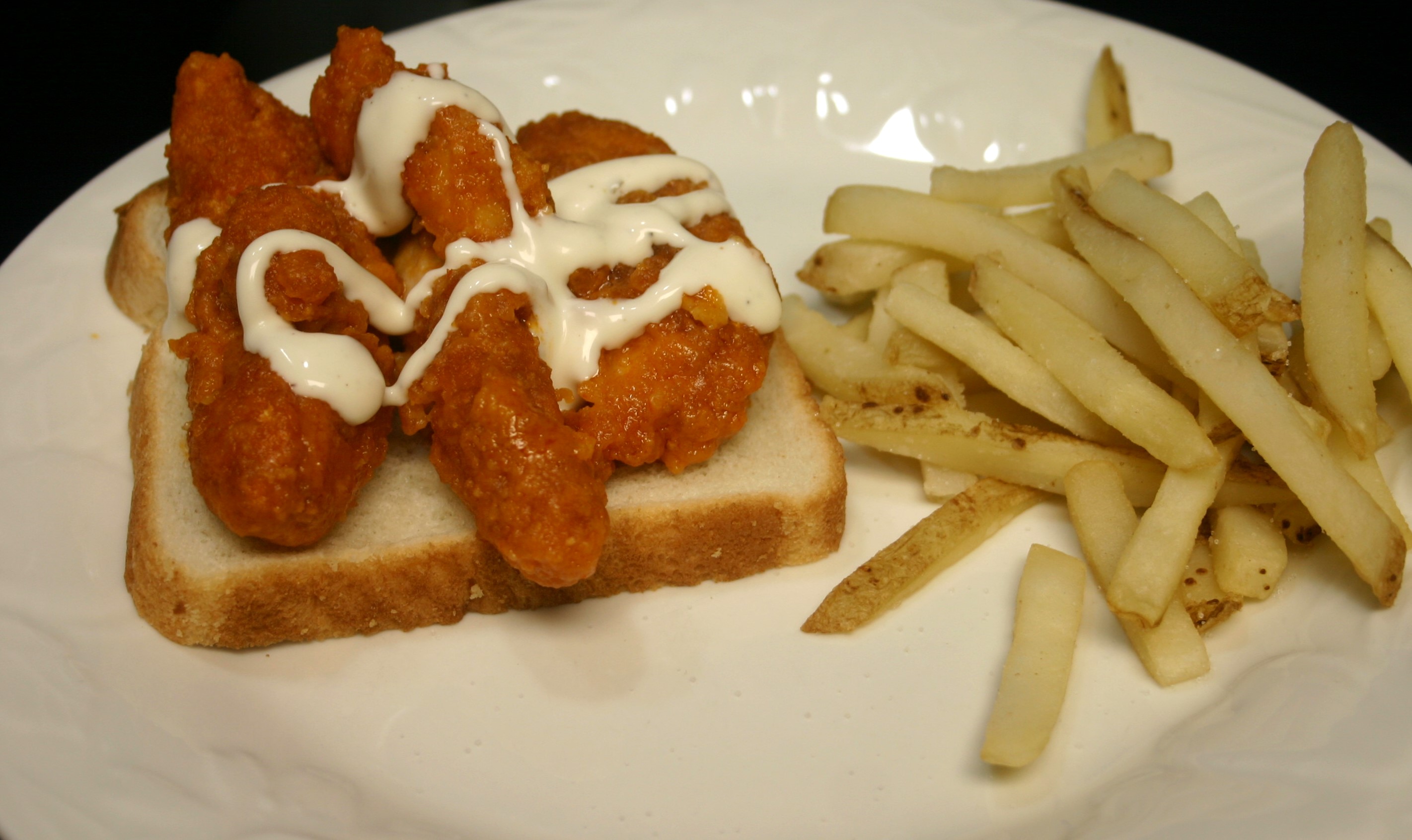 Empty chicken strips into a large mixing bowl. Pour Hot Sauce over chicken, toss gently to coat. Transfer chicken strips to a serving platter. Serve on a slice of bread with a drizzle of Ranch Dressing. Don’t forget the fires!