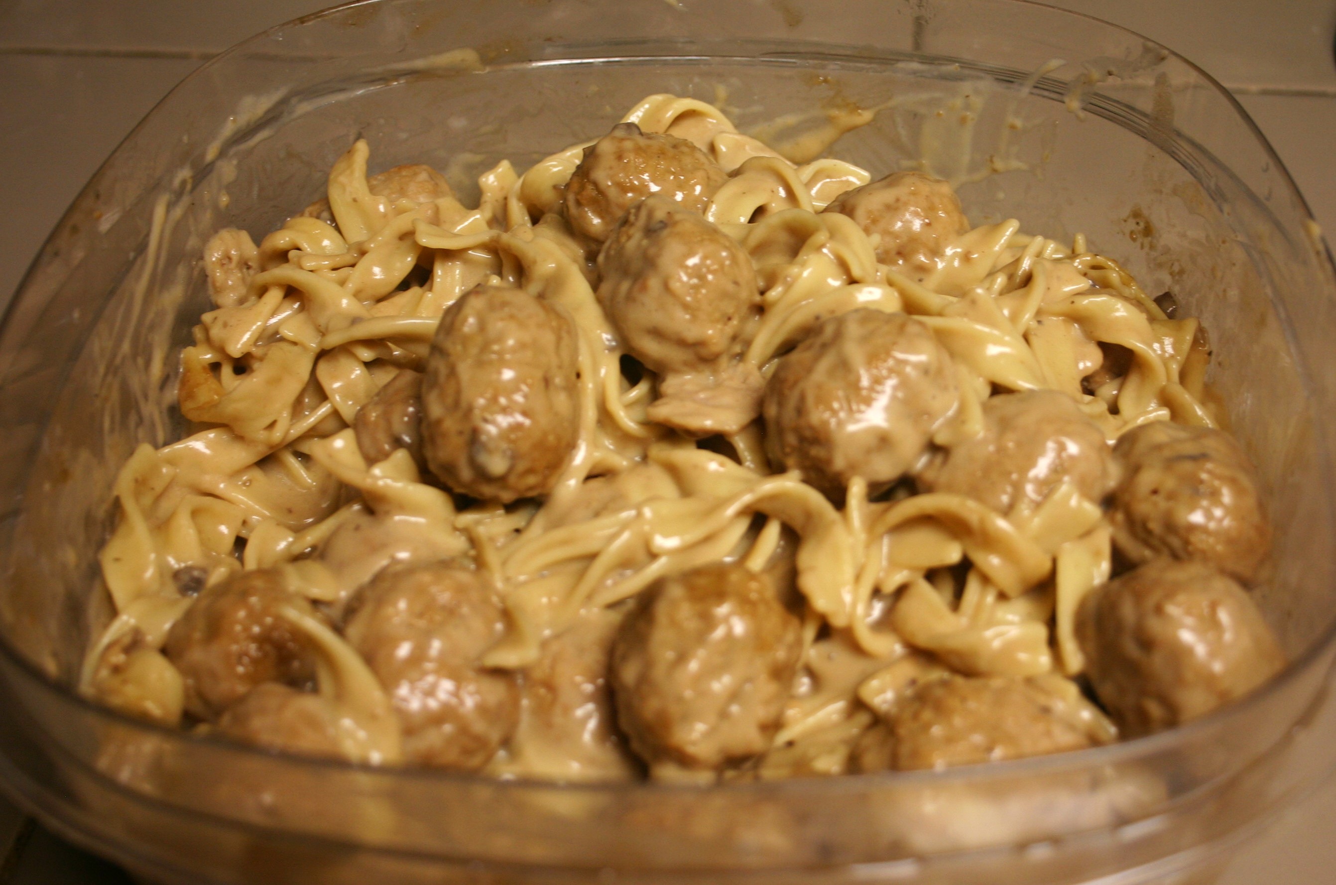 When the meatballs are nearly done, prepare egg noodles as directed on the package. Drain noodles and keep warm.