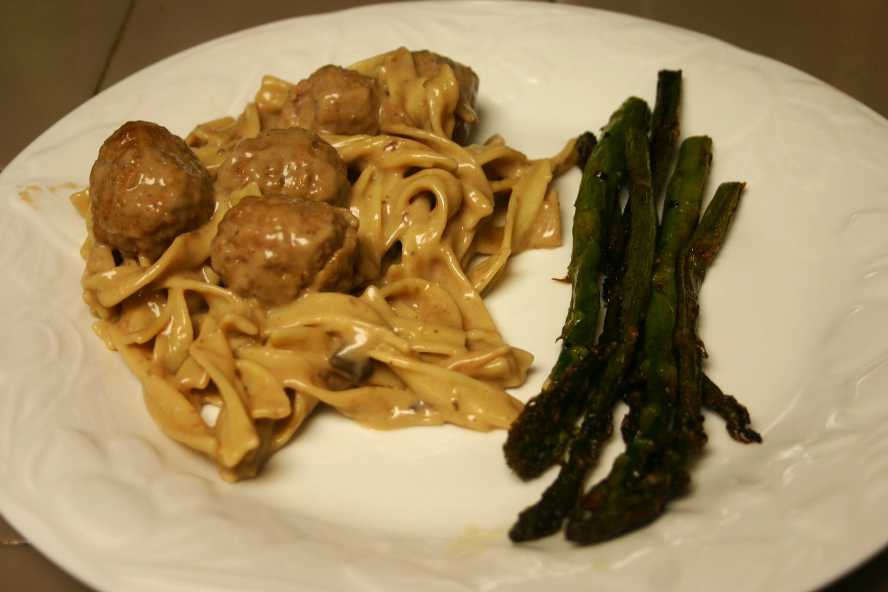 Mix noodles and meatballs together, pulling noodles through sauce to coat well. Serve with Asparagus or other desired vegetable and enjoy.