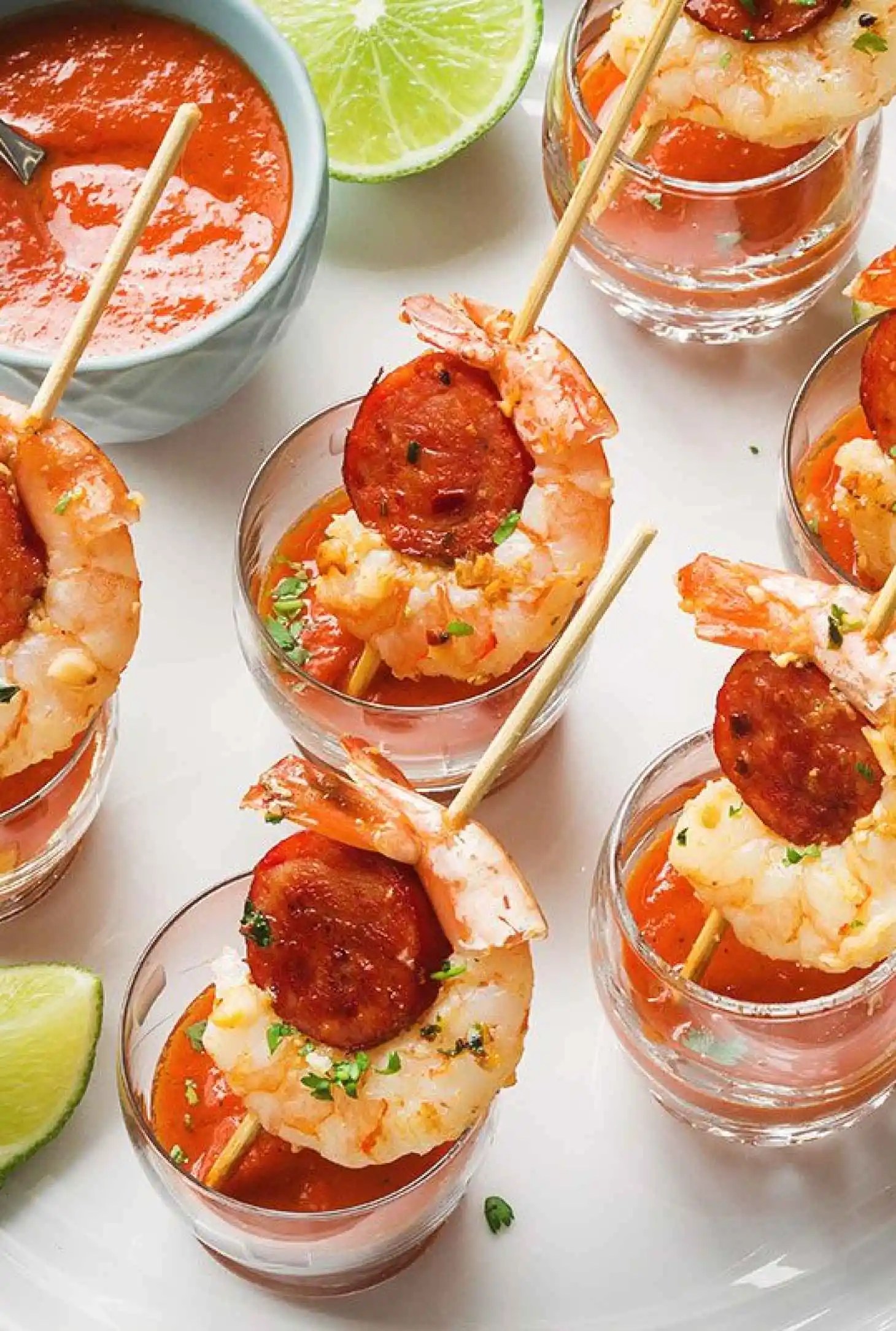 Place about a tablespoon or so of spicy cocktail sauce into the bottom of each shooter glass. Sprinkle with just a pinch of minced cilantro. Place a slice of sausage into the curve of the shrimp. Skewer shrimp and sausage together with a cocktail skewer. Balance each skewer on the rim of the shooter glass. Serve with lime wedges for extra flavor.