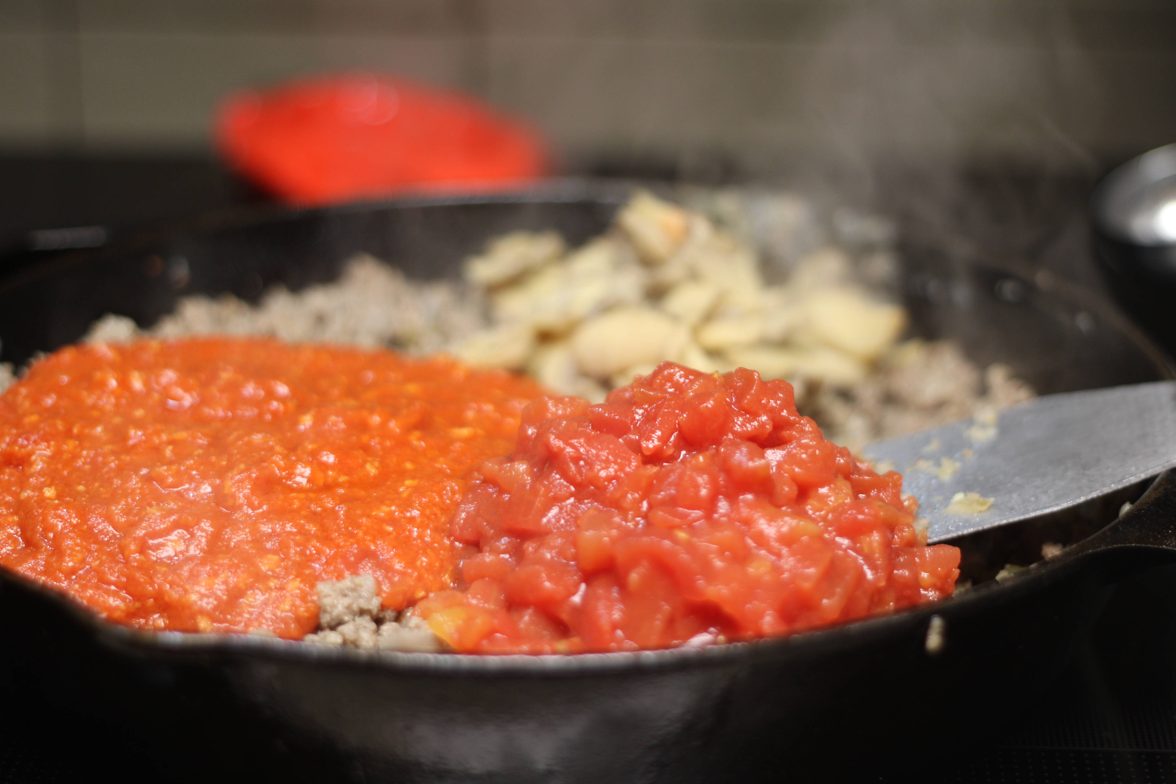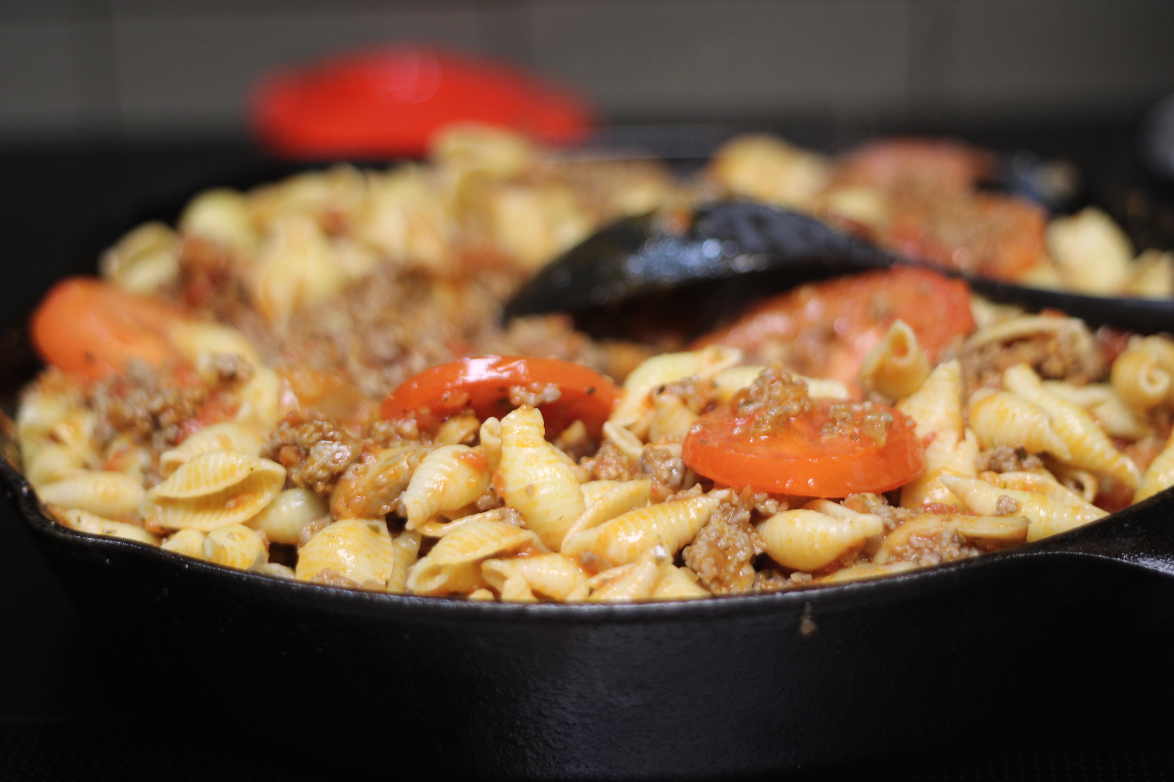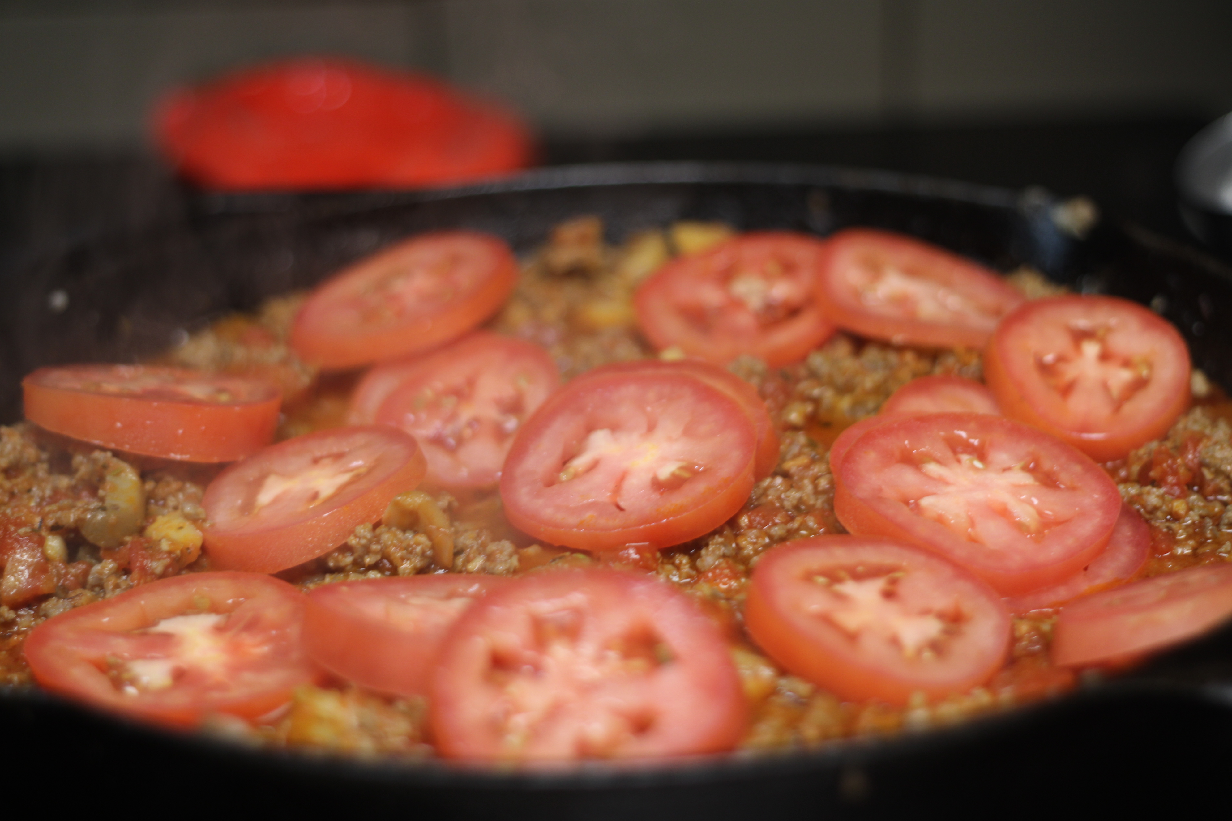 Add pasta to the meat sauce; gently stir in the sliced fresh tomatoes. Transfer to a large casserole dish. Spread out and set aside.