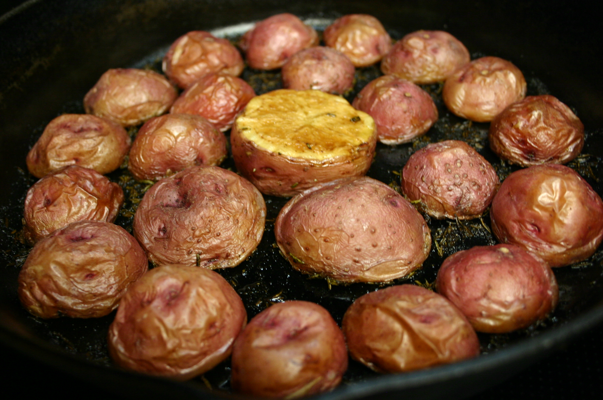 Scrub potatoes, cut i half. Arrange potatoes, cut side down, over the rosemary in the skillet.