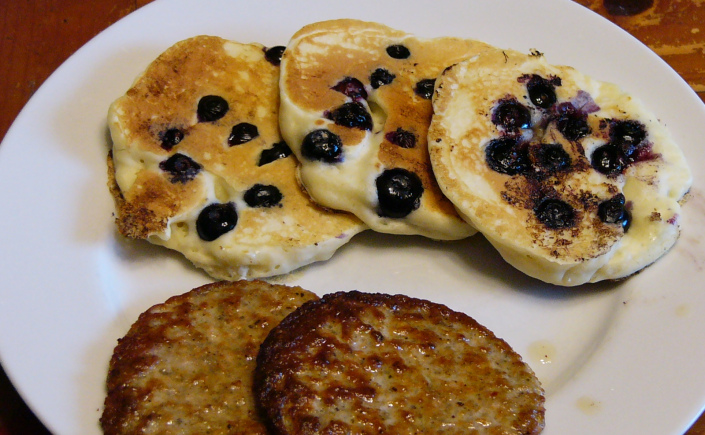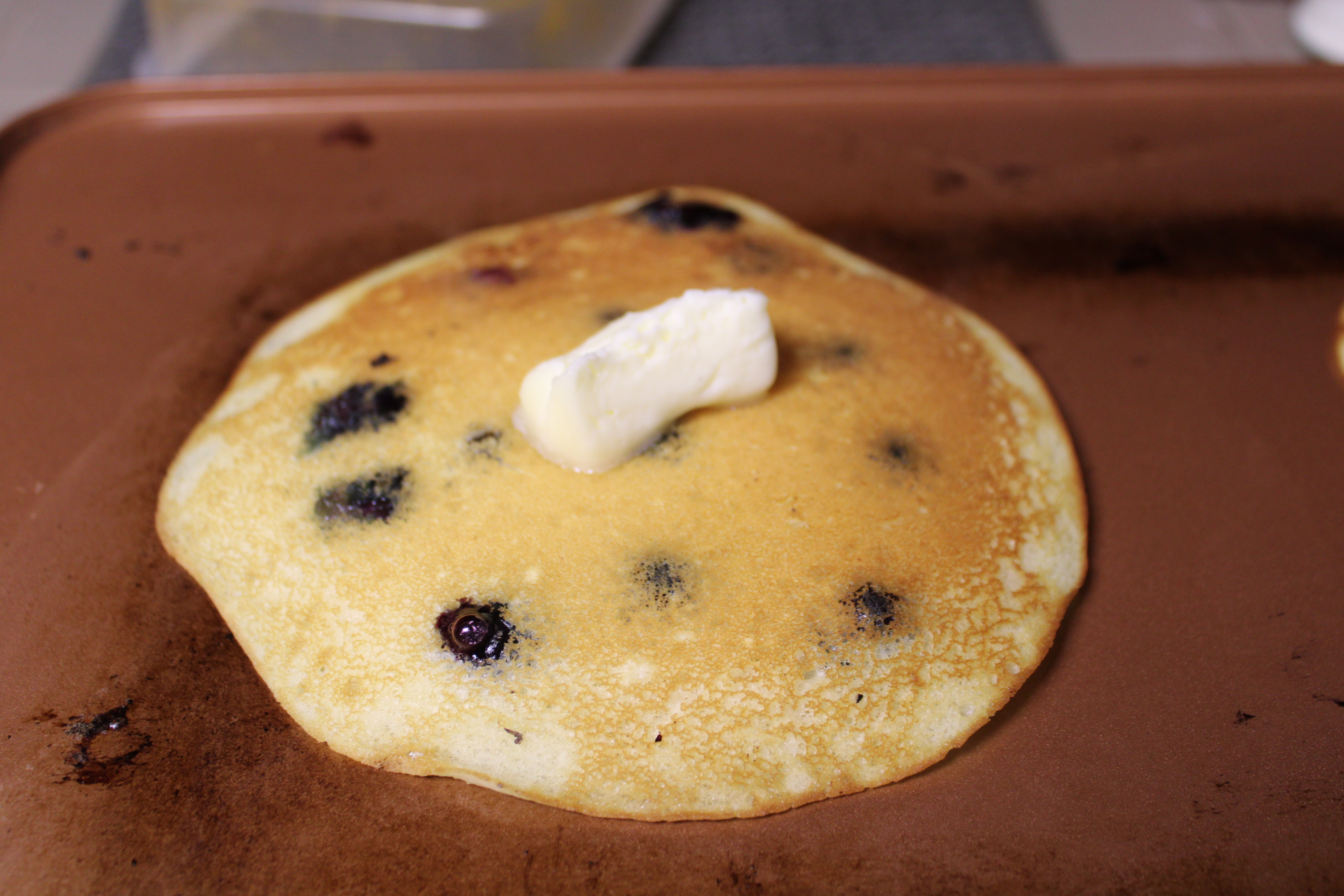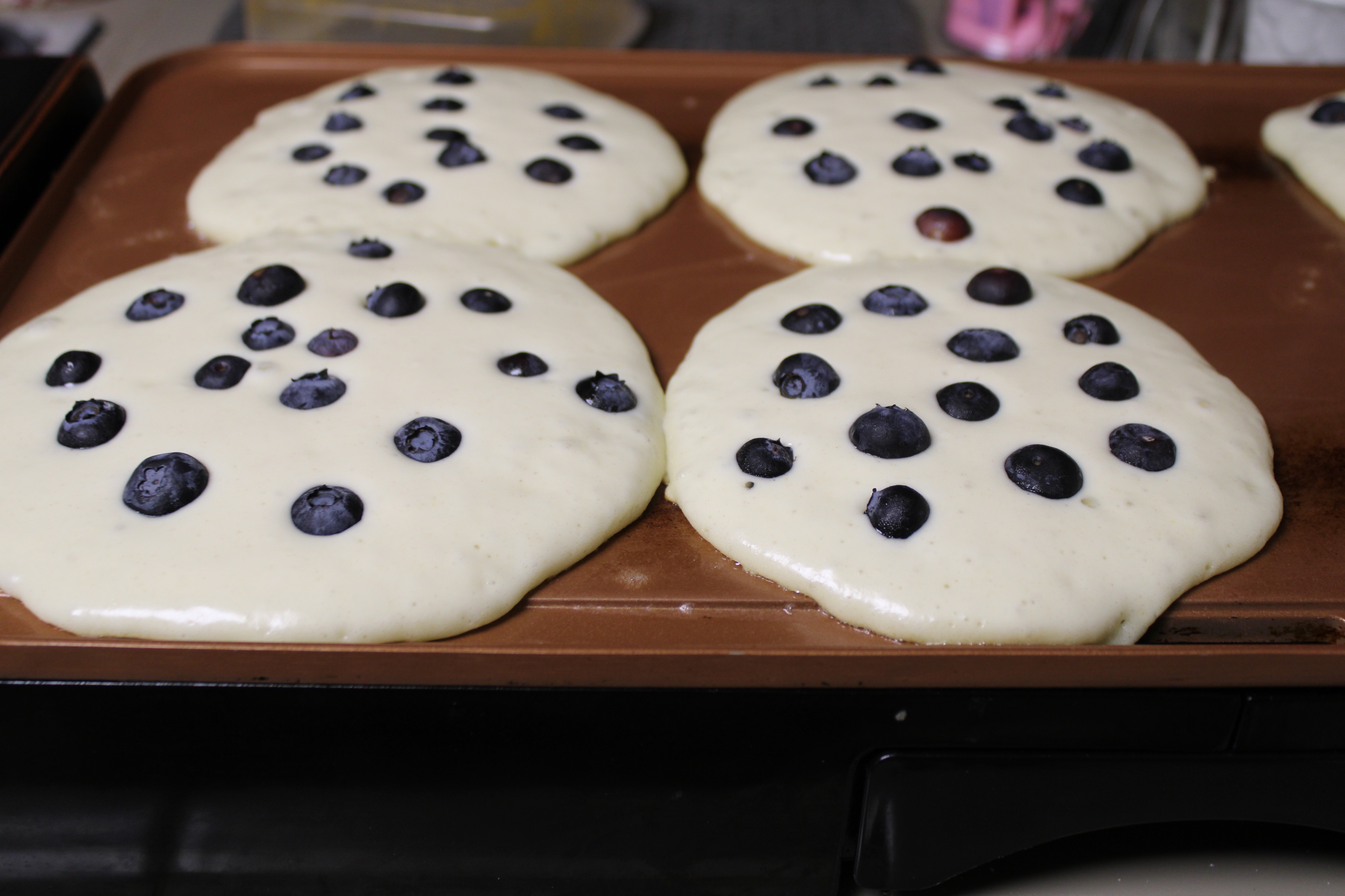 Ladle the batter onto the griddle, forming 5-inch circles. Scatter blueberries by the handsful over the pancakes. Increase temperature to medium, cook until the edges appear slightly dry and the underside is golden, about 2 or 3 minutes. Flip pancakes, continue to cook another 2 minutes or until golden. Repeat until all the batter is used.