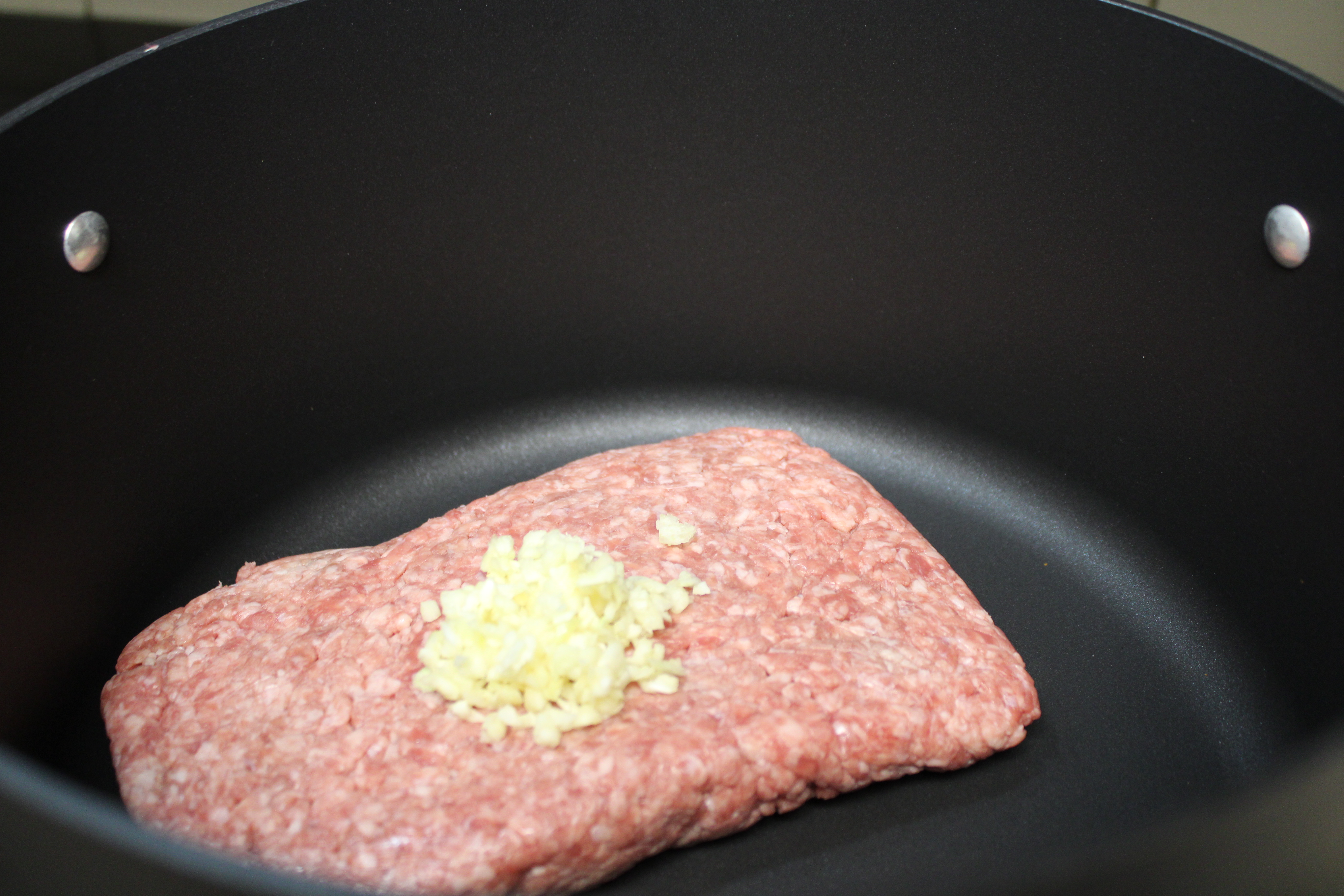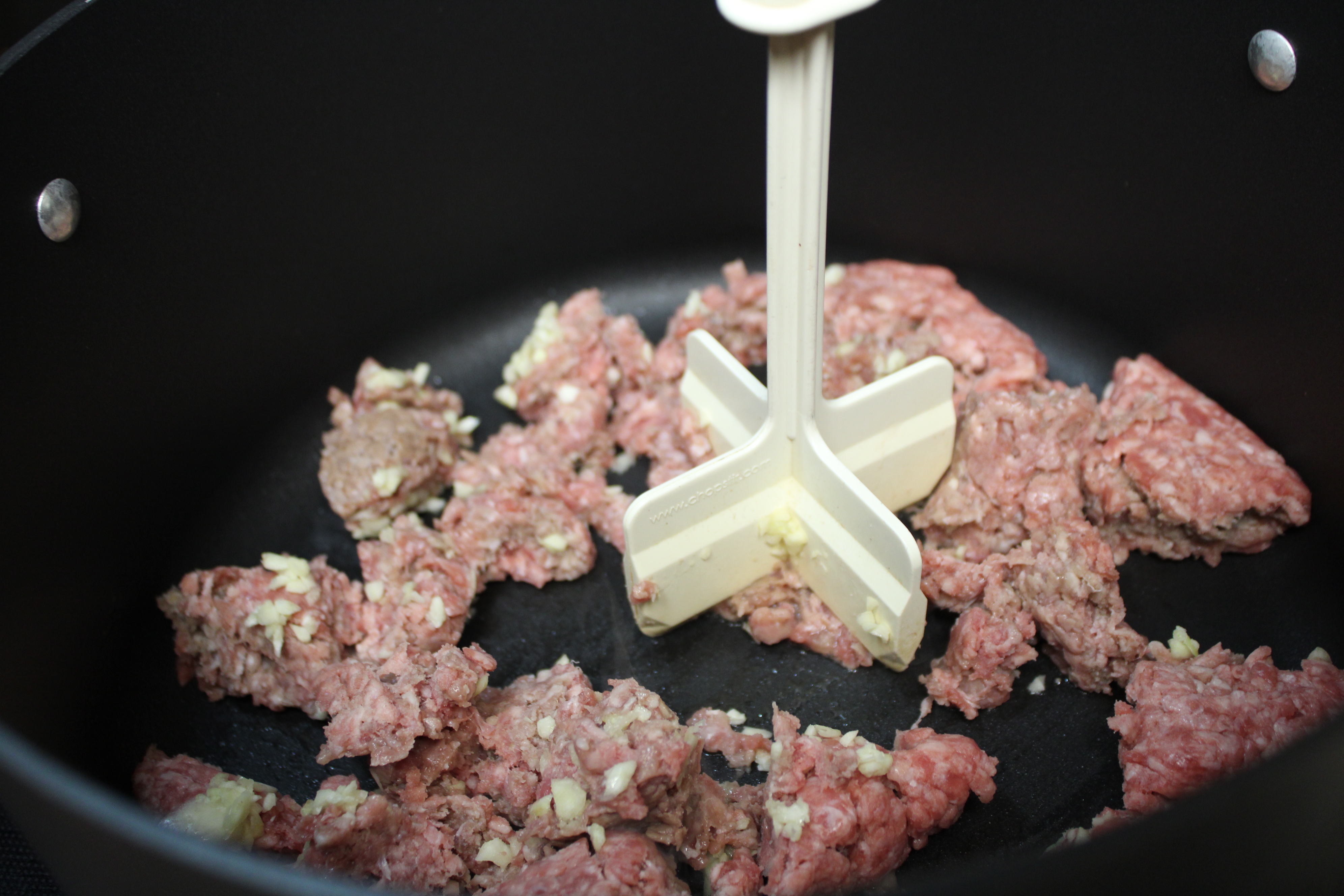 In a 6-quart stockpot, cook ground beef with garlic over medium heat until beef is not longer pink, about 7 minutes or so, crumbling beef as it cooks. Drain excess grease from the pot. Stir in beef stock, tomatoes and seasonings; bring to a boil.