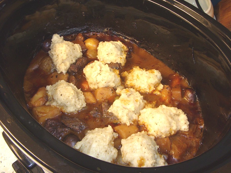 Drop the dumplings by spoonfuls onto the simmering stew. Cover the crock pot and cook on high for 1 hour or until the dumplings are cooked.