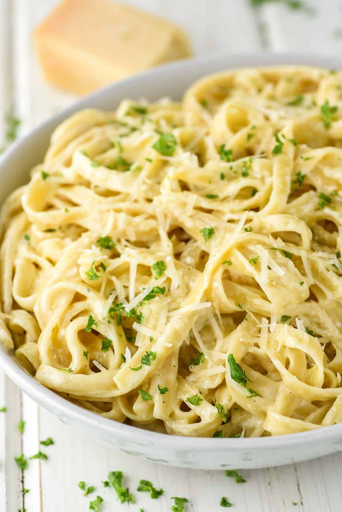 Transfer Fettuccine Alfredo to large bowl, garnish with chopped parsley and additional Parmesan Cheese as desired. Serve and enjoy.