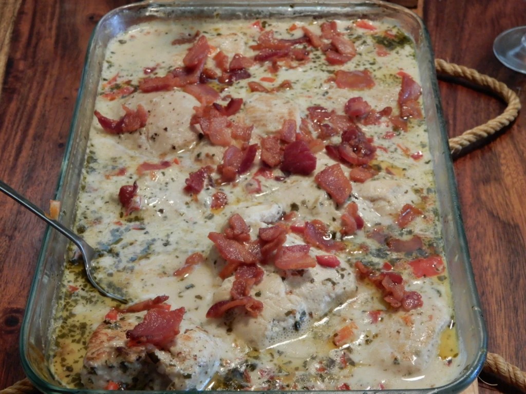 Bake in the heated oven for 30 to 35 minutes or until mixture is bubbly and juice of the chicken is clear when center of thickest part is cut (at least 165-degrees). Remove from oven. Sprinkle chicken with chopped bacon.