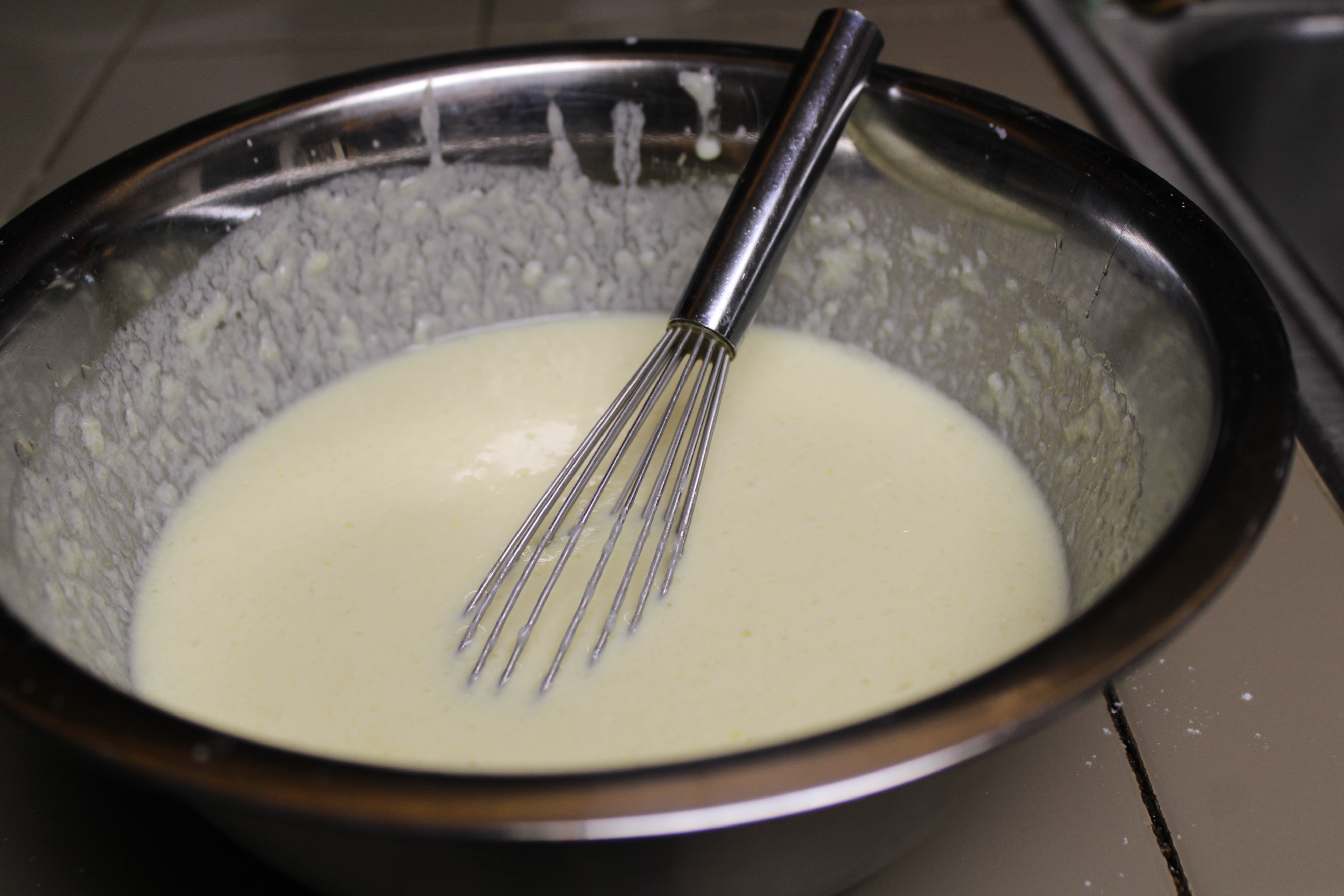 In a large mixing bowl, whisk together all the dry ingredients – flour, salt, sugar, baking soda and baking powder.