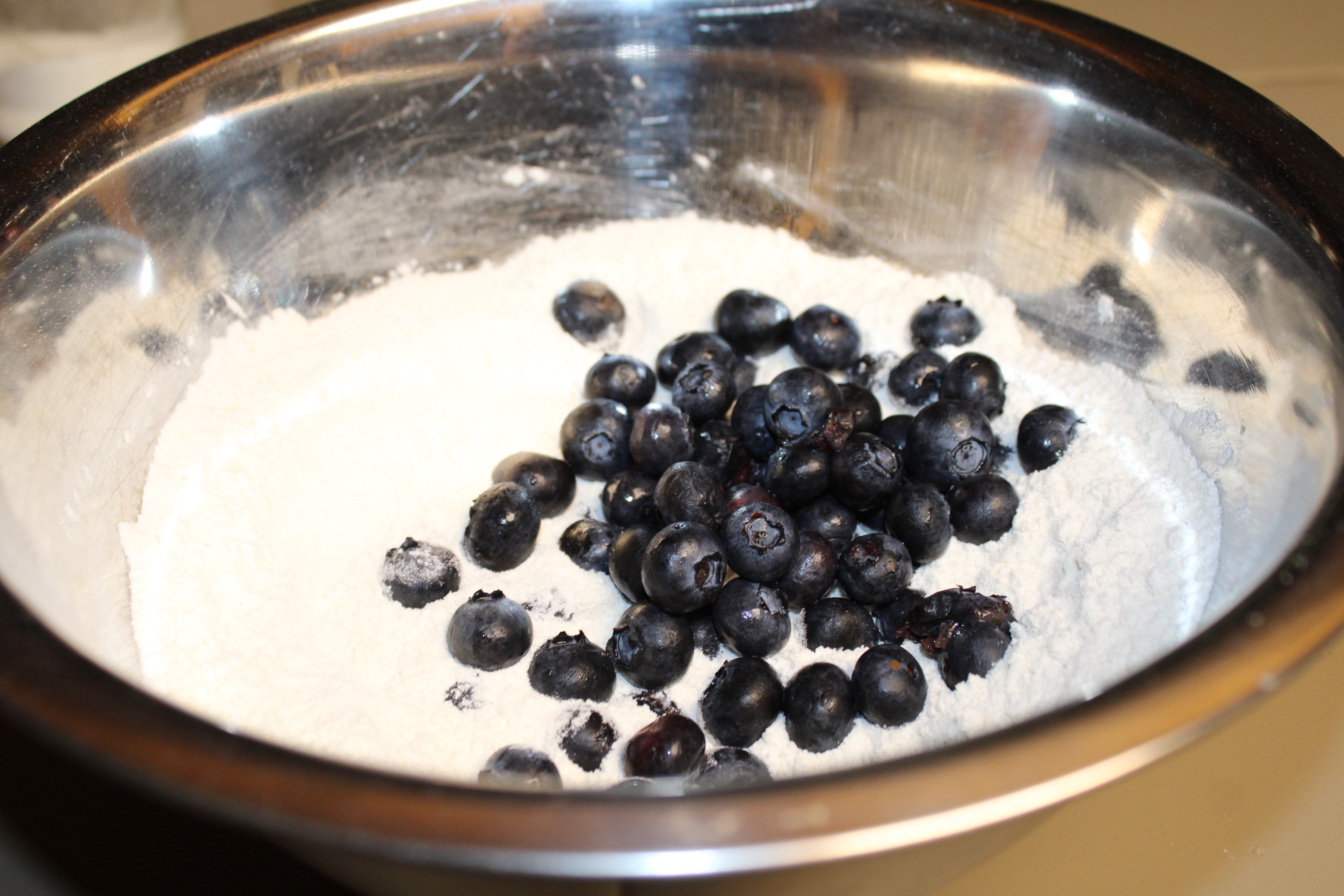 Rinse blueberries, allow berries to drain for a few minutes on paper towels, then toss the blueberries into the flour mixture. Gently fold in the berries until nicely mixed and lightly coated. Set aside.
