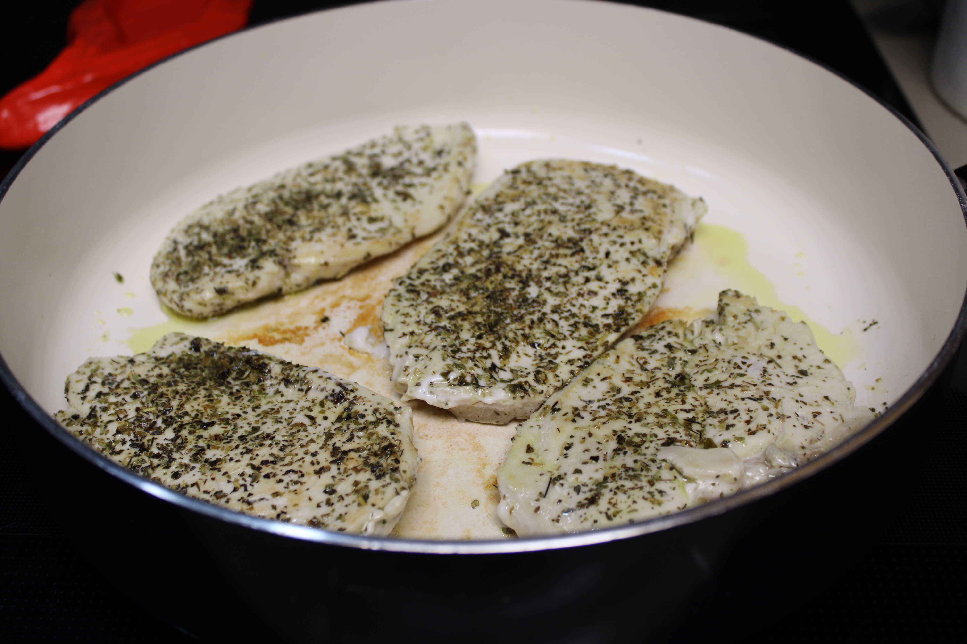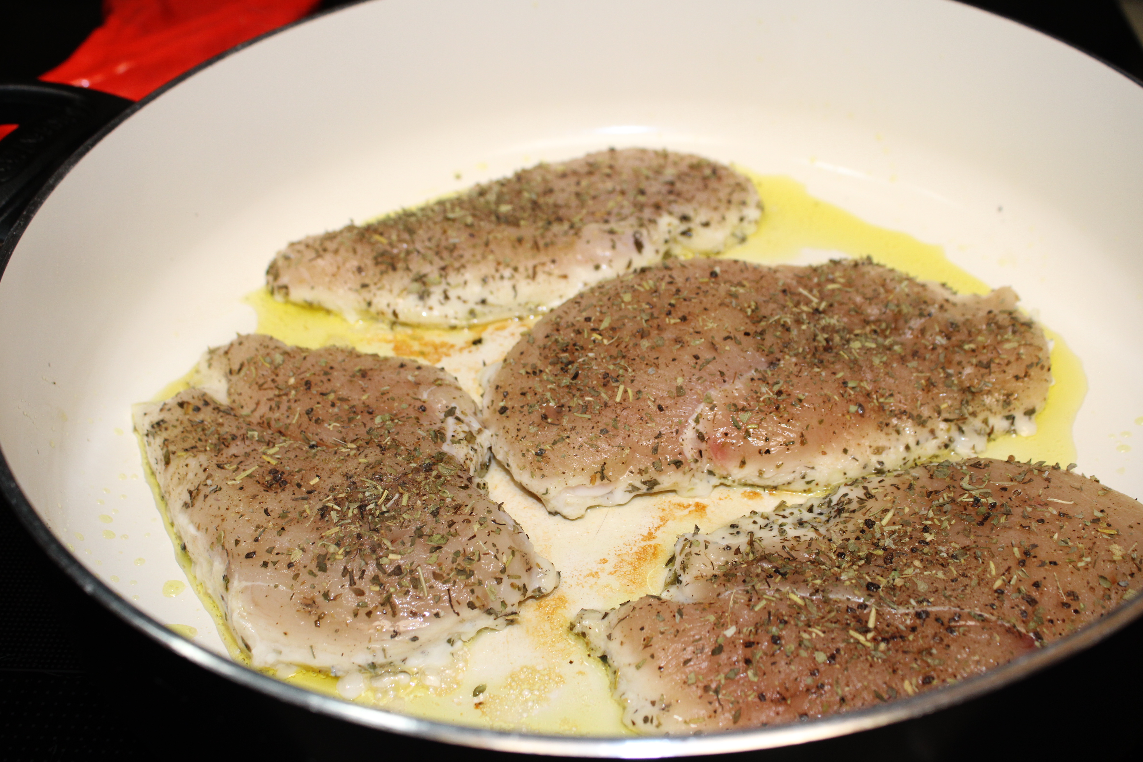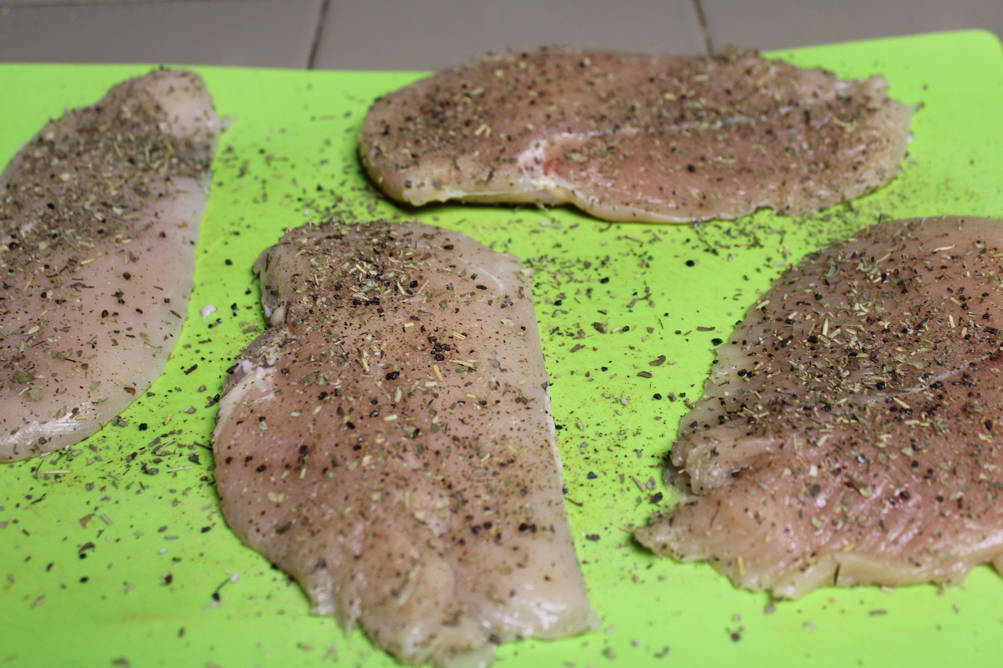Butterfly chicken then separate to create 4 thin breasts. Season chicken with Italian Seasoning, salt and pepper to taste. Set breasts aside.