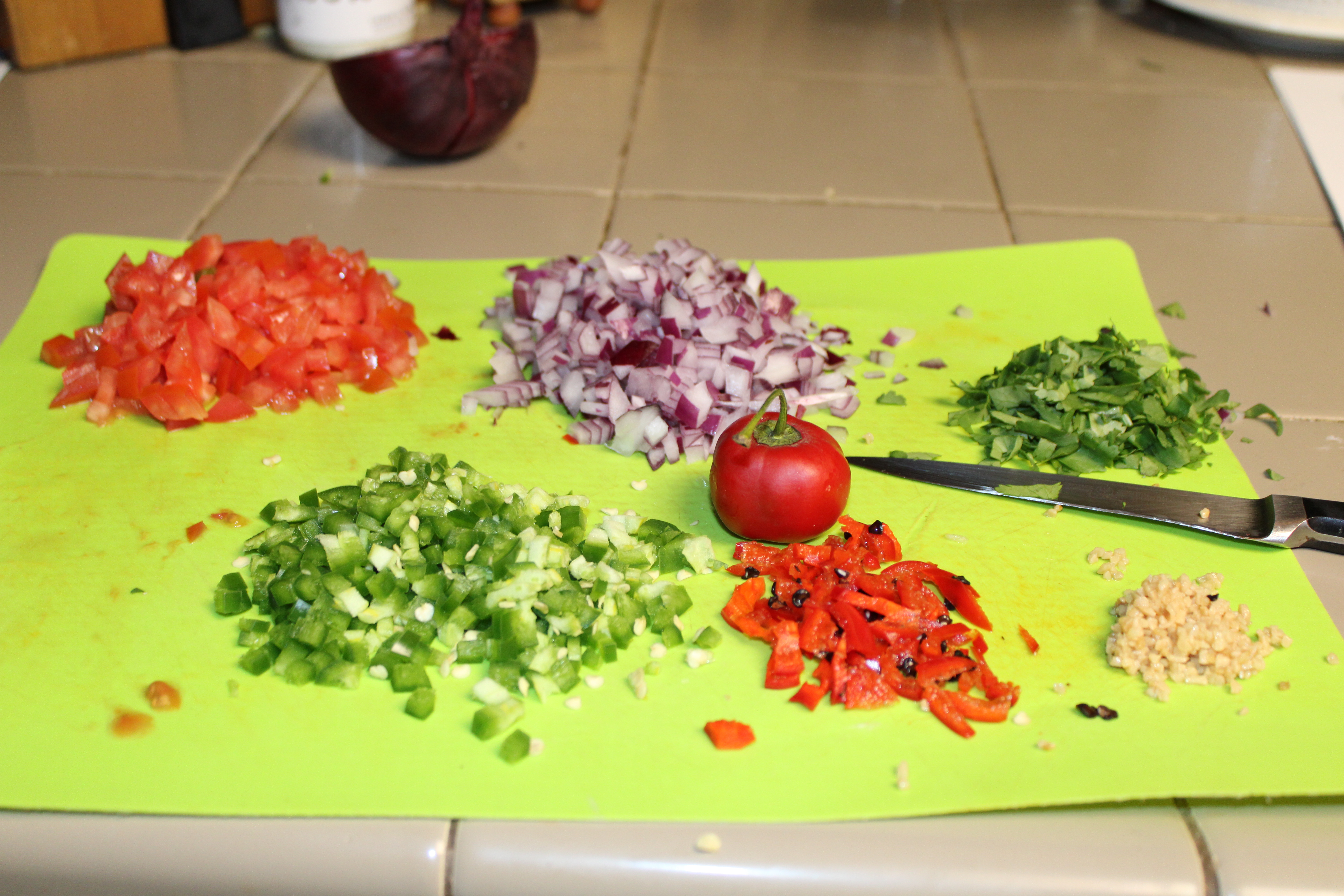 Stem peppers, dice and set aside. Finely dice tomato, set aside. Peel and finely mince onion, set aside. Snip cilantro, set aside. Peel garlic, mince.