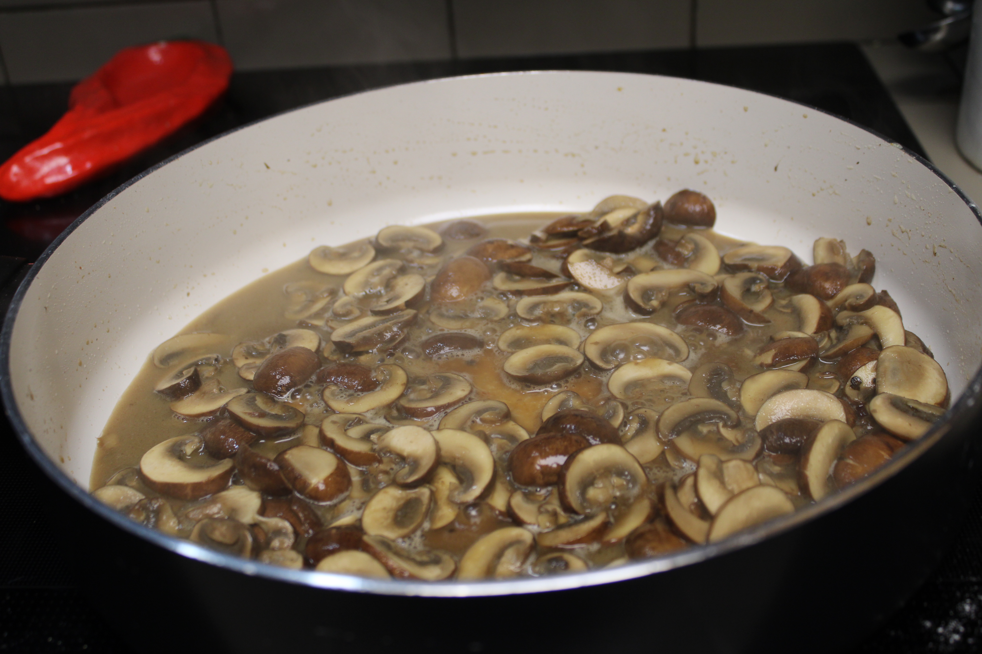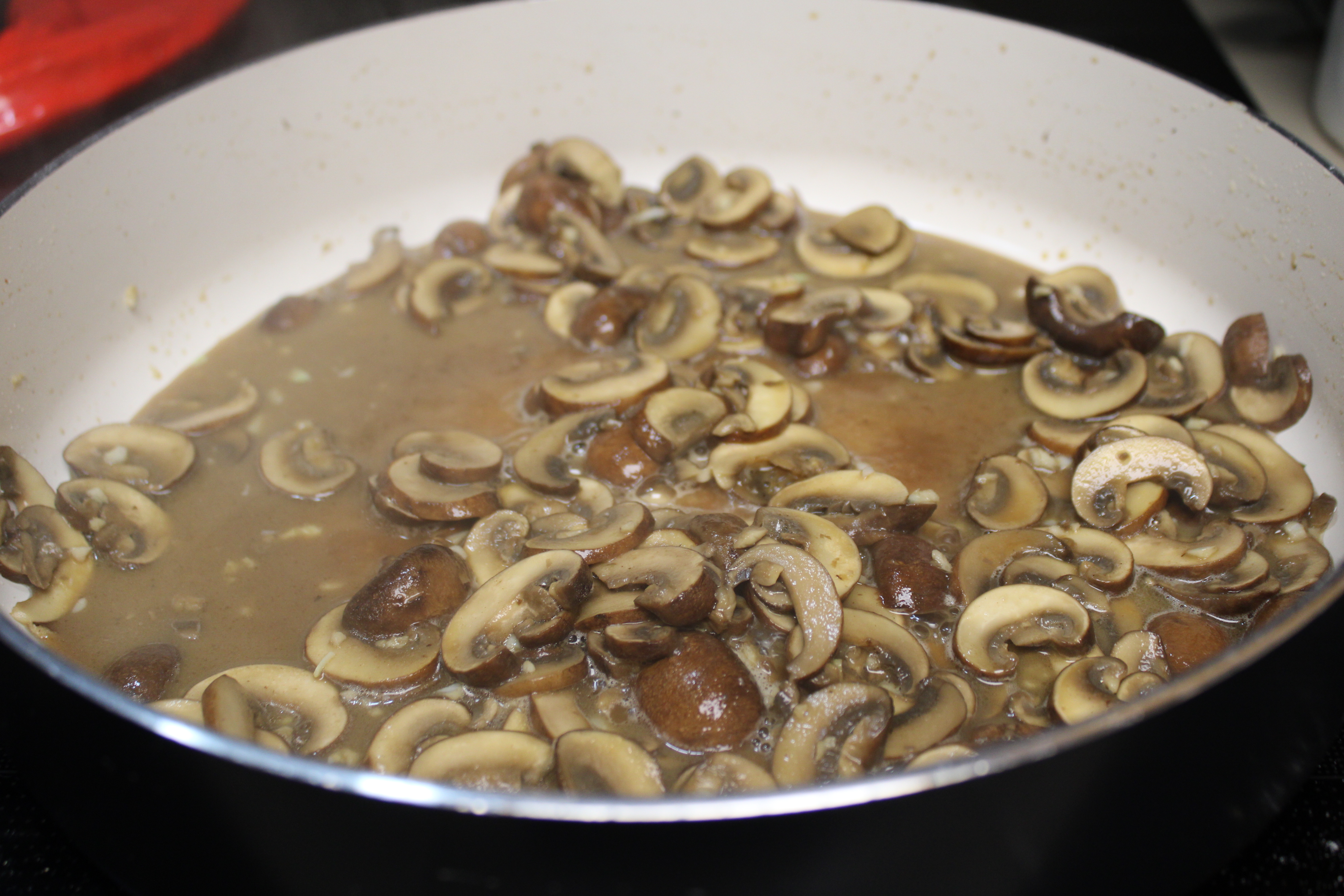 Lower heat to medium and melt the butter into the pan. Add mushrooms, toss in the melted butter. Cook mushrooms for about 3 minutes until warmed through but not yet completely tender. Deglaze the pan with Marsala wine, scraping up the browned bits at the bottom of the pan. Add garlic, cook for about 3 minutes longer.