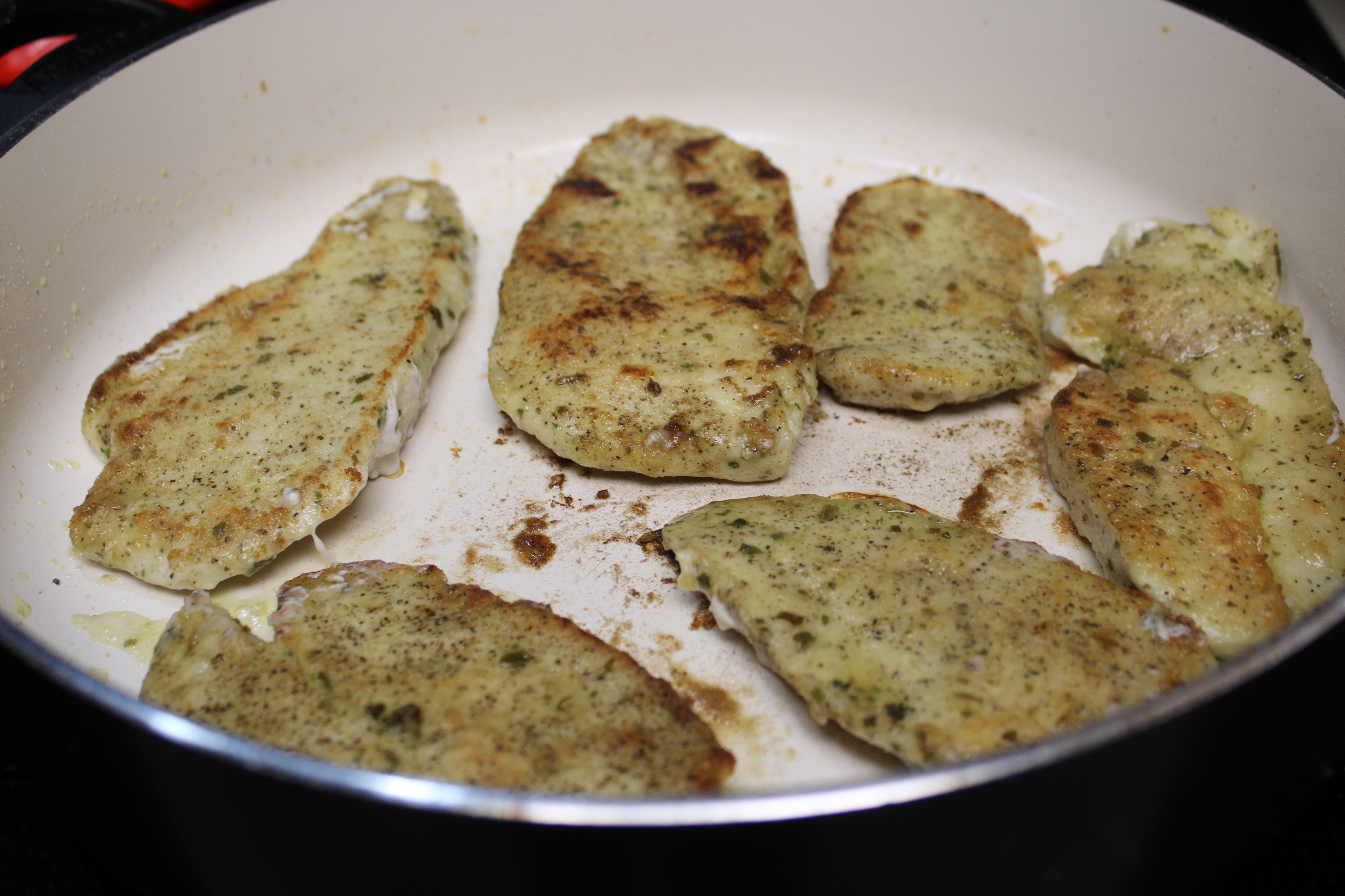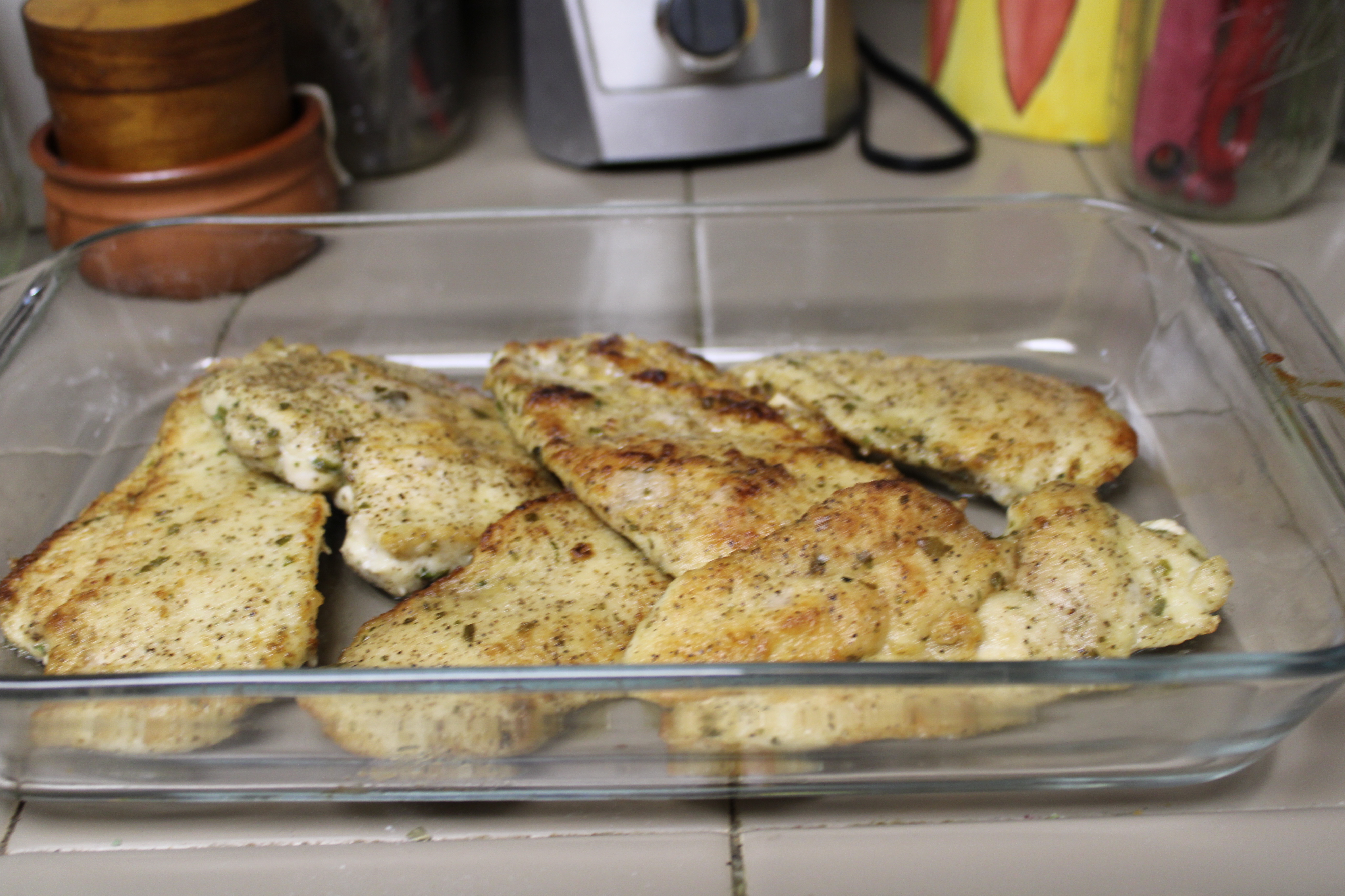 In a large skillet warm olive oil over medium-high heat. Once the oil is shimmering, cook the chicken until cooked through, about 4 minutes per side. Remove breasts from the pan. Place in the prepared casserole dish, hold in the oven.