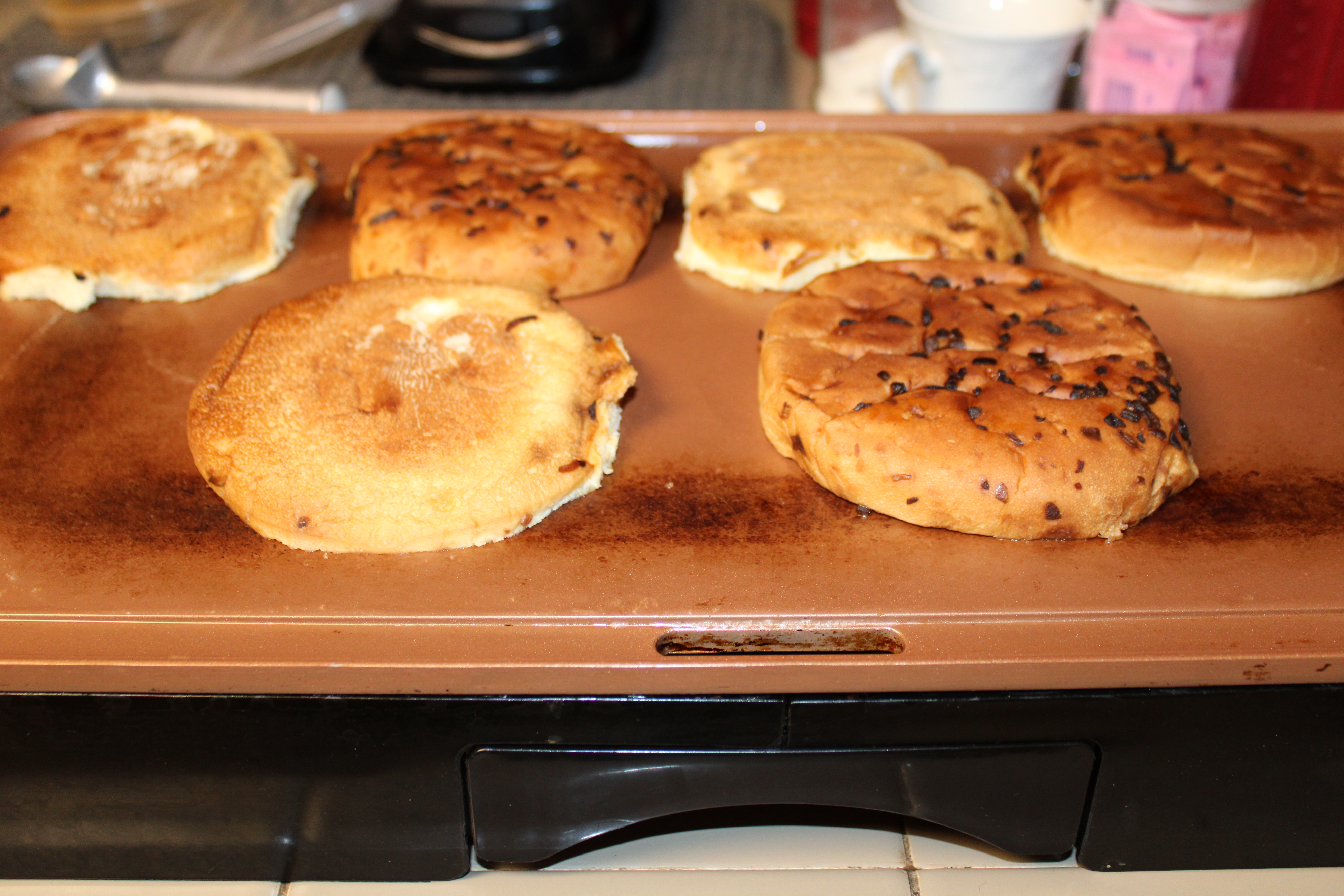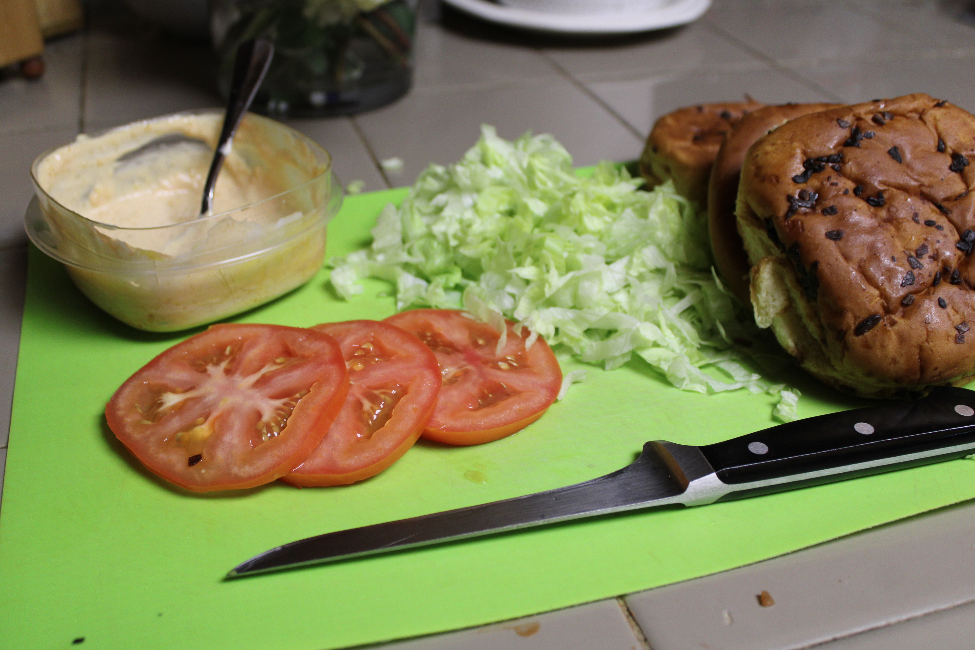 While the patties chill, slice tomato into nice slices. Stack lettuce leaves, roll tight and chiffonade cut to shred. Set aside. Heat griddle to medium heat. Spread a little butter on the skillet. Split buns, toast nicely. Keep buns warm until ready to use.