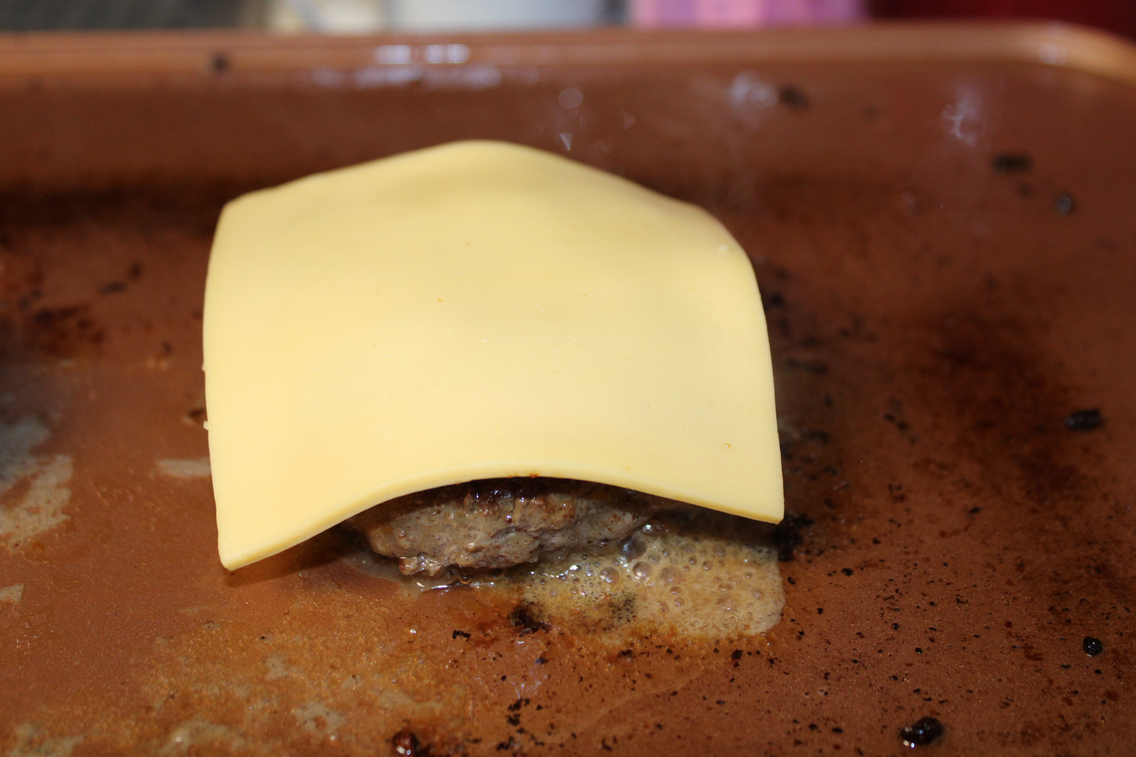 When ready, spread a thin layer of bacon drippings on the hot griddle. Cook hamburgers on the griddle for about 8 minutes or so on one side. Turn burgers, season with salt and pepper. Cover with a domed pan lid to capture steam and continue to cook another 4 minutes or so. If desired, top with sliced cheese and allow cheese to melt over the patty.