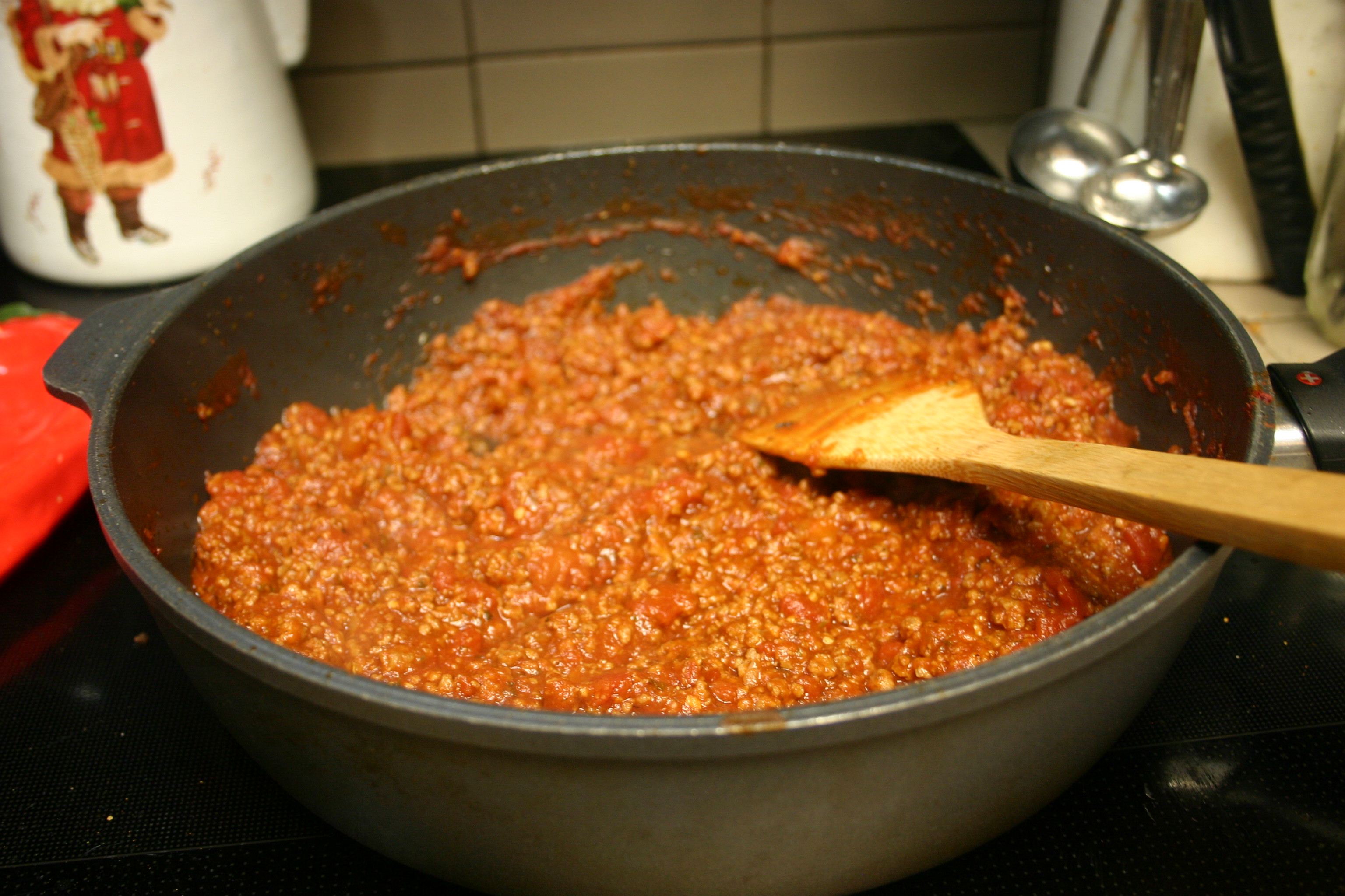 Using a large skillet, cook onions and garlic in a small amount of olive oil until tender, about 5 minutes over medium heat. Add ground beef, break up meat with a spatula as it cooks. Drain most of the grease from the skillet, return meat mixture to the pan. Season with pepper.