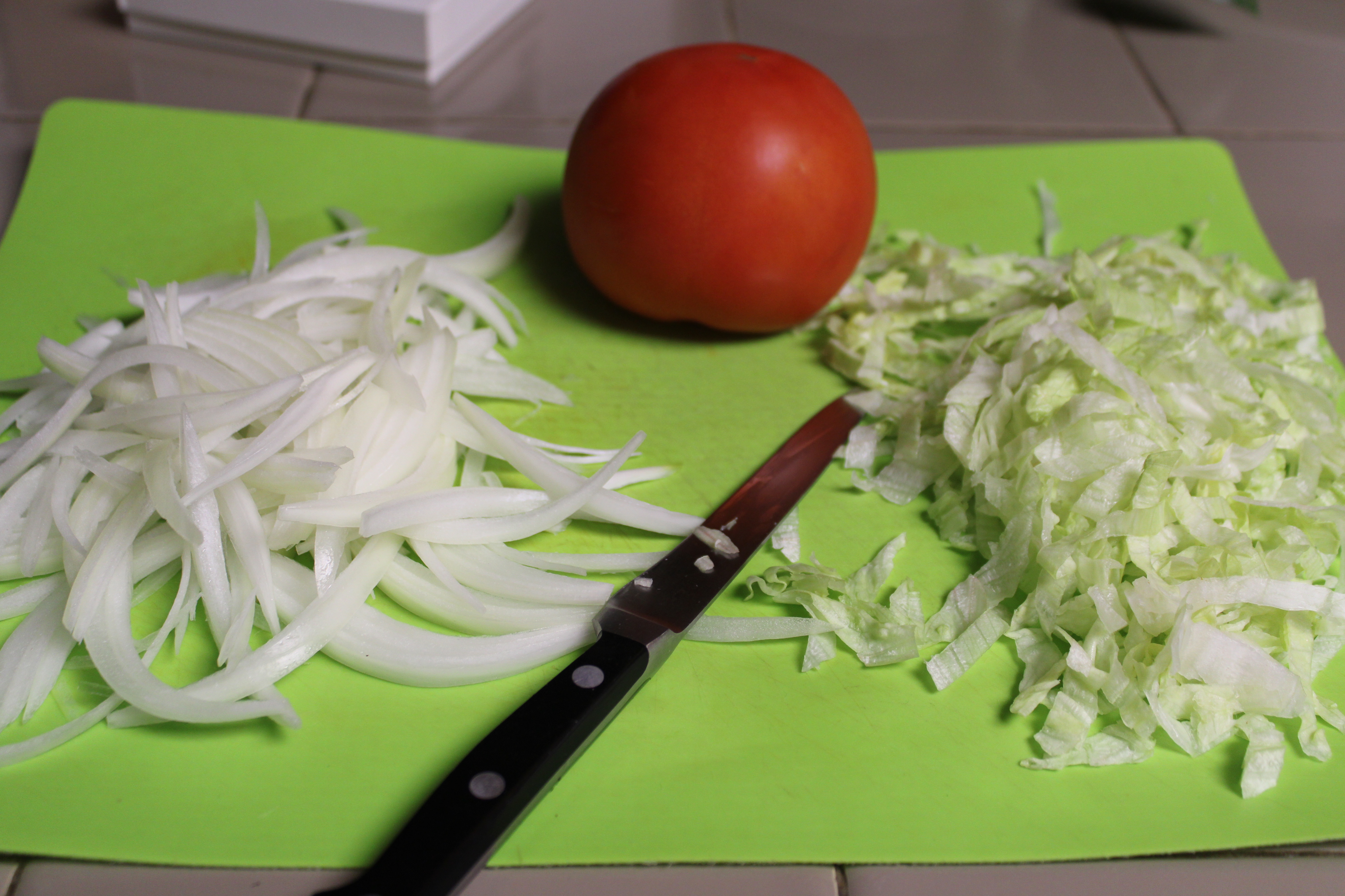 Cut onion in half from root to tip. Reserve half for another purpose. Peel and slice remaining half into thin slivers. Stack lettuce, roll leaves tight and shred. Set aside.
