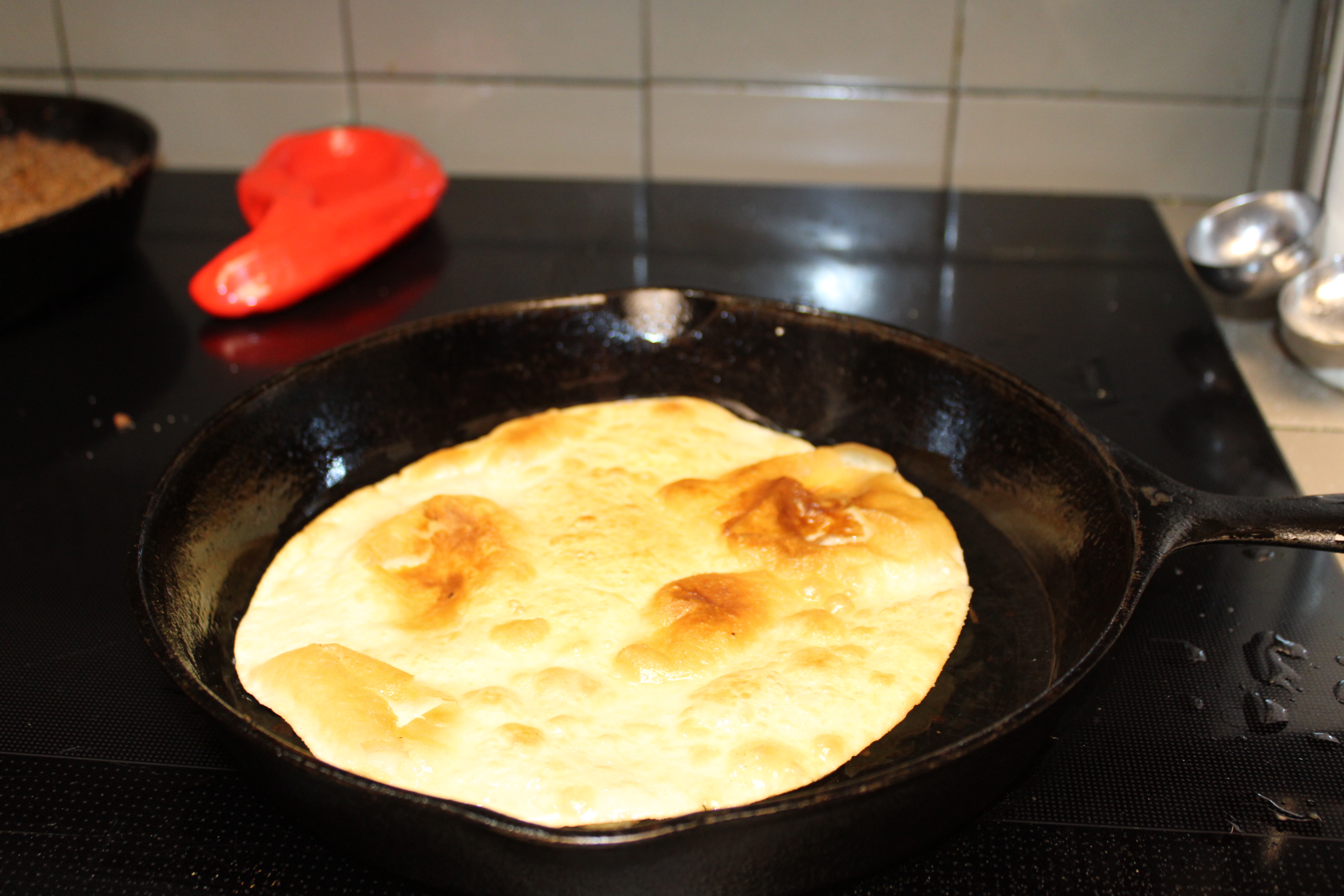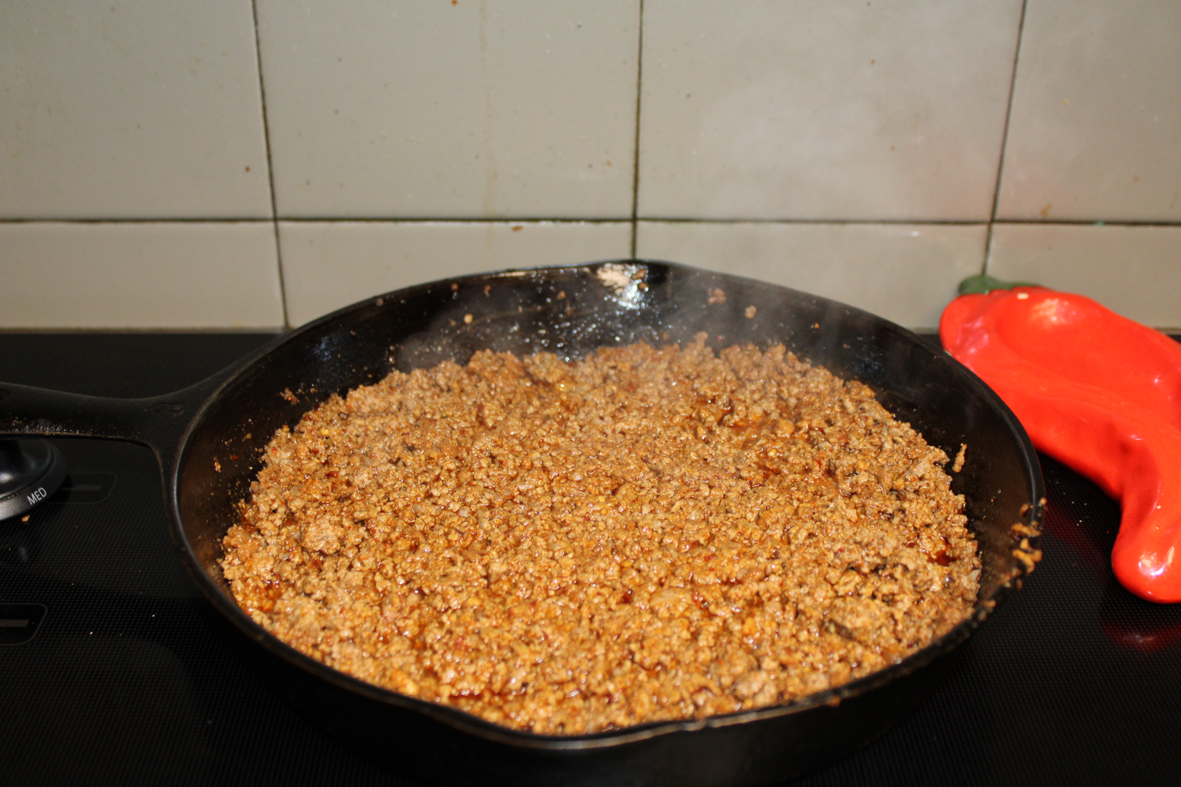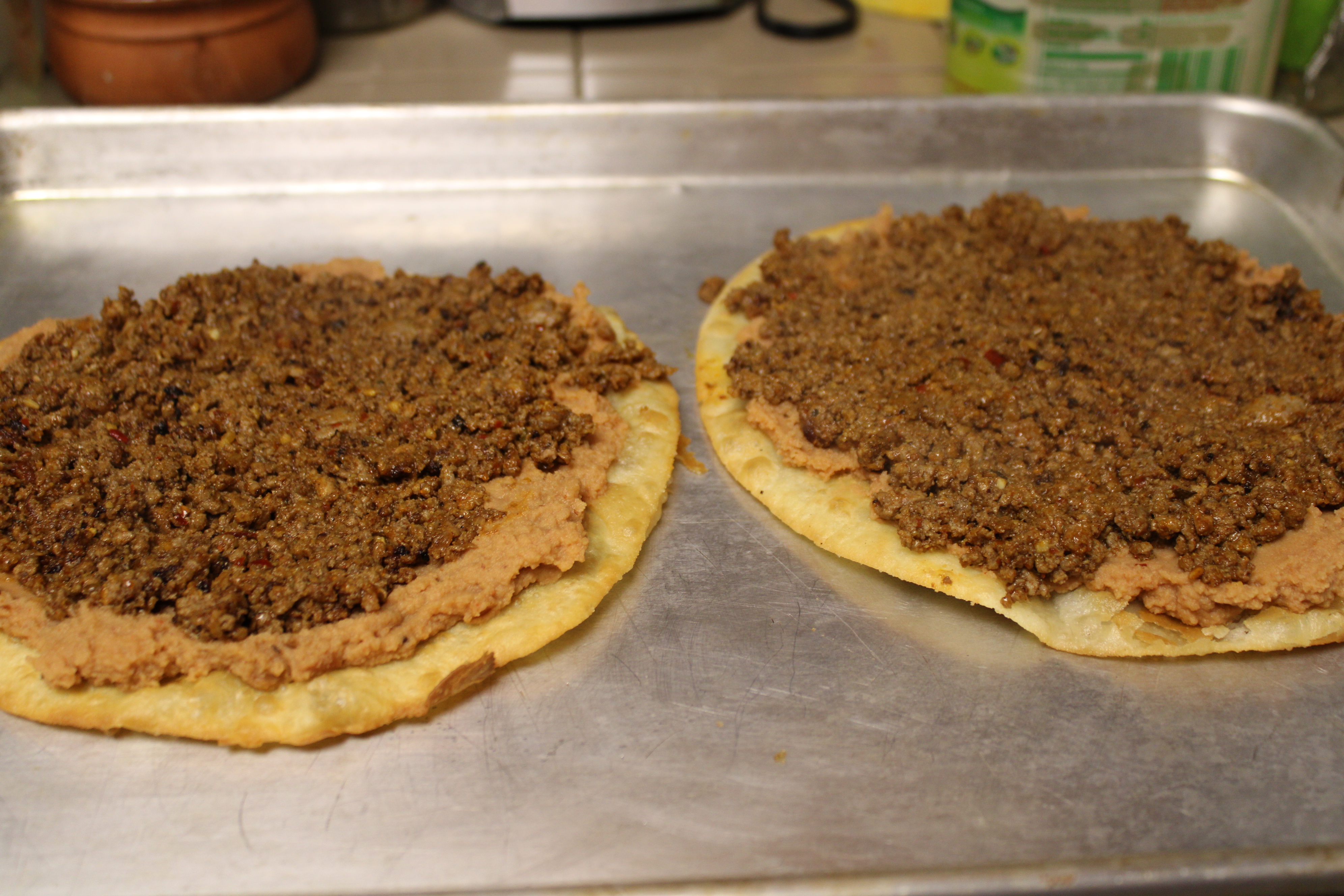 Lay four tortillas out on a work surface. Slather each tortilla generously with a layer of refried beans. Top the beans with a layer of seasoned meat.
