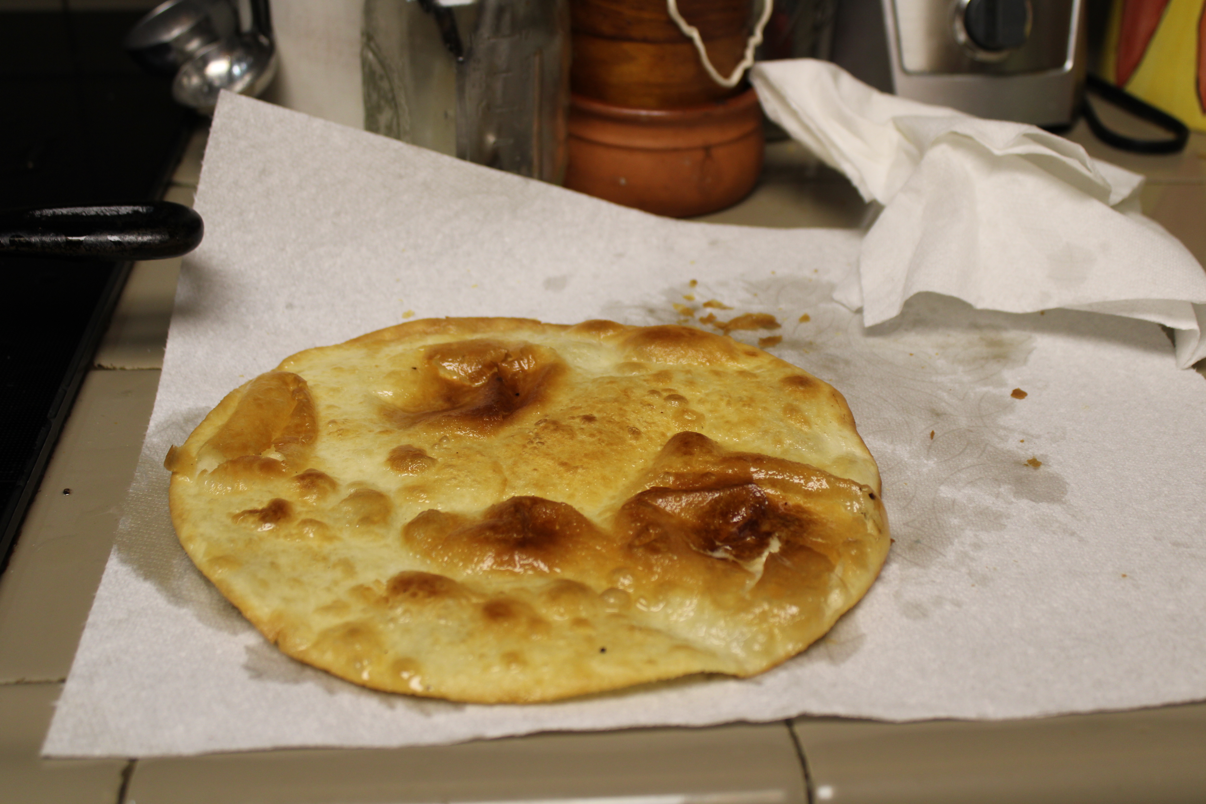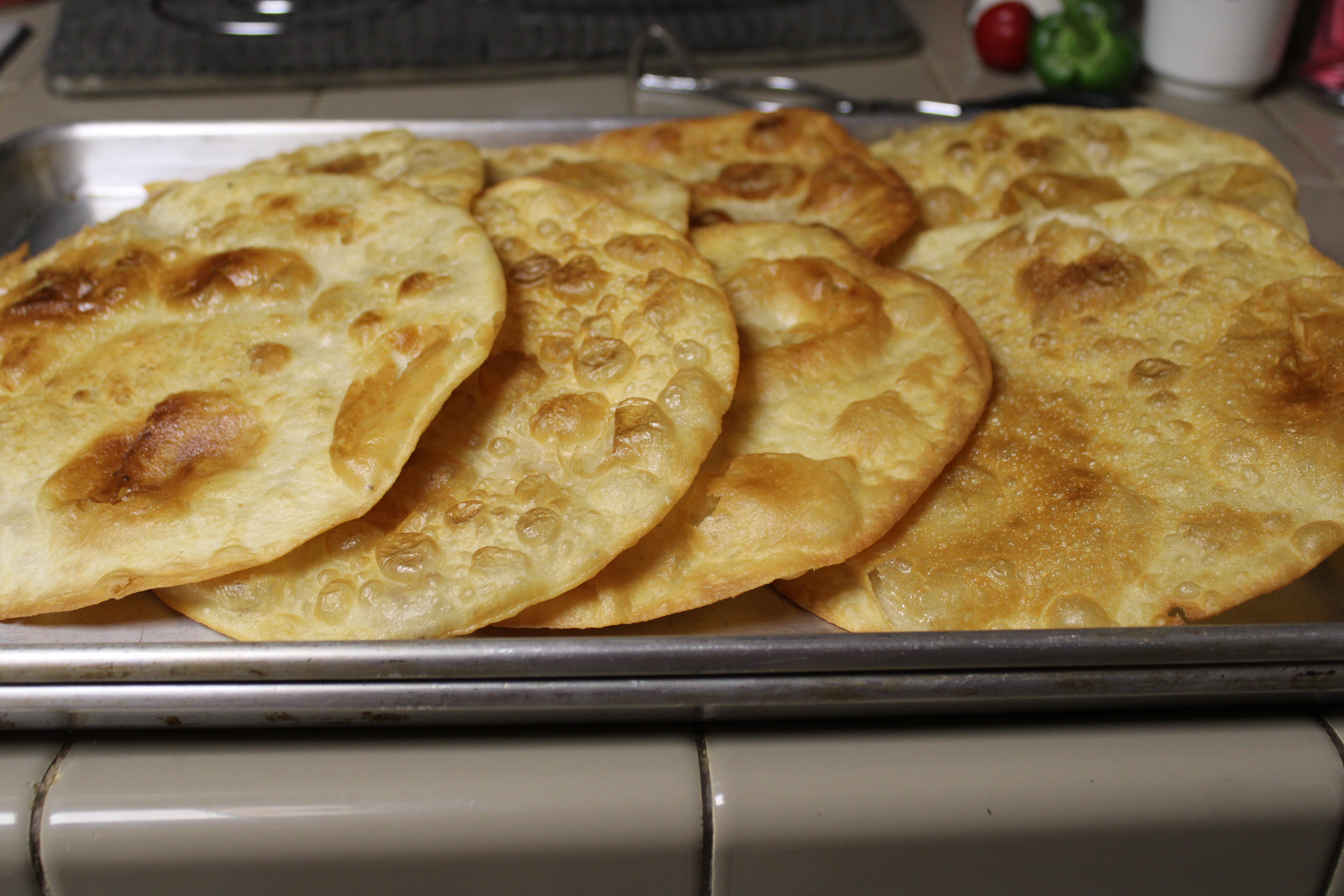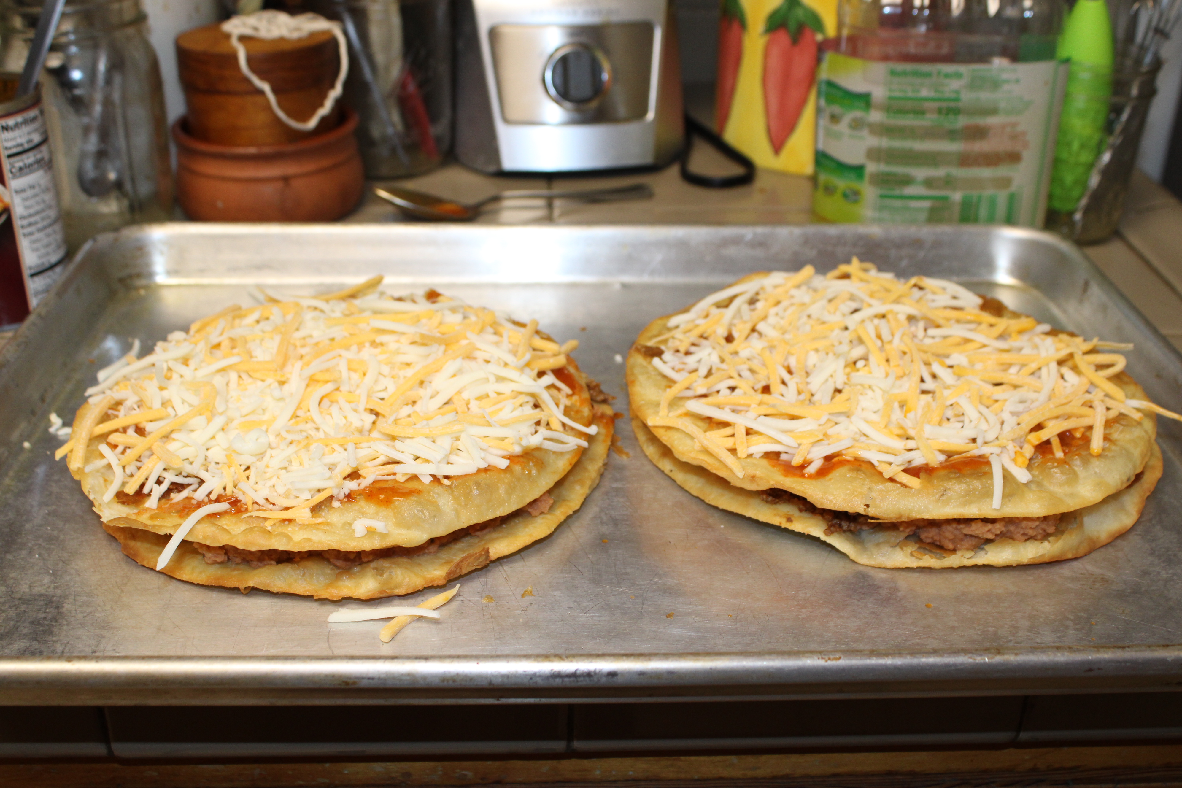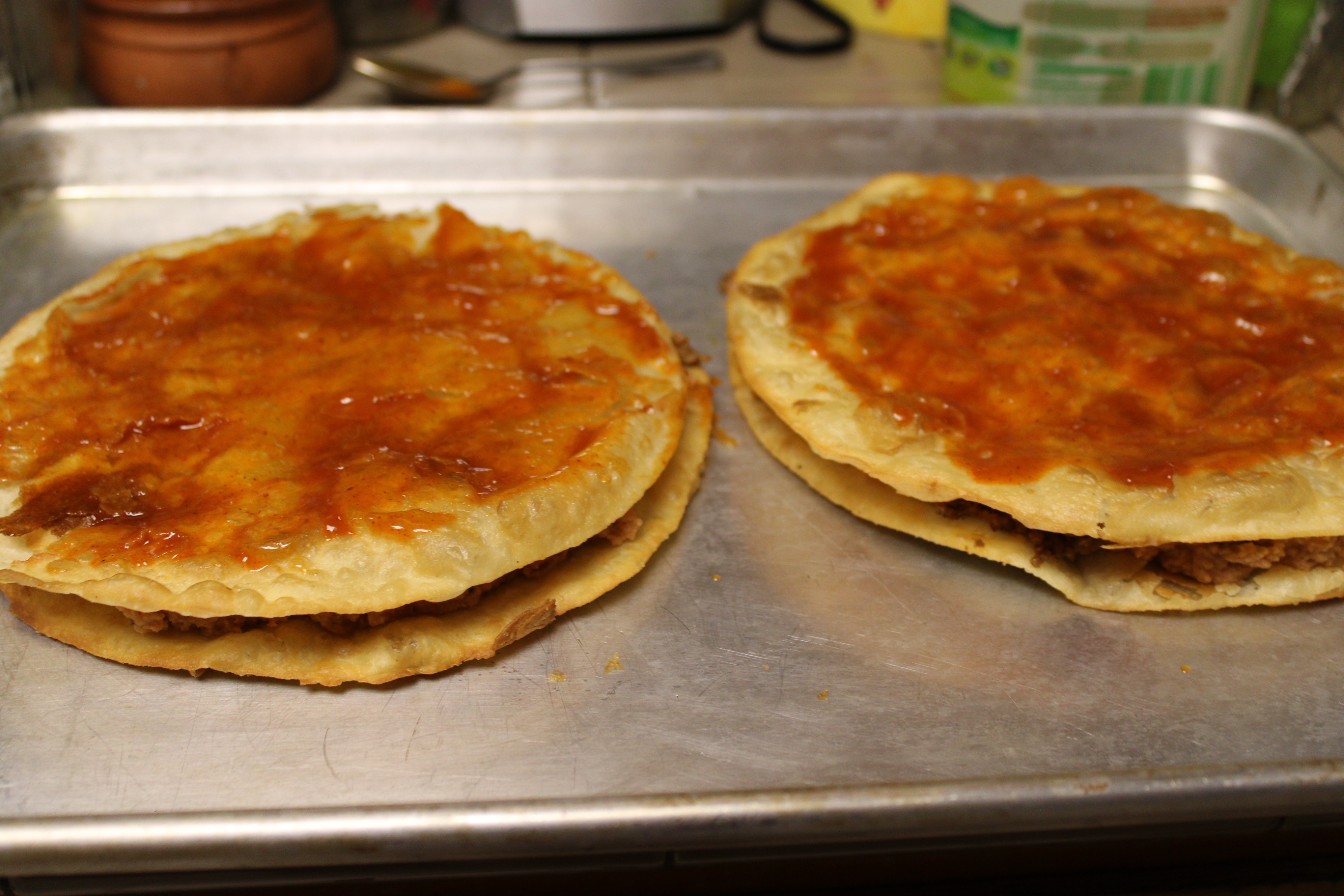 While the meat sauce thickens, heat a large, deep skillet over medium heat. Warm oil. Once hot, fry the tortillas, one at a time, for about 4 minutes, flipping frequently, until tortillas are crisp. Remove from skillet, blot excess grease with paper towels. Repeat until all the tortillas have been fried. Set aside.