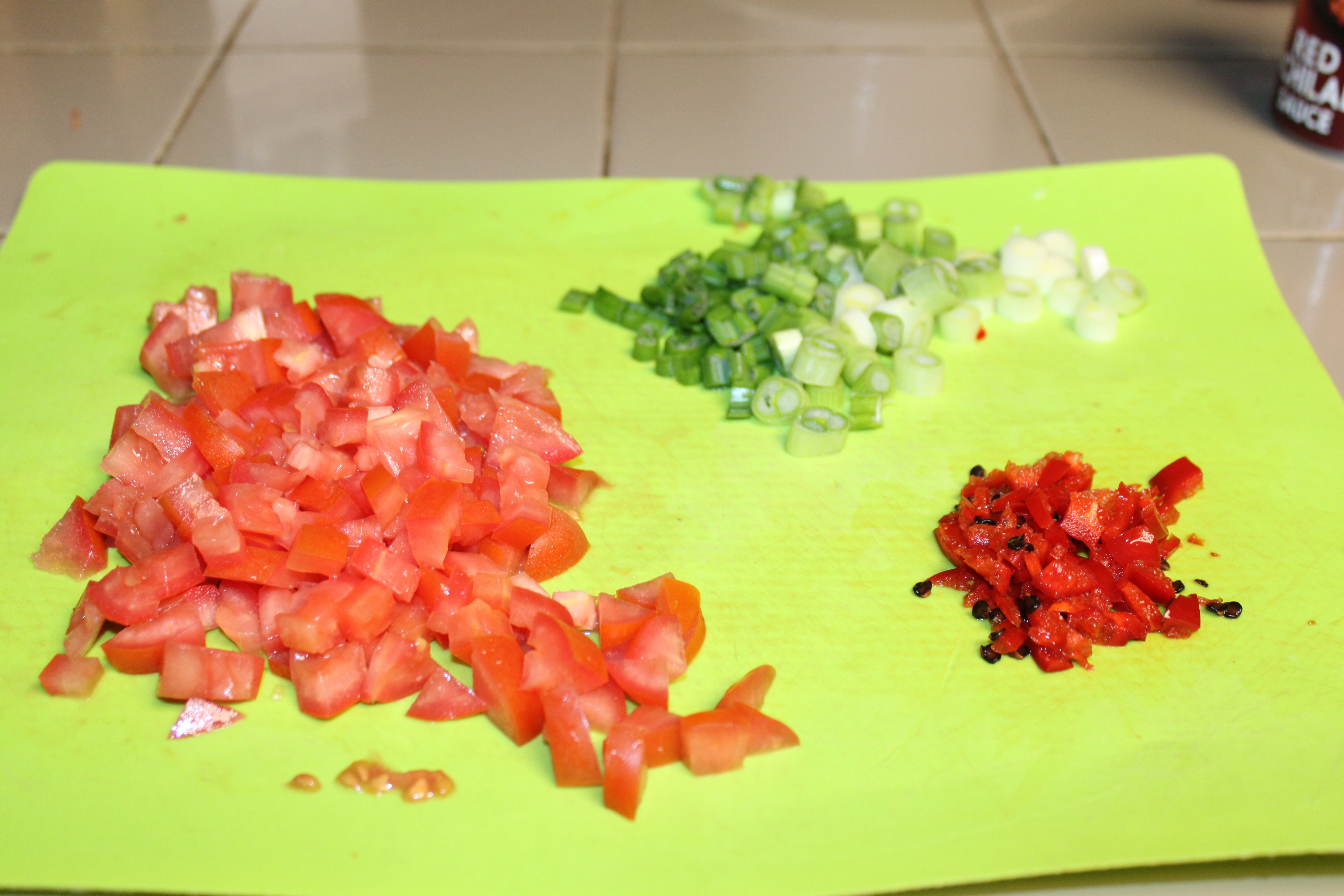 Seed and dice the tomatoes. Trim roots from green onions, slice onions. Stem pepper, dice, retaining most of the seeds. Set aside until ready to finish pizzas.