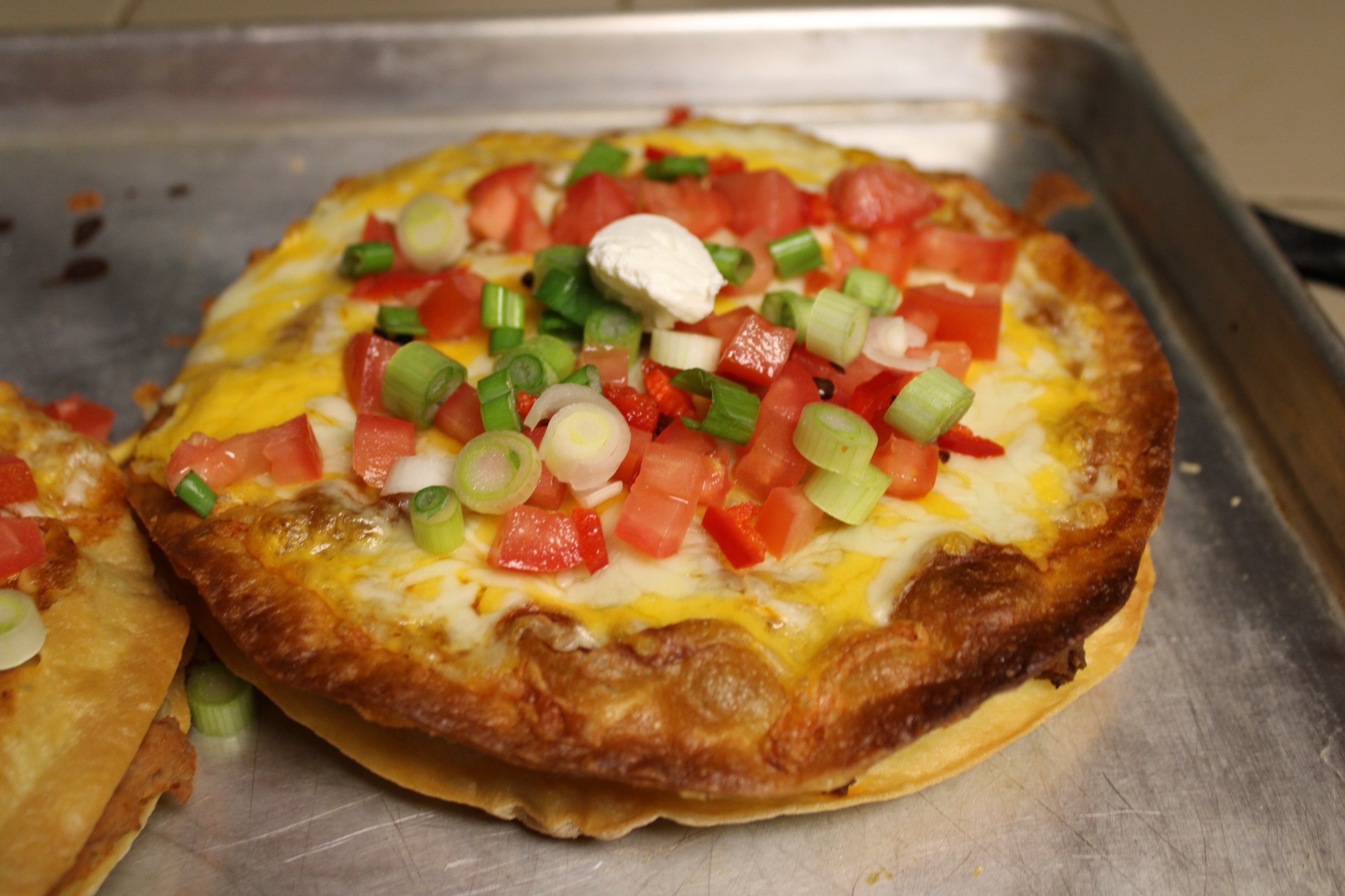 Remove pizzas from the oven. Garnish with tomatoes, green onions, hot peppers and a dollop of sour cream. Serve with margaritas and enjoy.