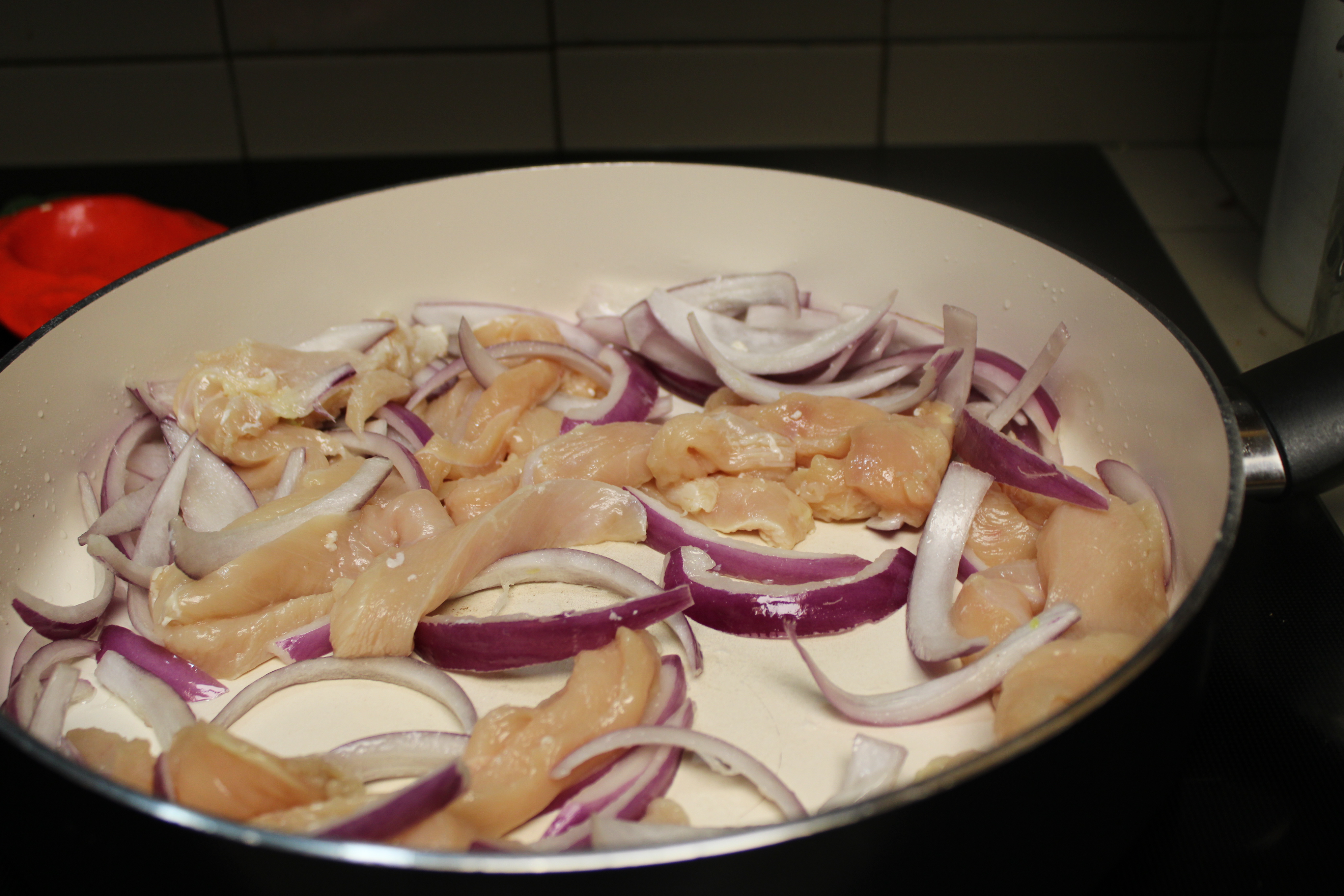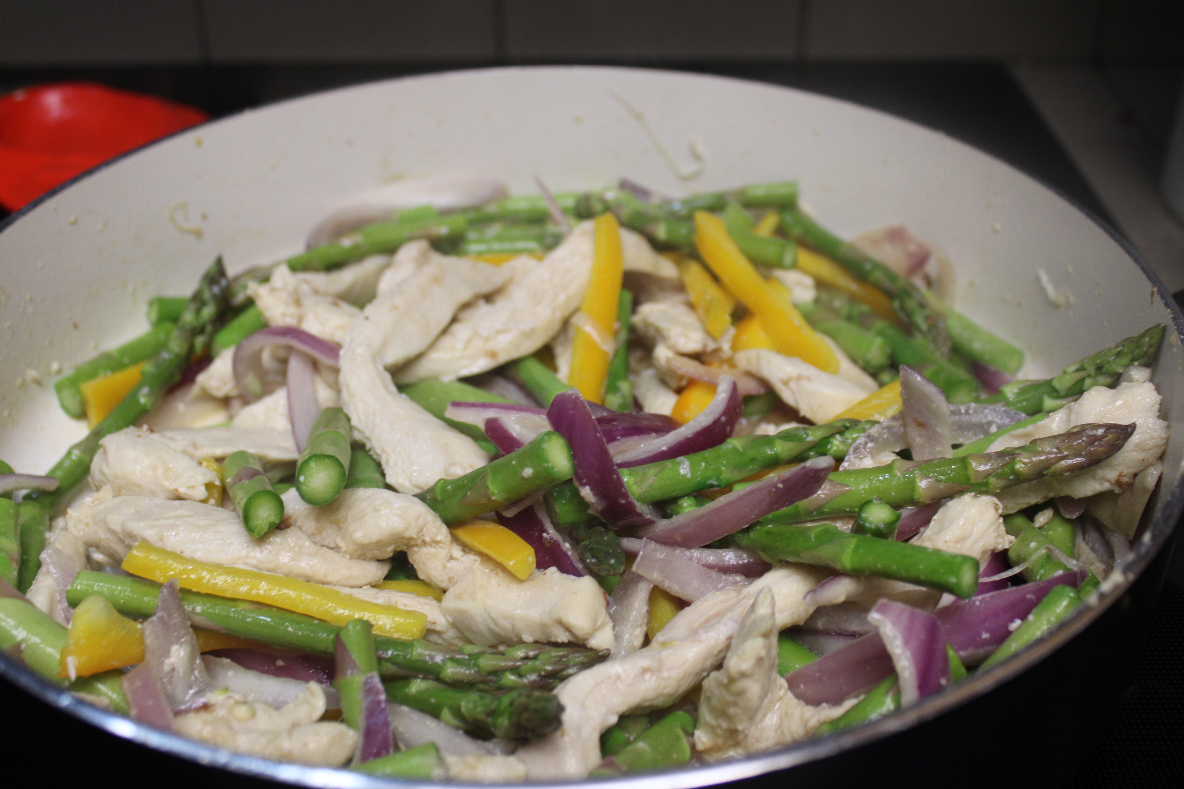 In a large skillet, heat the oil over medium heat. Add chicken and onions, sauté until chicken is no longer pink, about 5 minutes, stirring occasionally. Add the bell peppers and asparagus, cover and continue to cook another 5 minutes.