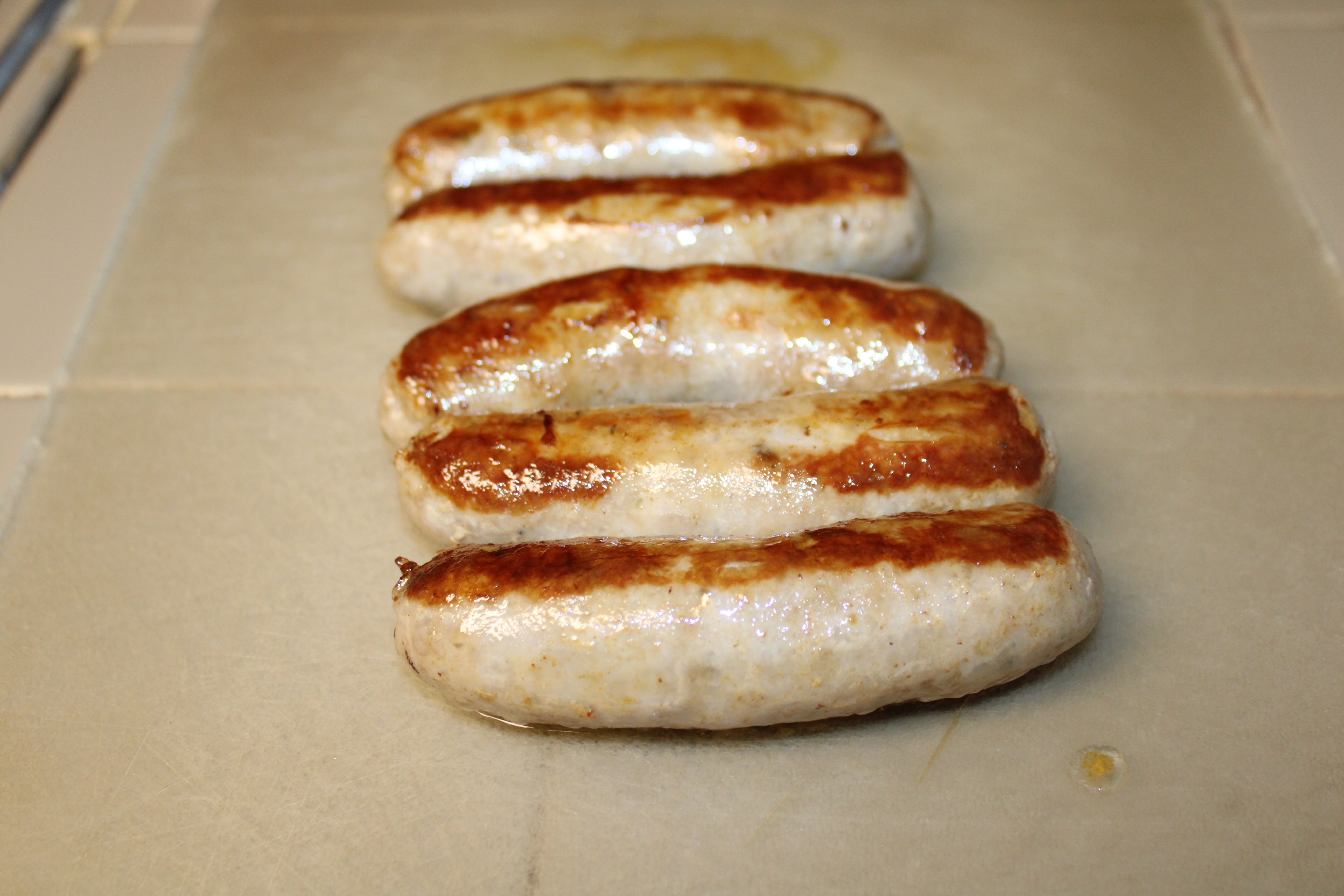 Meanwhile, heat a heavy skillet over medium heat; brown sausage in the skillet. Add wine, cover and let steam in the wine for about 5 minutes or so. Remove cooked sausage from the skillet, let cool.