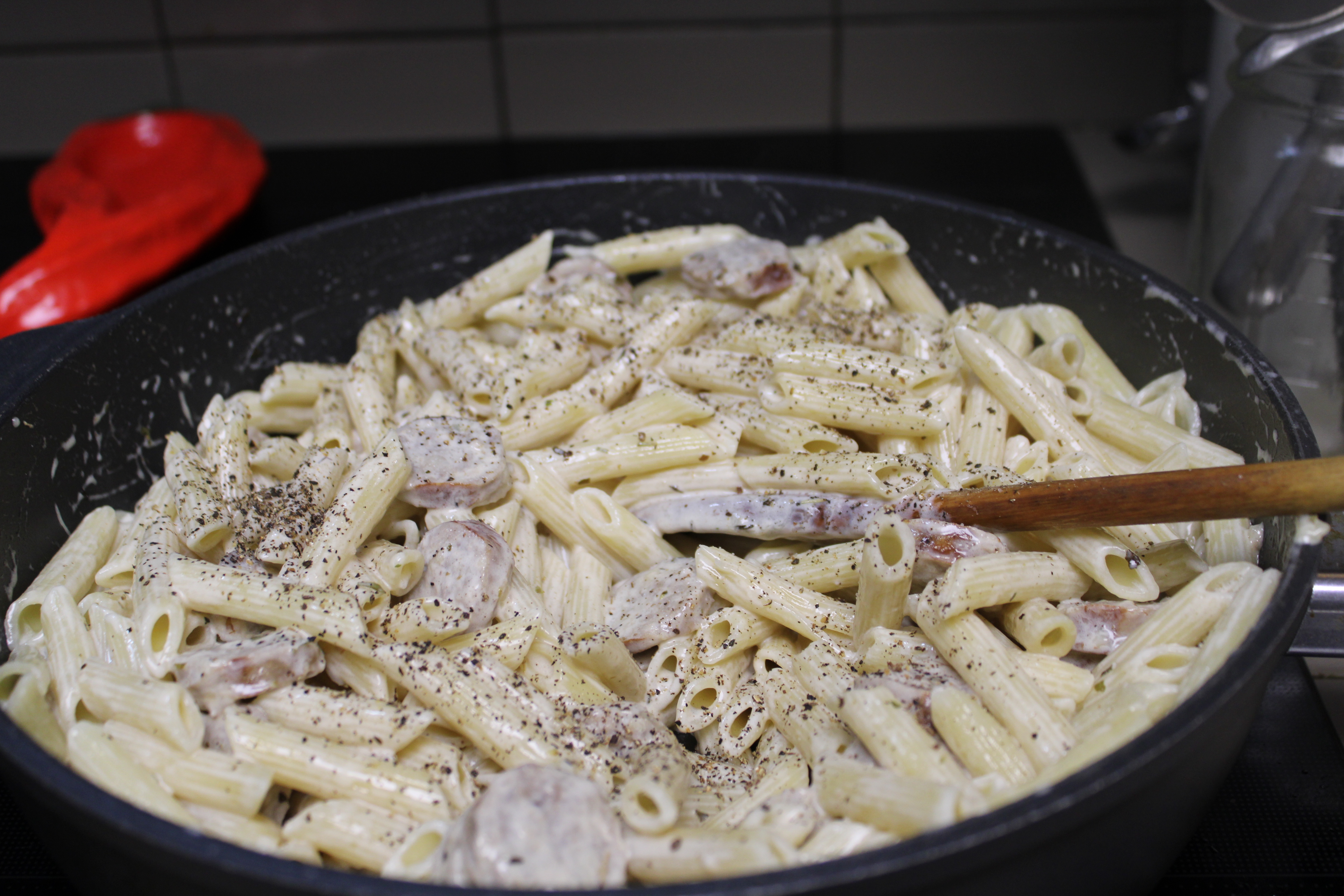 Add cream to the hot skillet, lower heat and simmer cream for 4 minutes. Add saffron, then Parmesan Cheese and let sauce reduce to a thicker consistency. Lightly chop the sausage; add to the sauce. Season with Italian Seasoning. Continue to simmer over low heat until the pasta is ready. Immediately add the pasta to the sauce; season with salt and fresh black pepper. Toss to coat well. If necessary, thin the sauce with a little of the pasta.