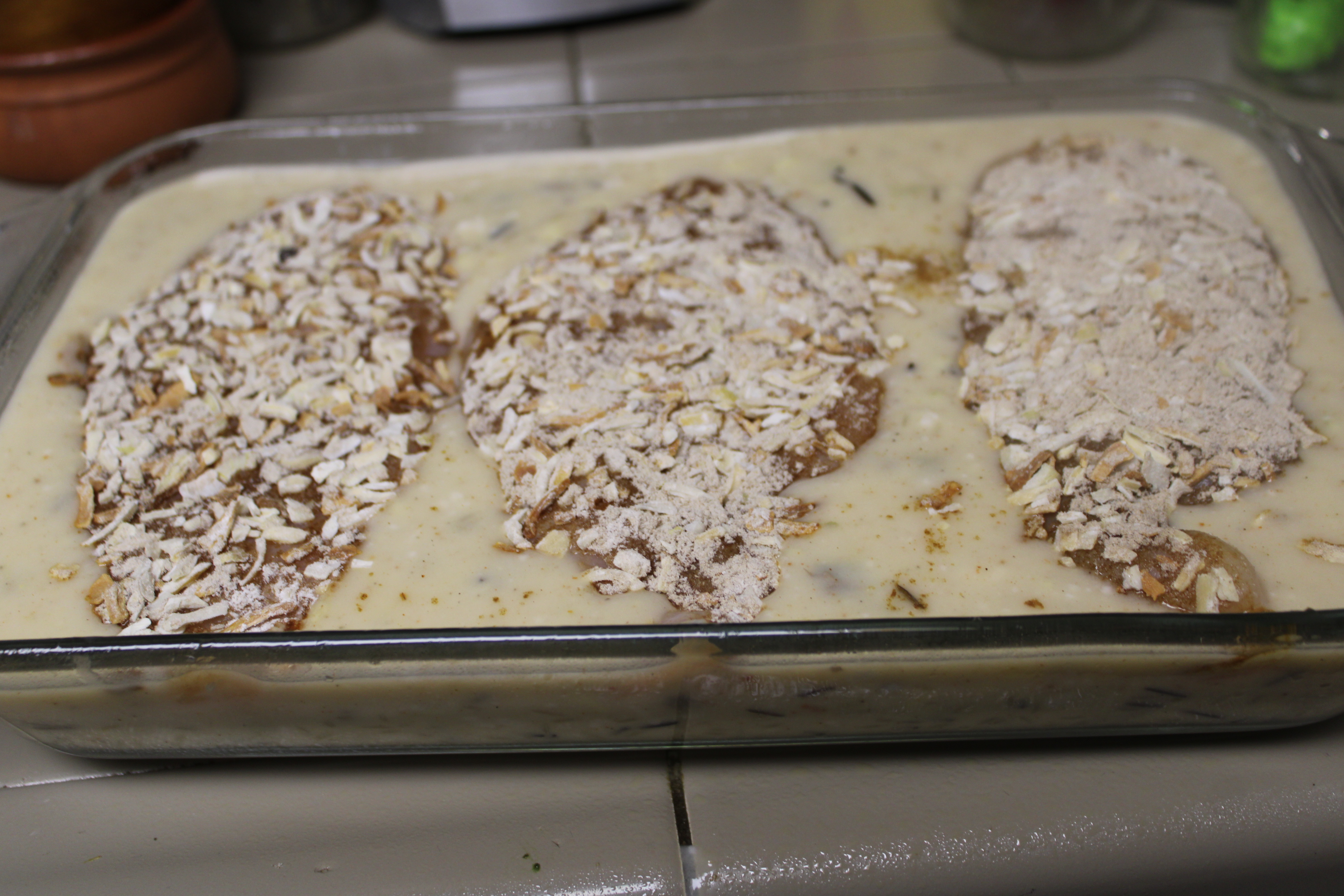 On a sheet of waxed paper, mix both dry soup mix packages with the flour. Spread out evenly. Lay the chicken breasts (pretty side down) on the dry soup mixture. Season the breast with a little salt, then press chicken gently into the dry soup mixture. When finished, the breasts with have dried onion soup on one side, salt seasoning on the other.