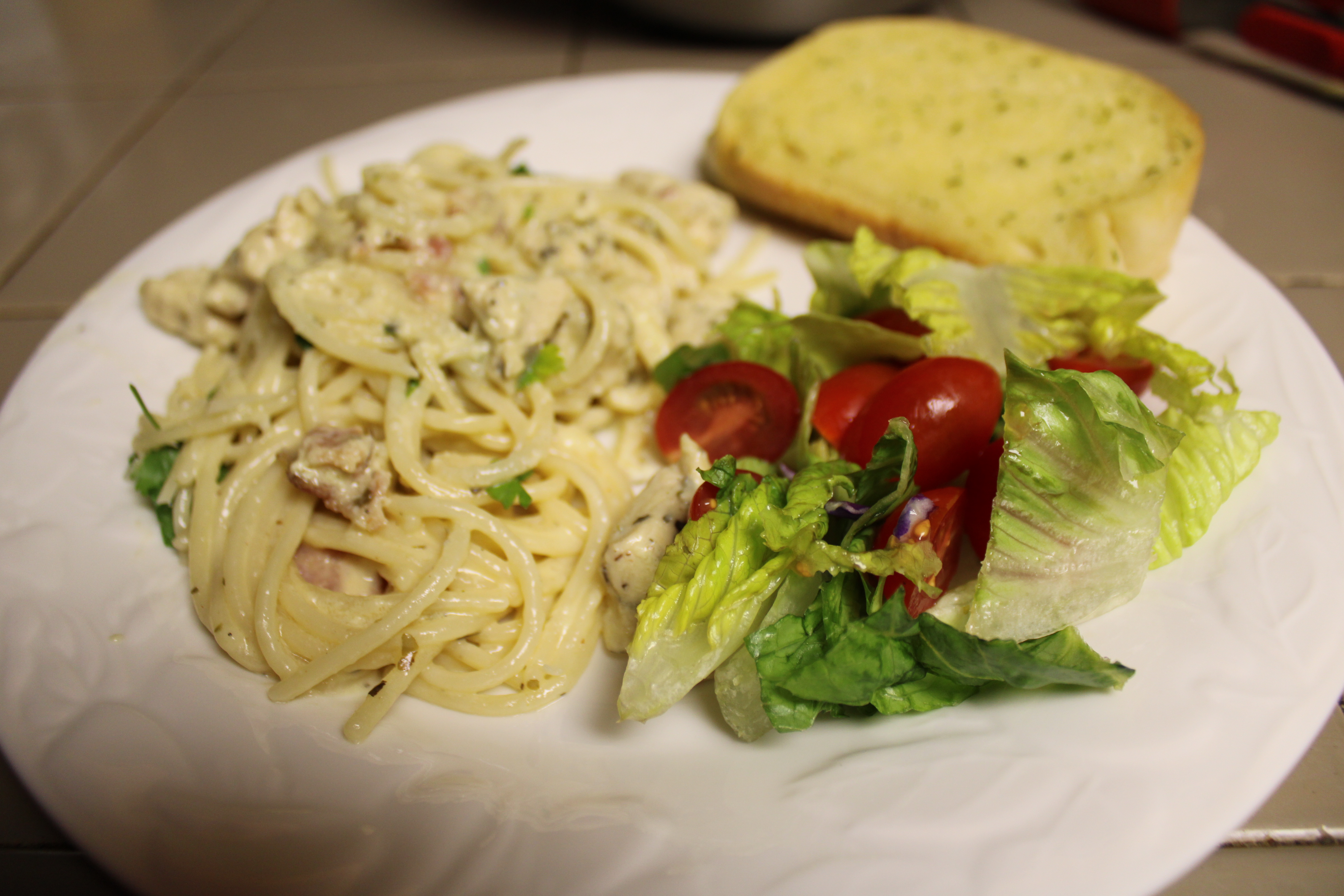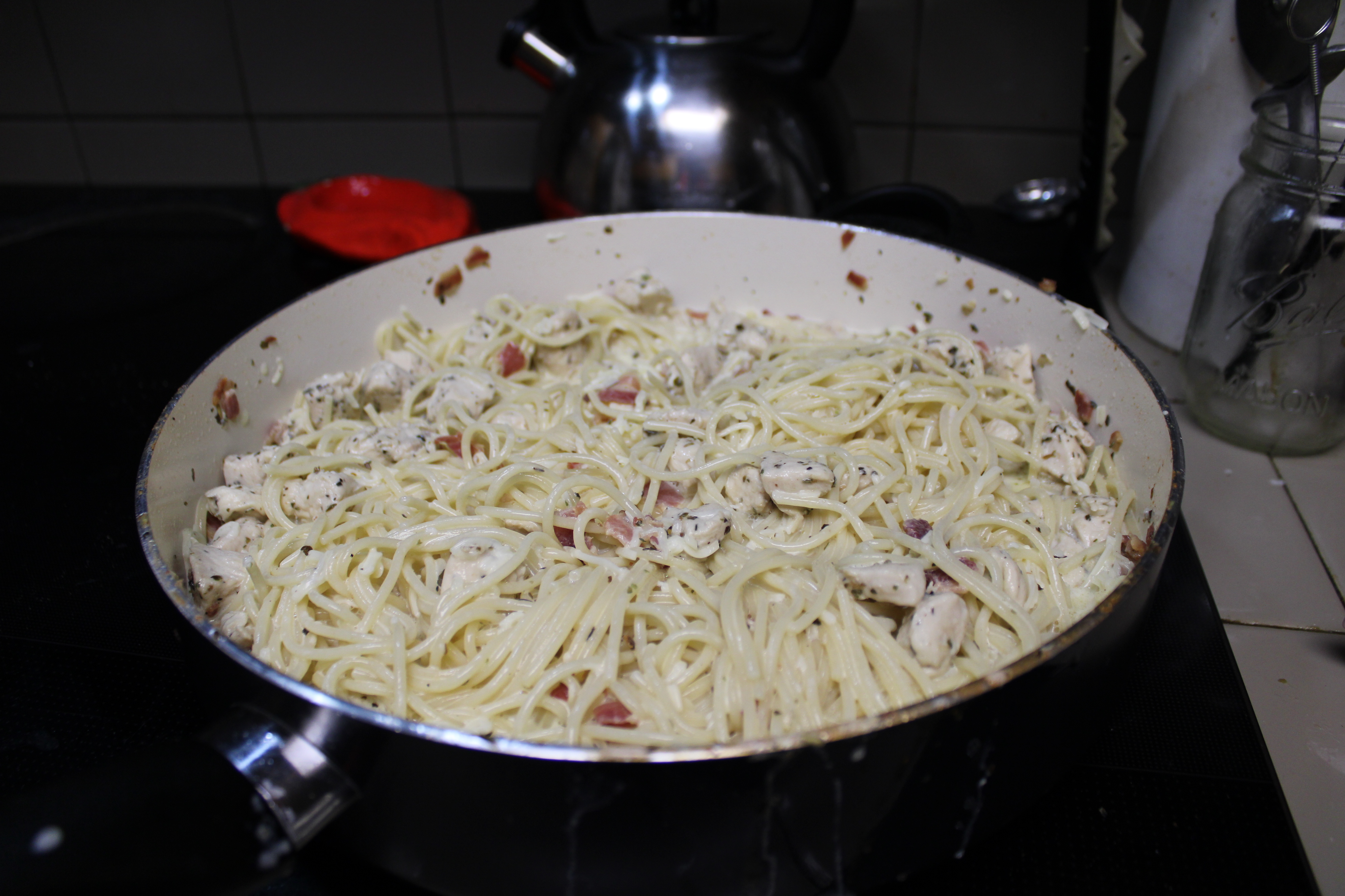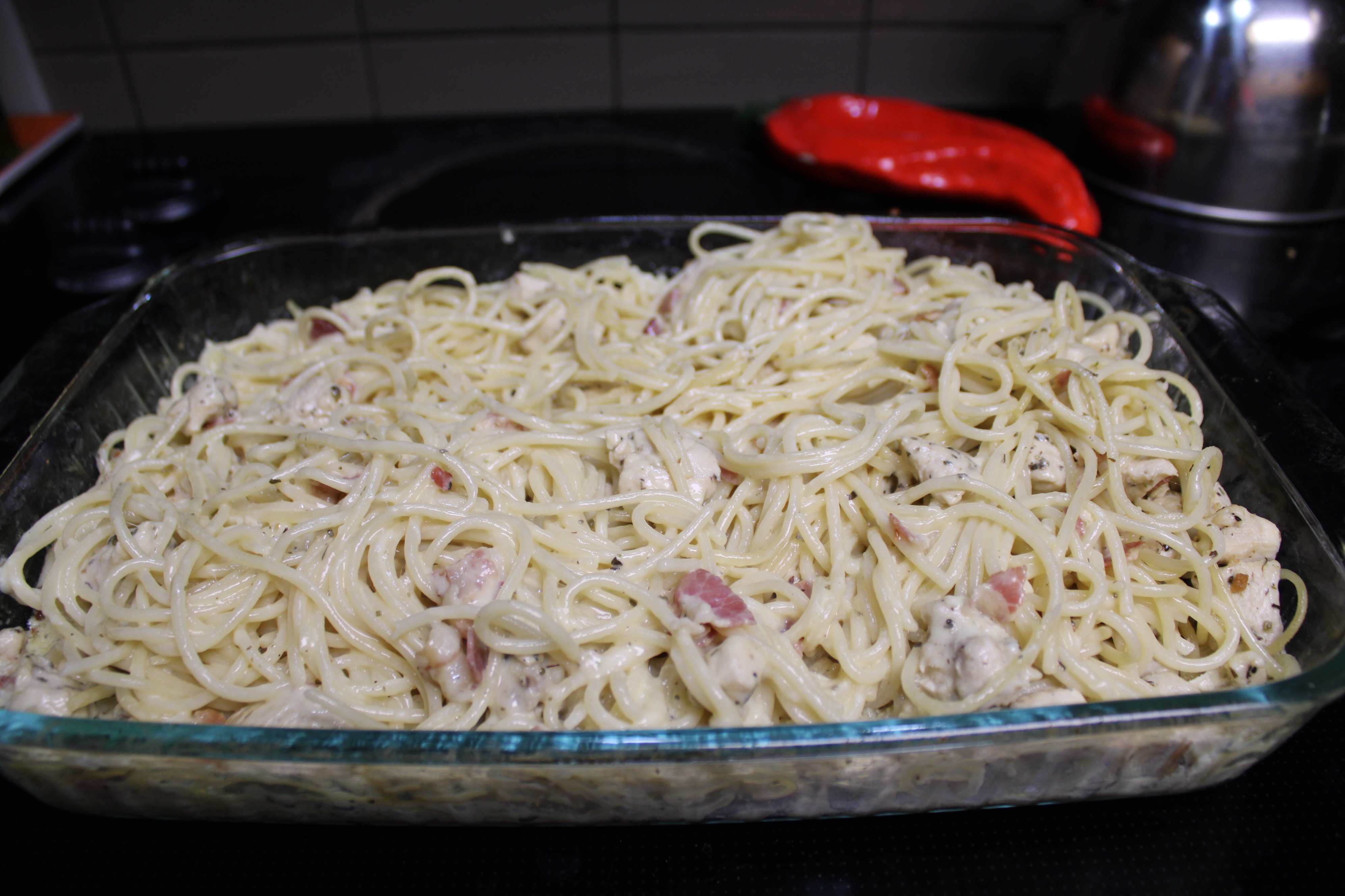 Return panchetta and chicken mixture to the skillet used for cooking. Add cooked pasta, toss to combine. Pour sauce over the pasta, toss again. Transfer pasta mixture to the prepared casserole dish.