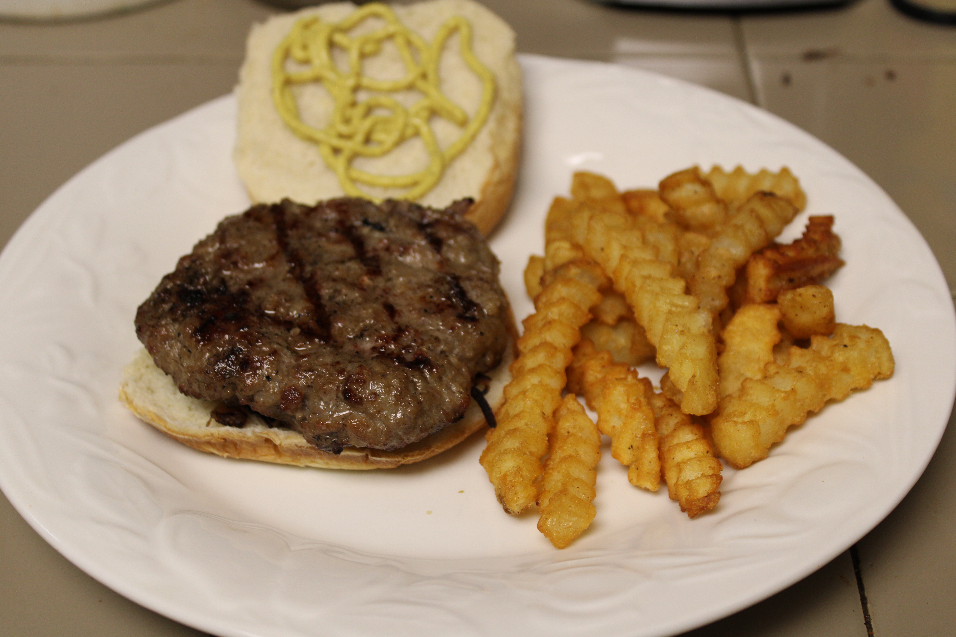 Split open the hamburger buns. Add condiments as desired to the buns. Top with burgers, server and enjoy with Air-Fryer Crinkle Cut Fries.