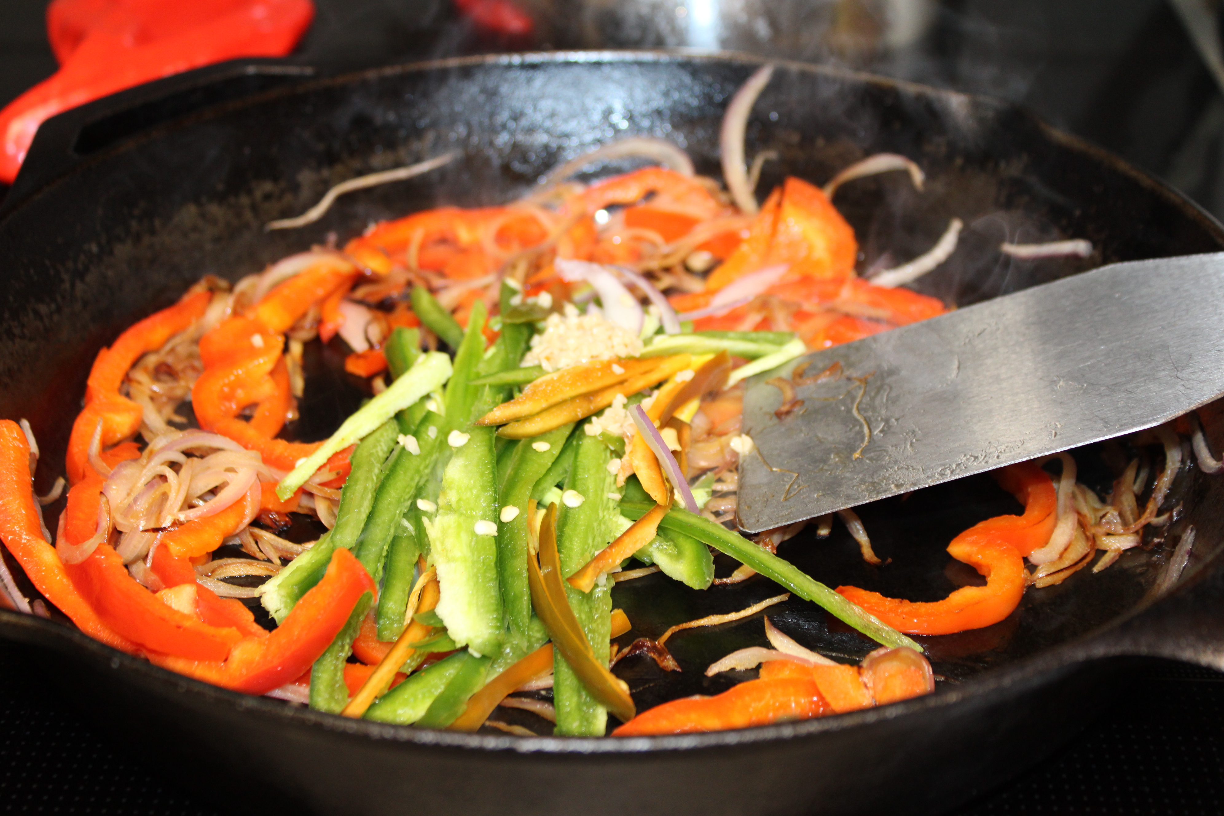 In a large skillet over medium high heat, heat vegetable oil. Add bell peppers and onion, season with salt and pepper. Cook, stirring often, until vegetables are tender, about 5 minutes. Stir in jalapeno and garlic, continue to sauté about another minute. Remove vegetables mixture from the skillet.