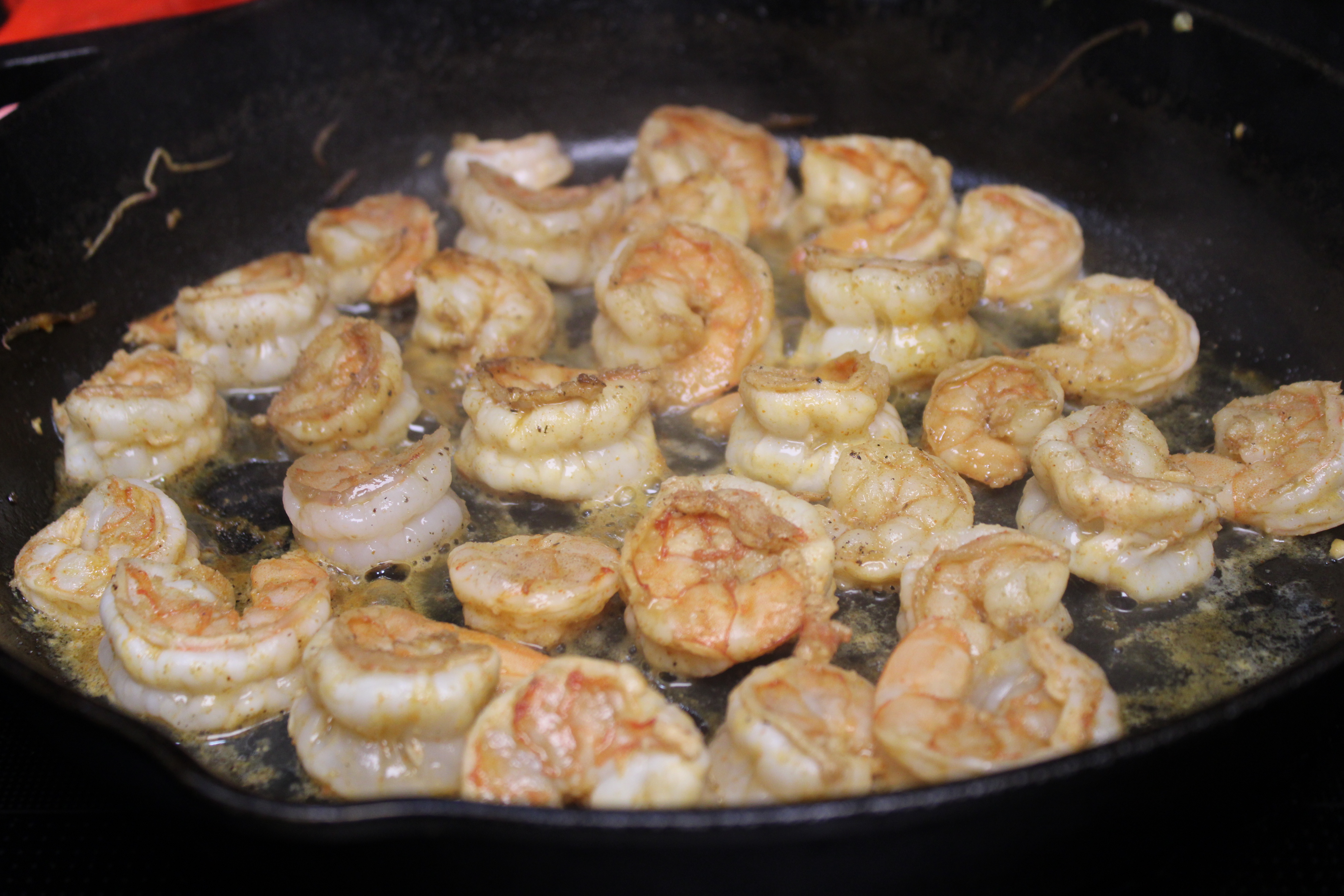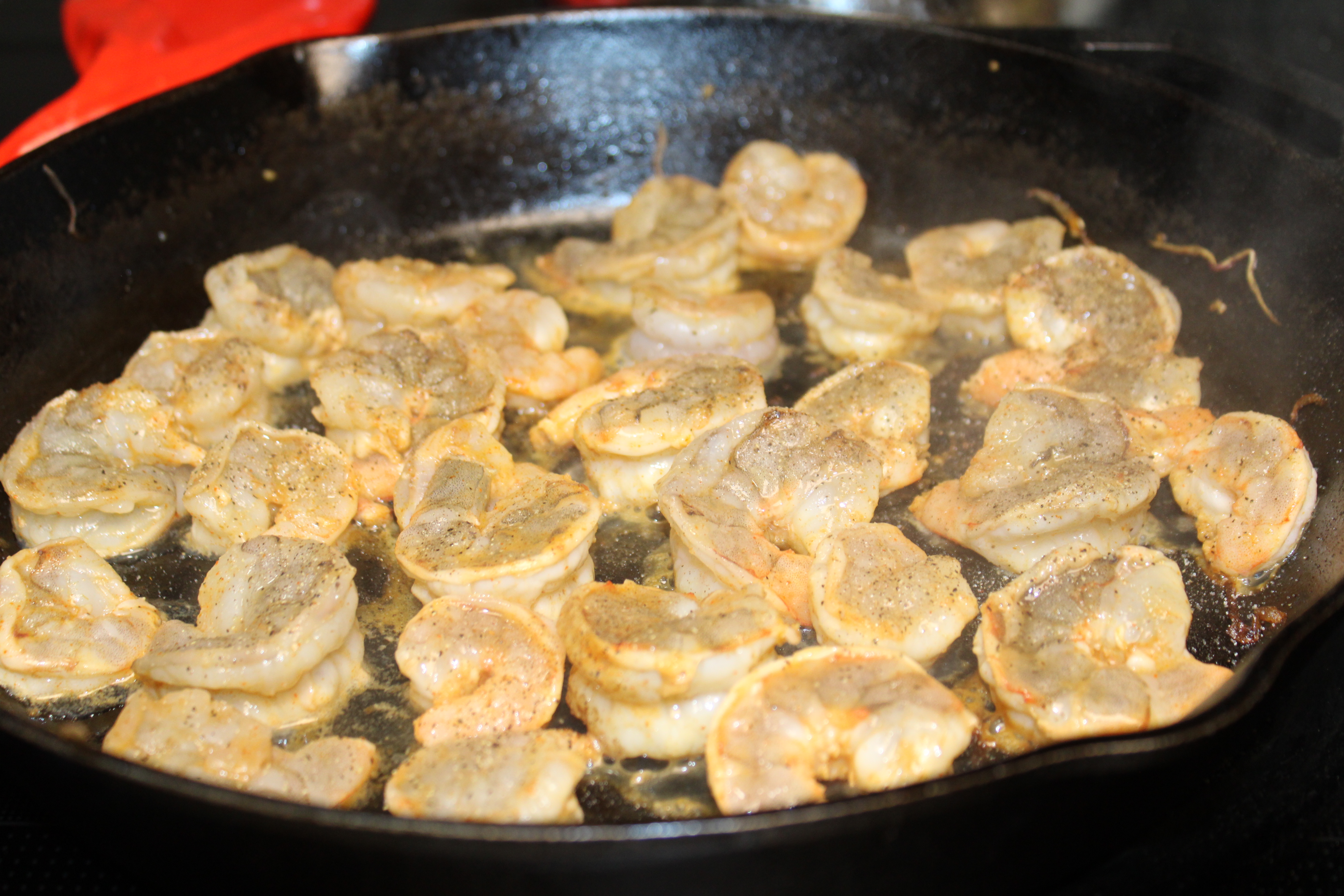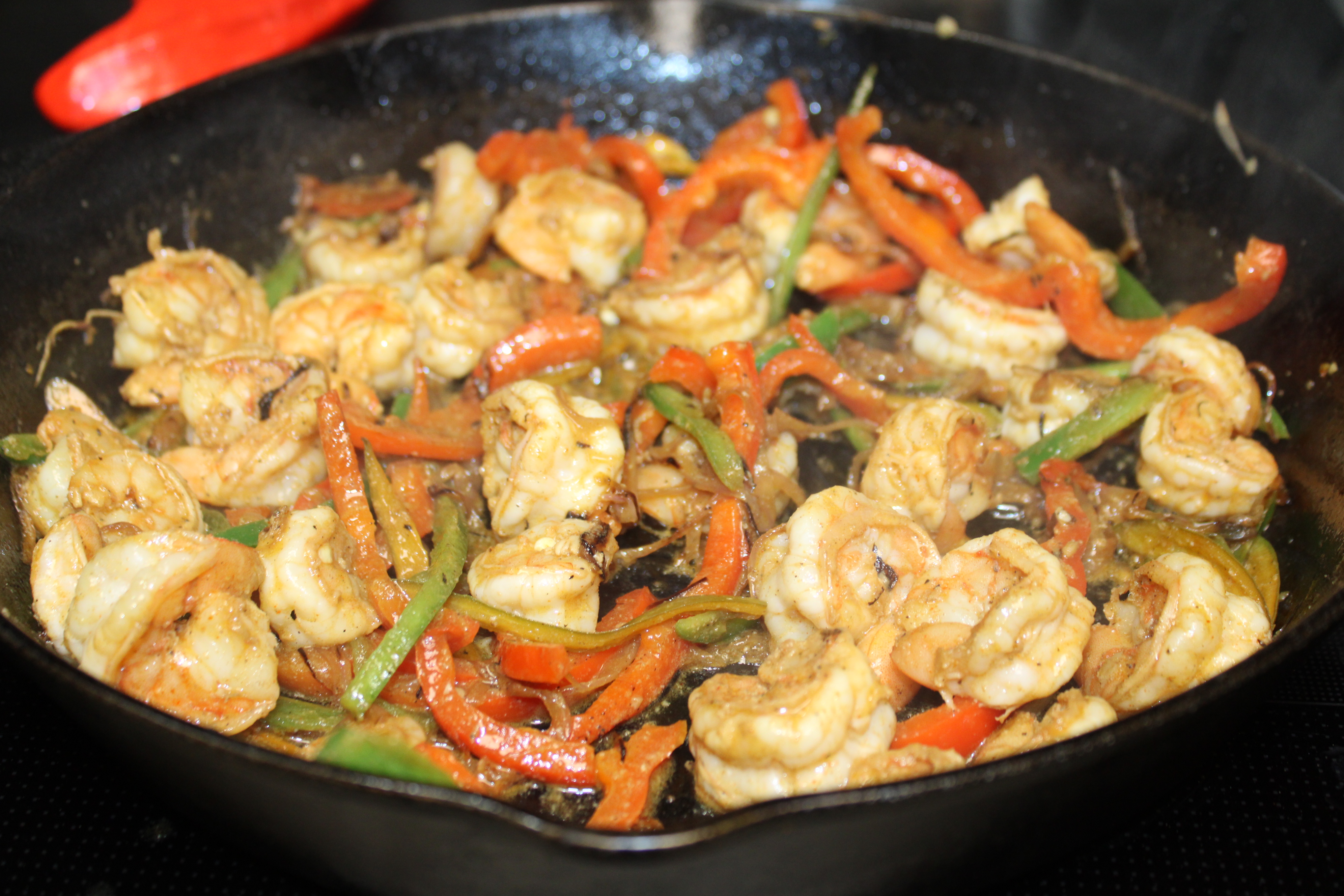 Shake off excess marinade from shrimp; add shrimp to the hot skillet in a single layer. Season with salt and pepper; coot until pink on both sides, about 4 minutes total cooking time. Add reserved marinade, let simmer for about a minute. Return vegetables, season to taste as needed with salt and pepper, stir to incorporate. Remove skillet from heat; cover and keep warm.