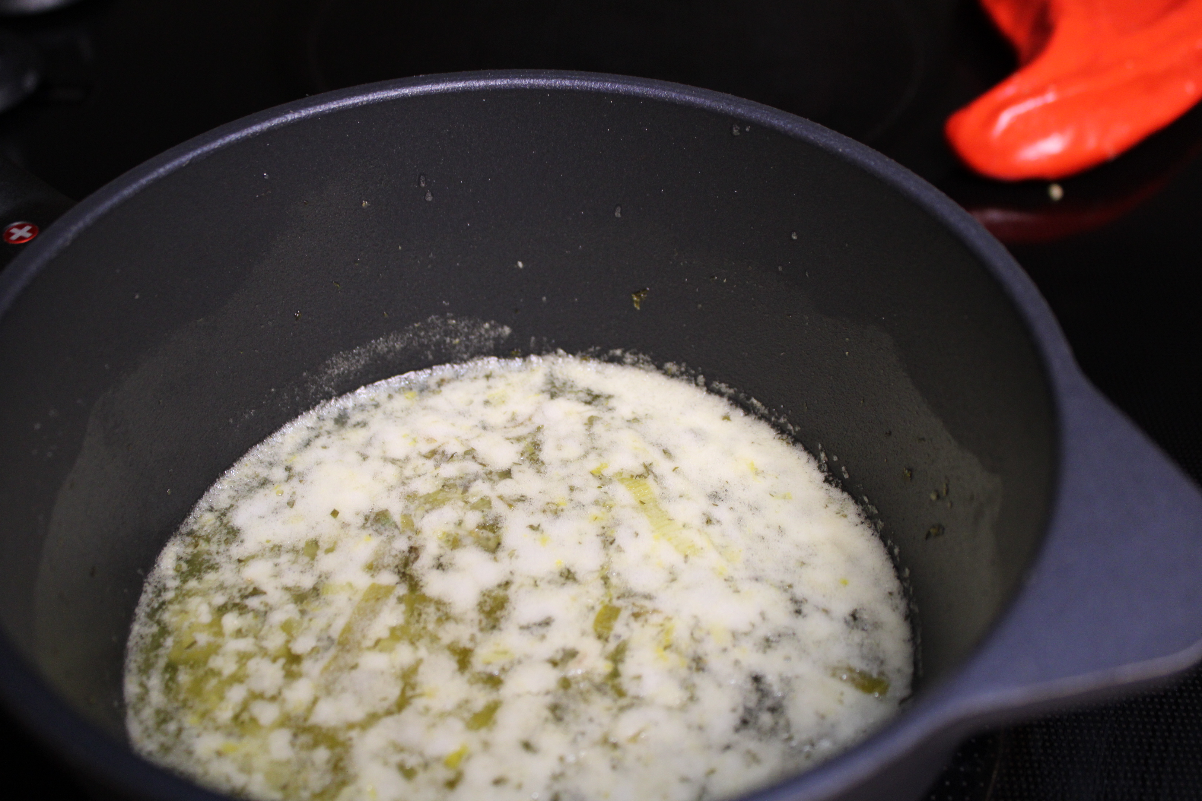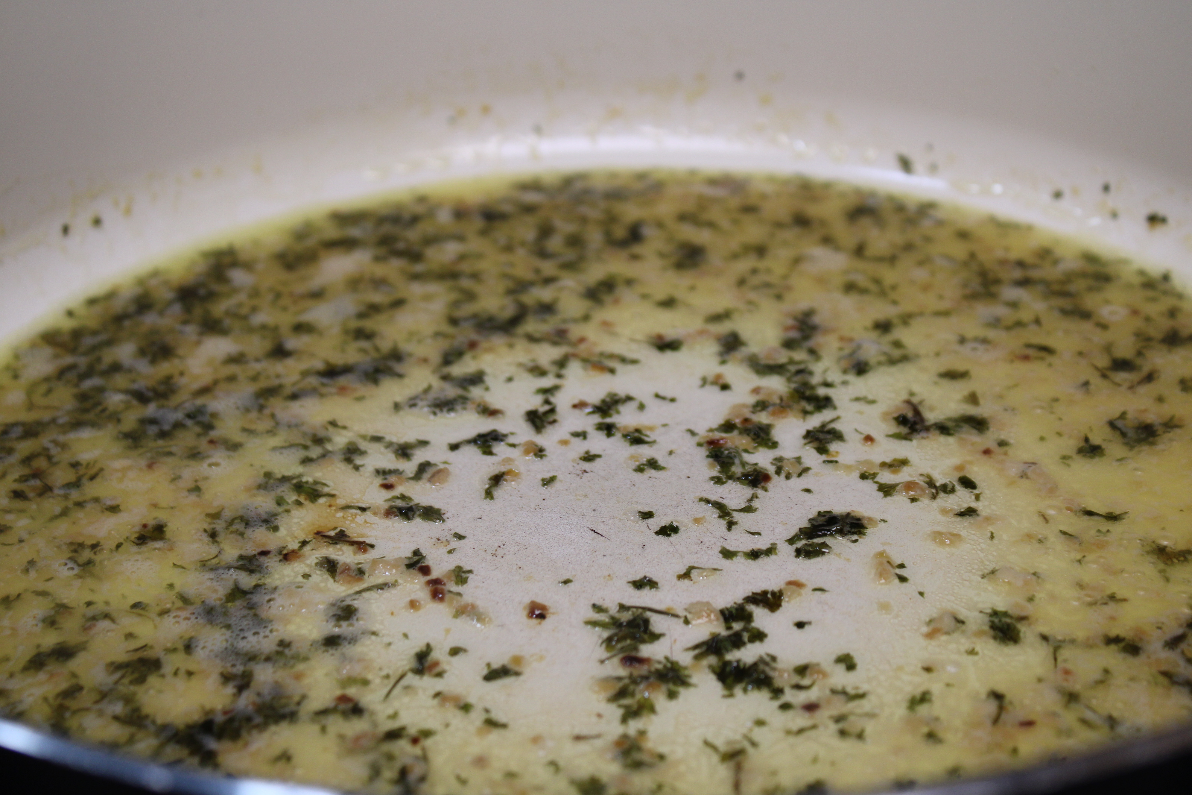 Heat a skillet over medium heat. Add butter and olive oil to the skillet. When the butter has melted, press garlic into the butter. Add parsley. Sauté for about 90 seconds. DO NOT allow garlic to brown.