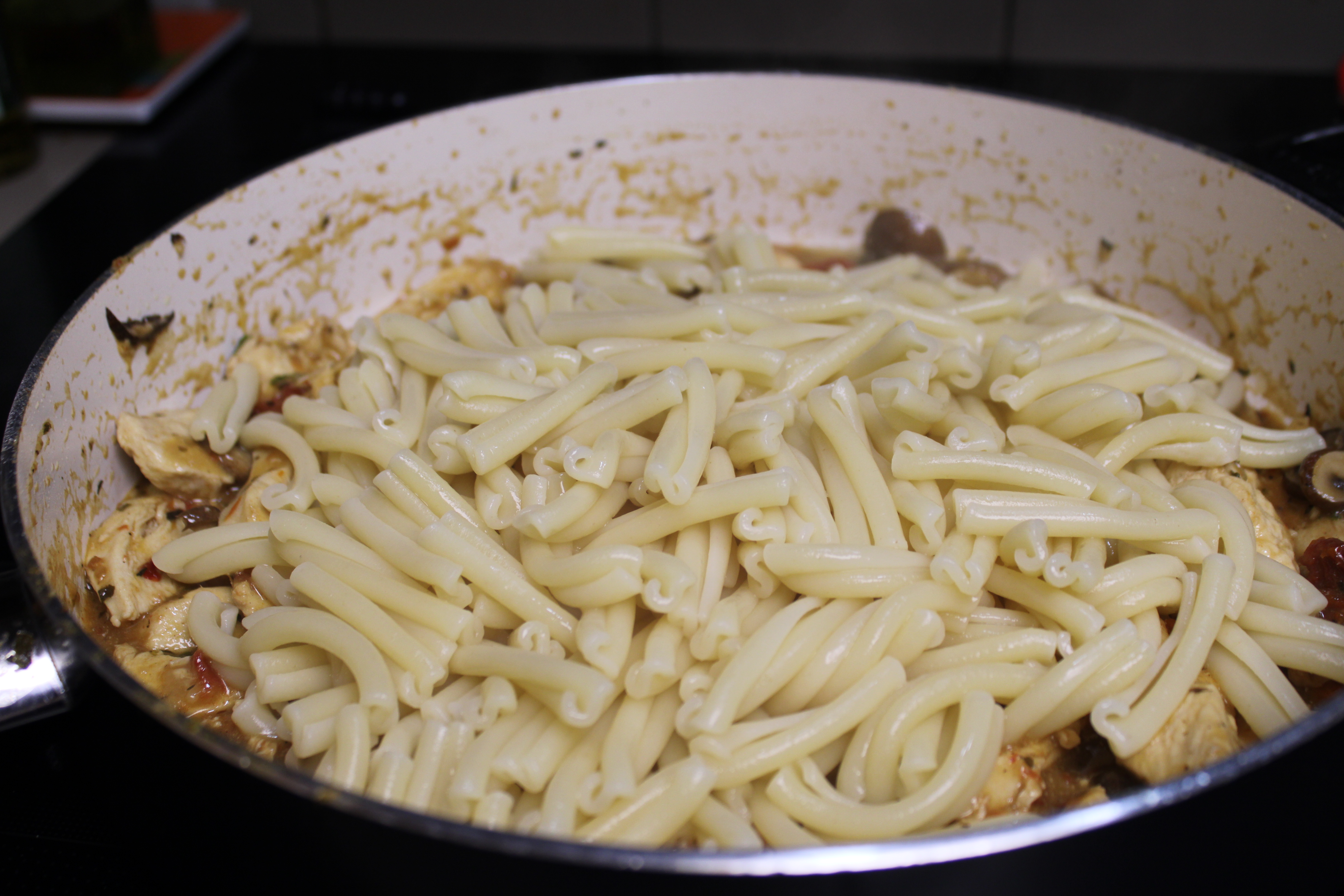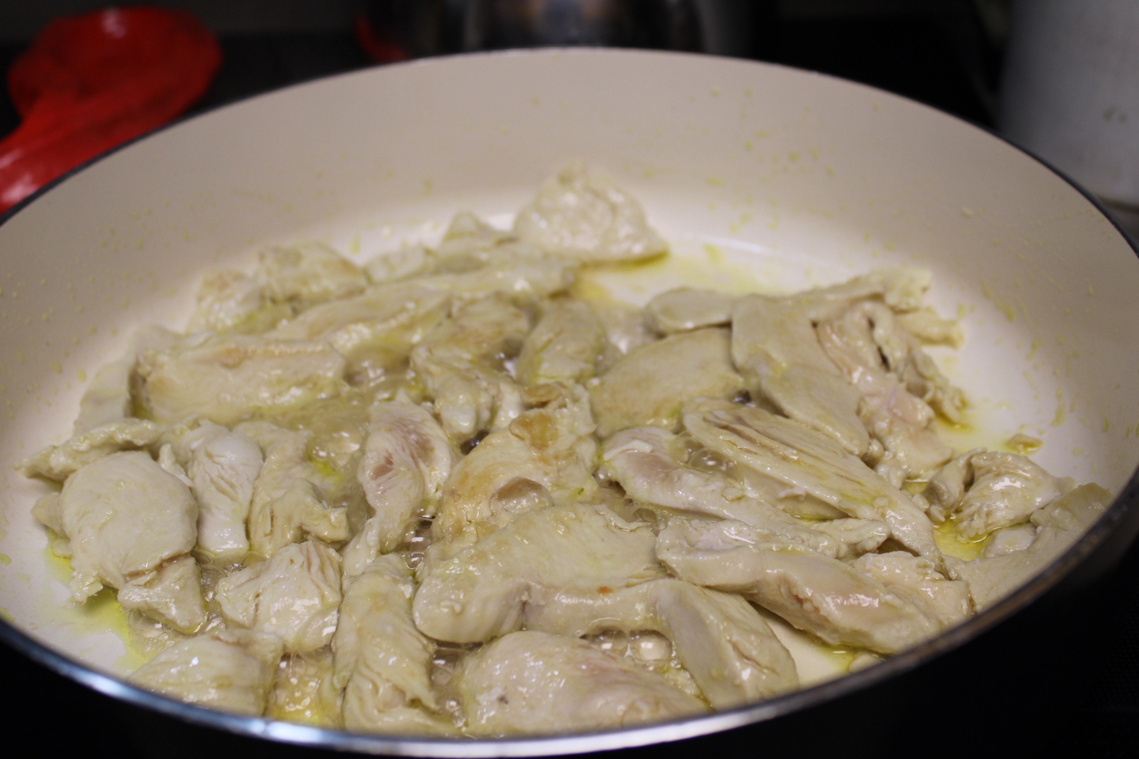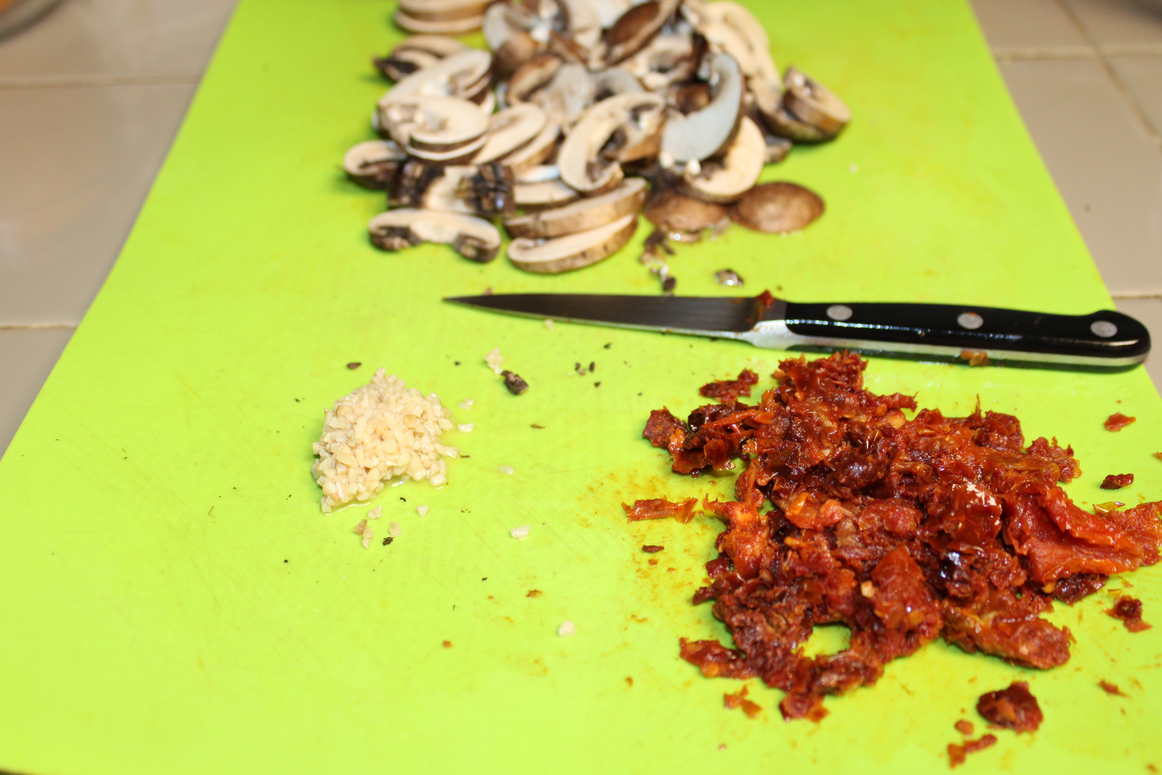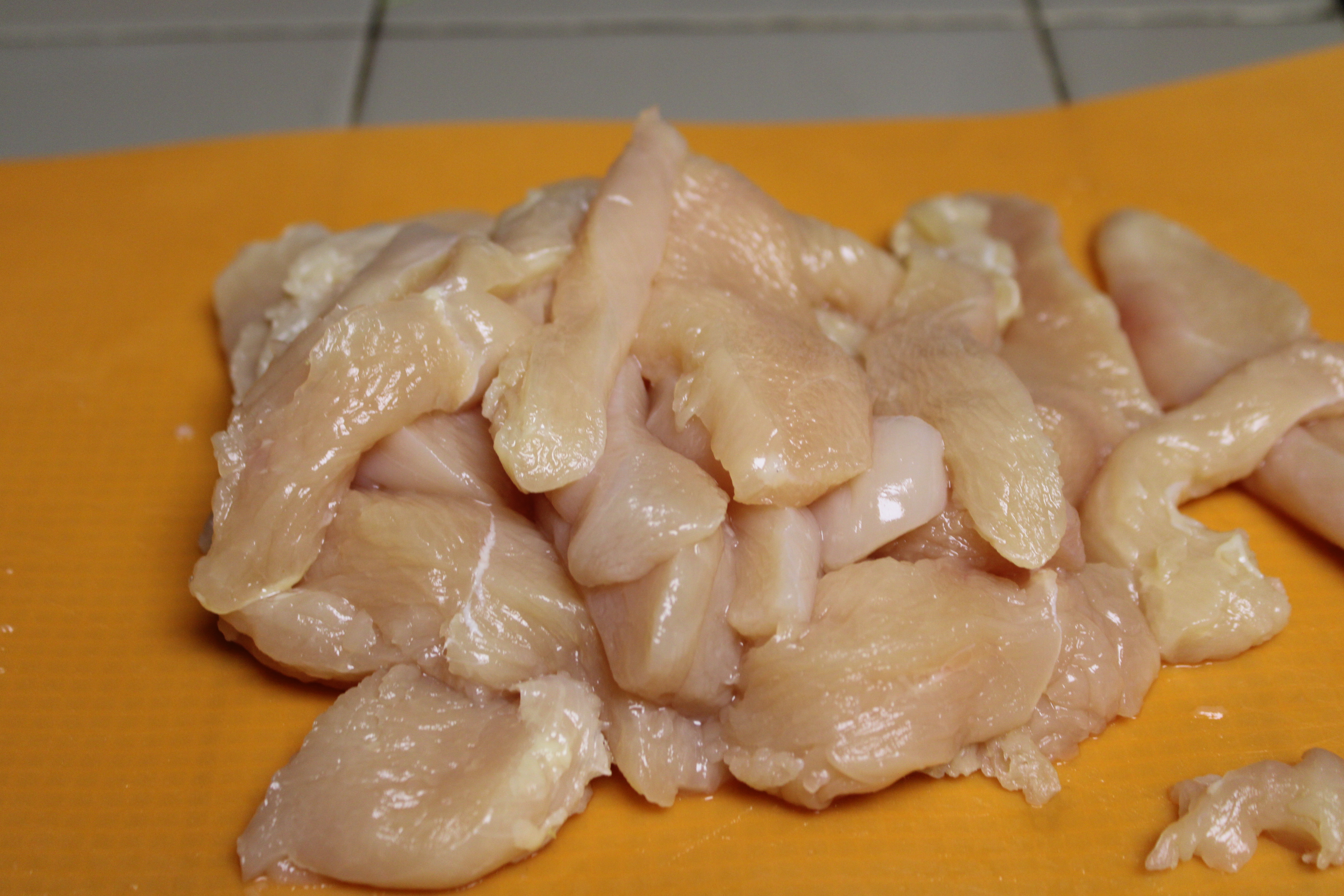 Cut chicken into strips, set aside. Clean and slice mushrooms. Peel and mince garlic. Set aside.