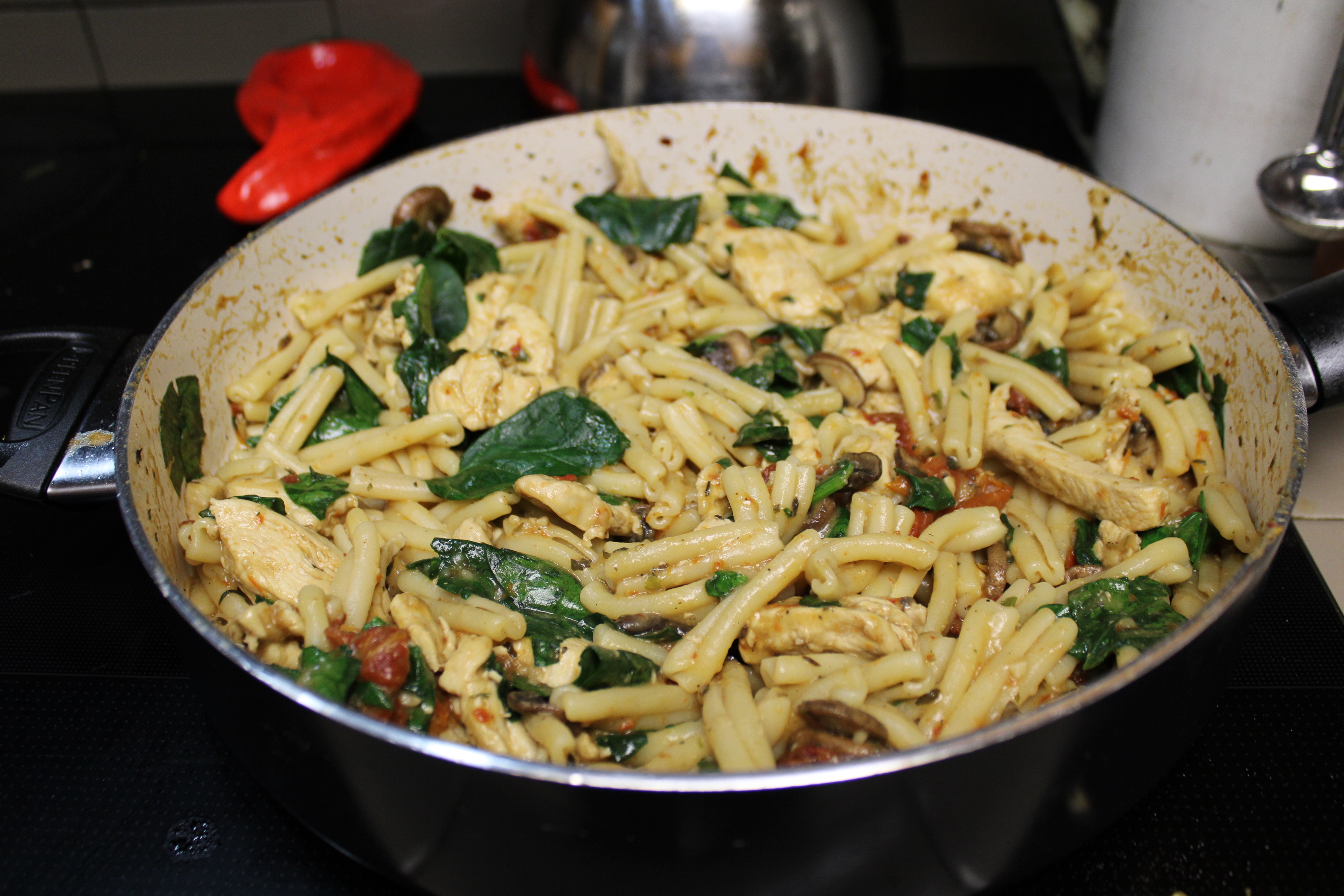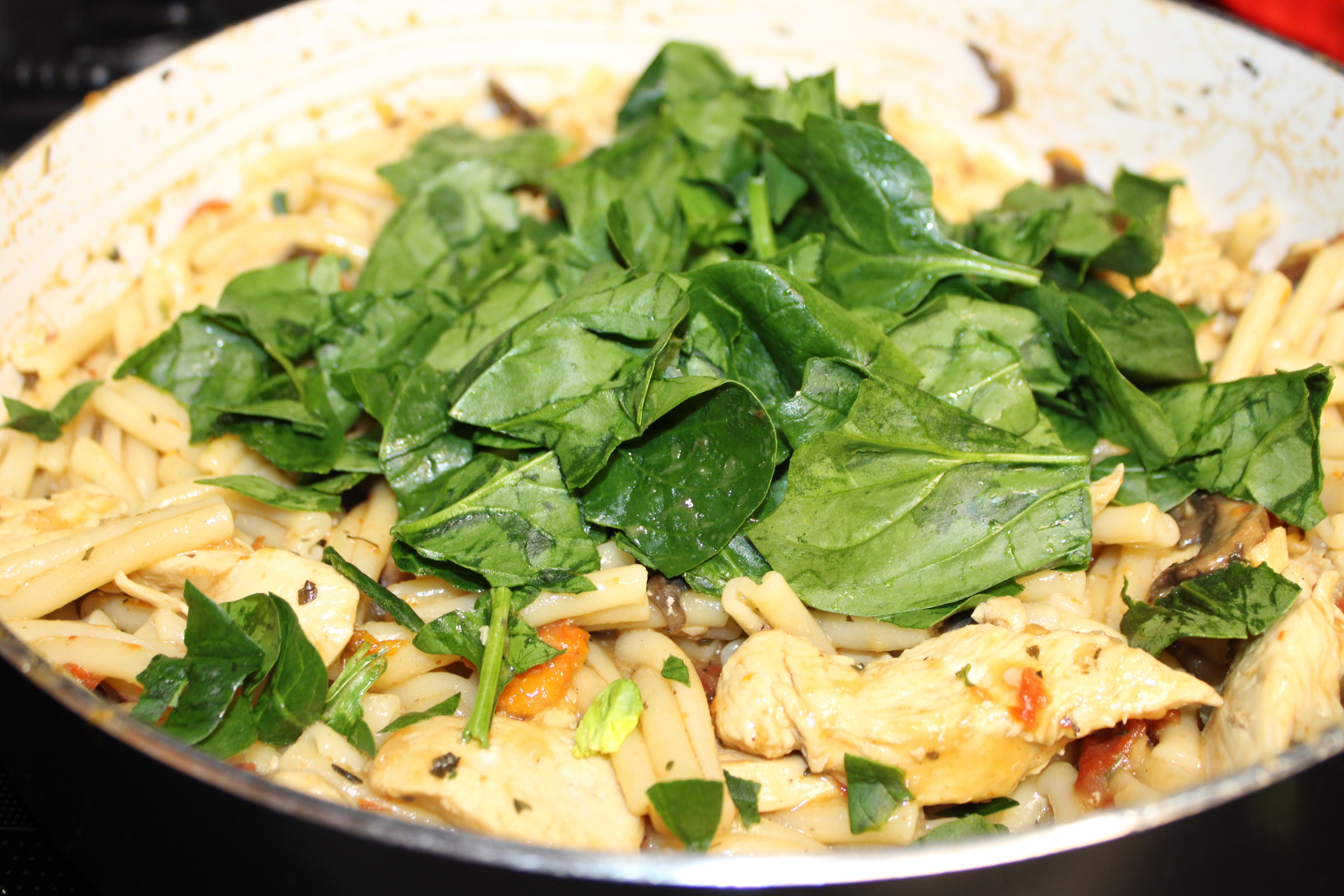 Stir in pasta. Scatter spinach over the chicken-pasta mixture. Remove from heat, cover and let spinach wilt. Stir to blend. Serve with Parmesan Cheese as a garnish.