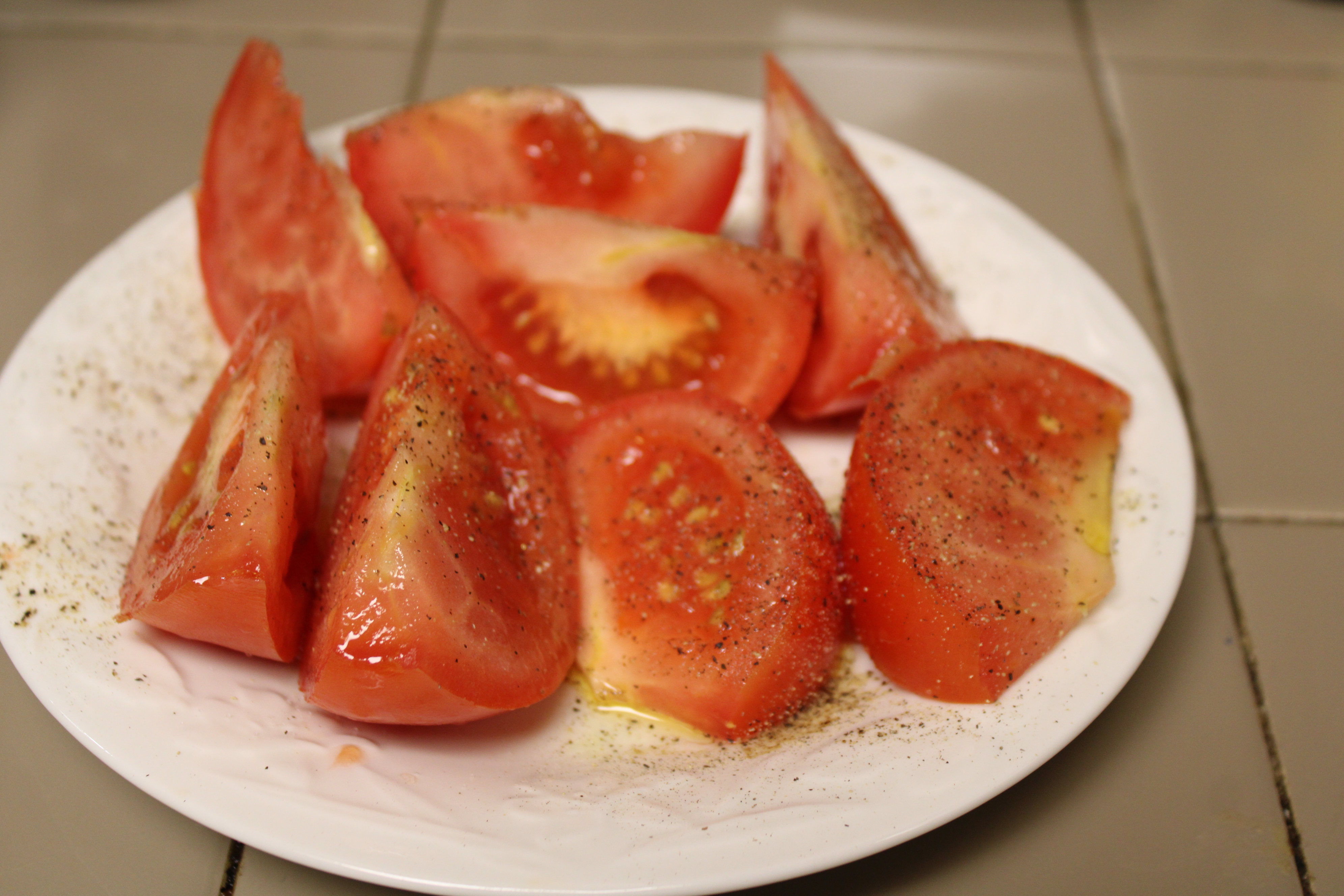 Cut tomatoes into wedges. Arrange on a plate. Drizzle with olive oil then season with salt and pepper. Chill until ready to serve.
