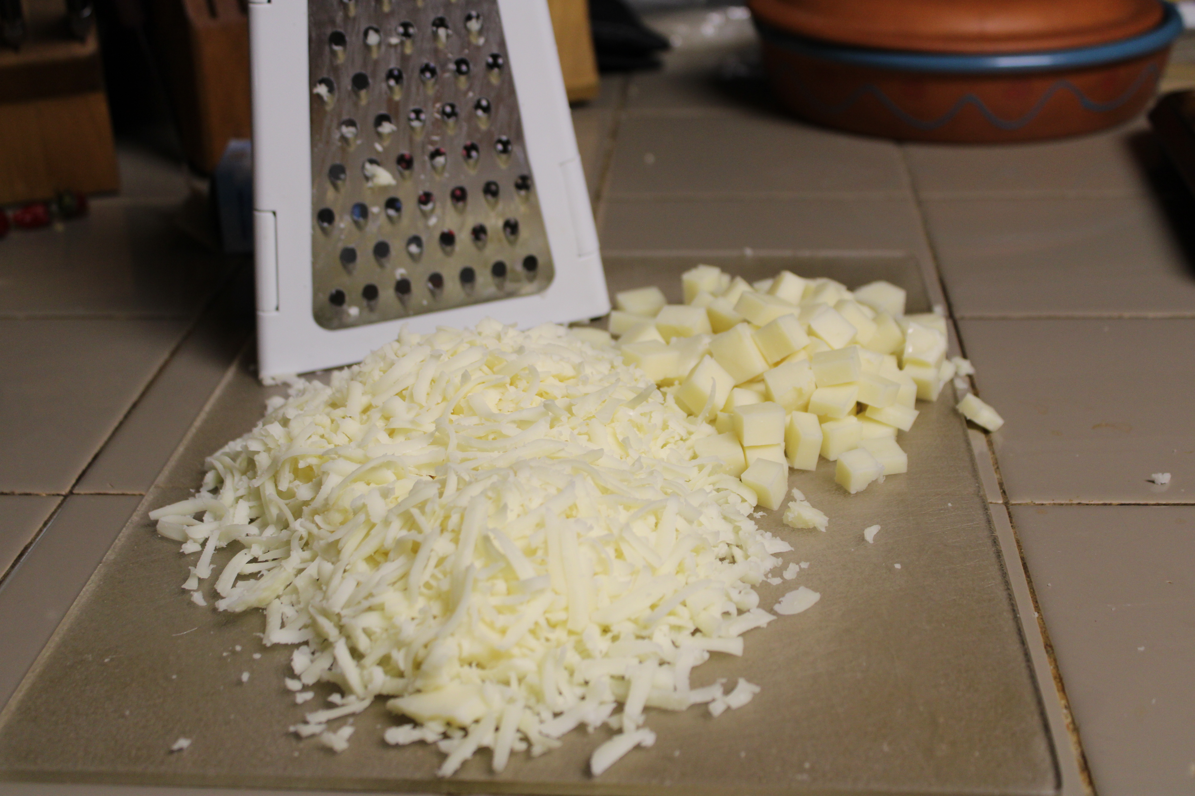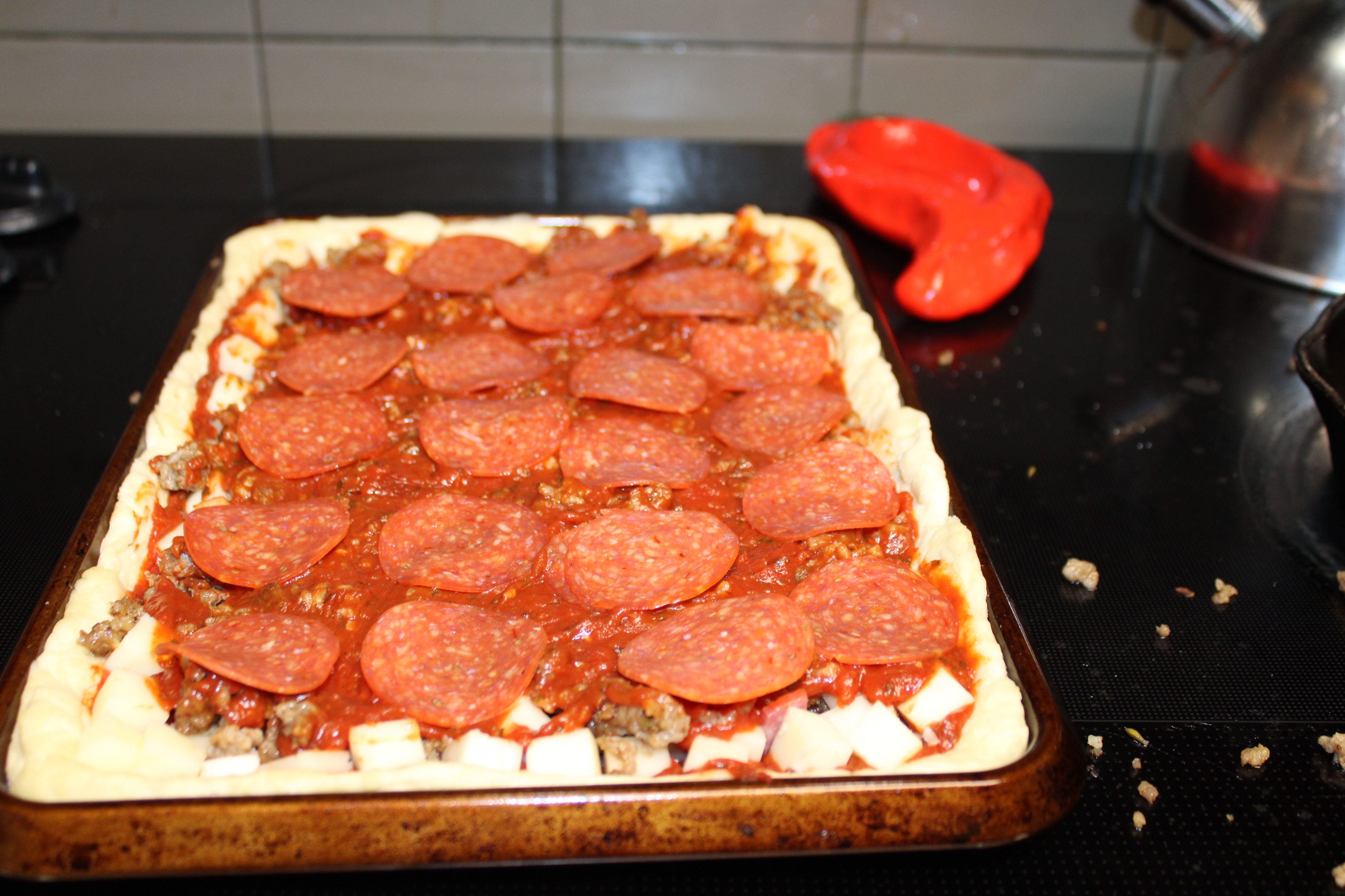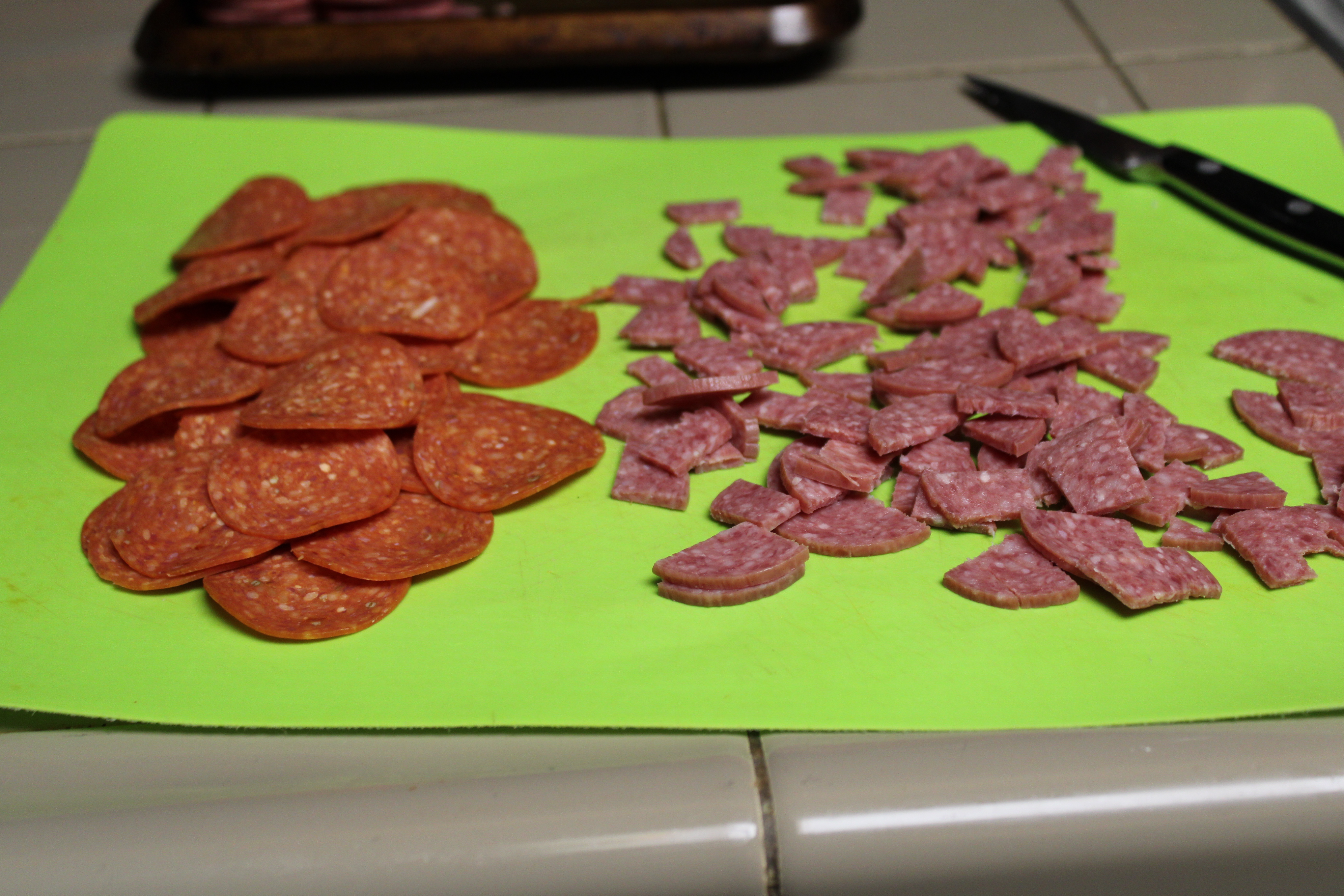 Crumble the sausage into a skillet. Cook sausage, breaking up the meat as it browns. Drain well, set aside. Separate the slices of salami and pepperoni for easy assembly. If the salami is a thicker cut (like mine) dice into smaller pieces. Cut 1/2-inch cubes from the brick cheese to go all the way around the rim of the pizza pan. Grate remaining cheese, set aside.