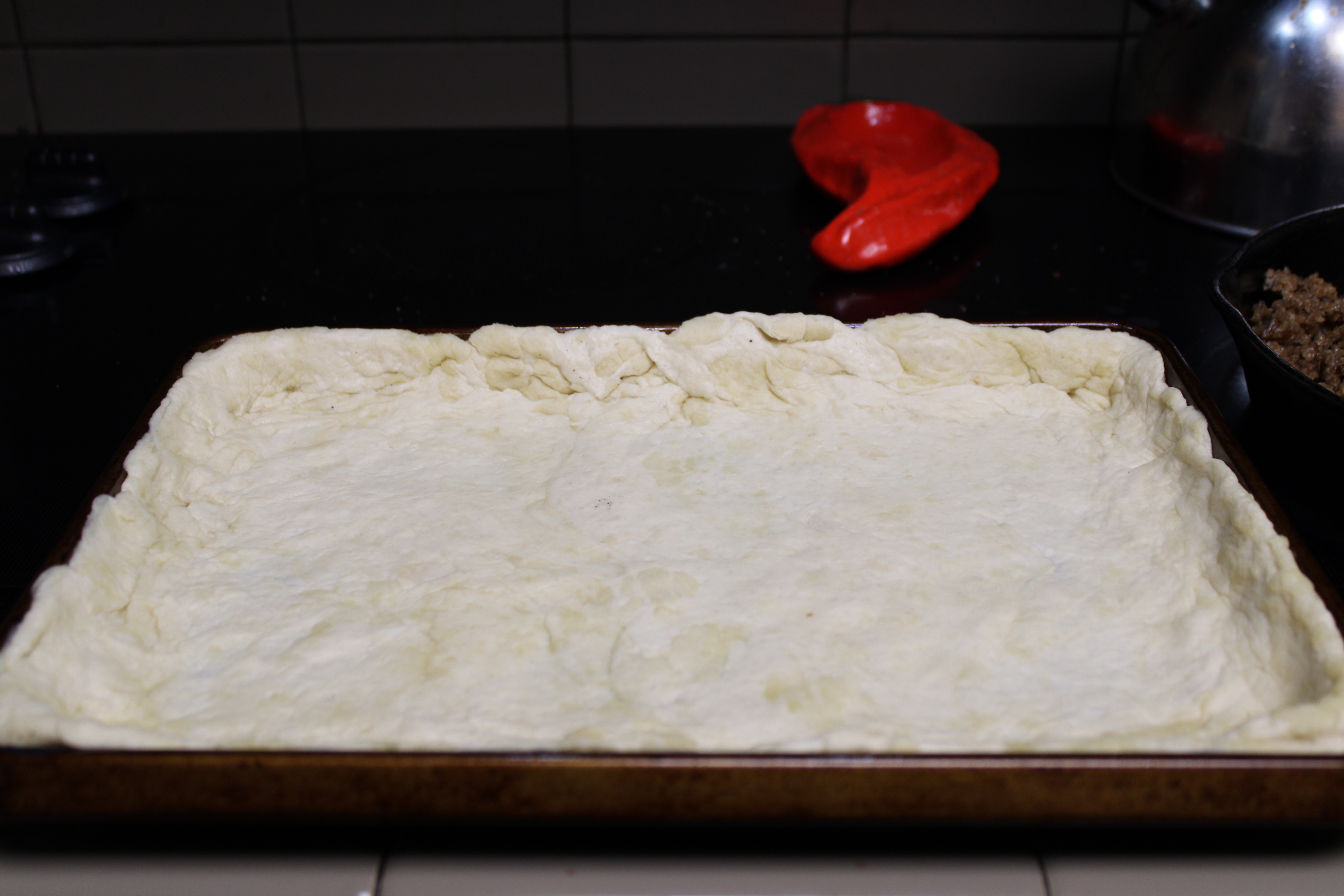 Pour the olive oil in a large rimmed cake pan or authentic Detroit-style pizza pan. Put the dough into the center of the pan. Gently stretch it out to fit so the dough reaches the corners.