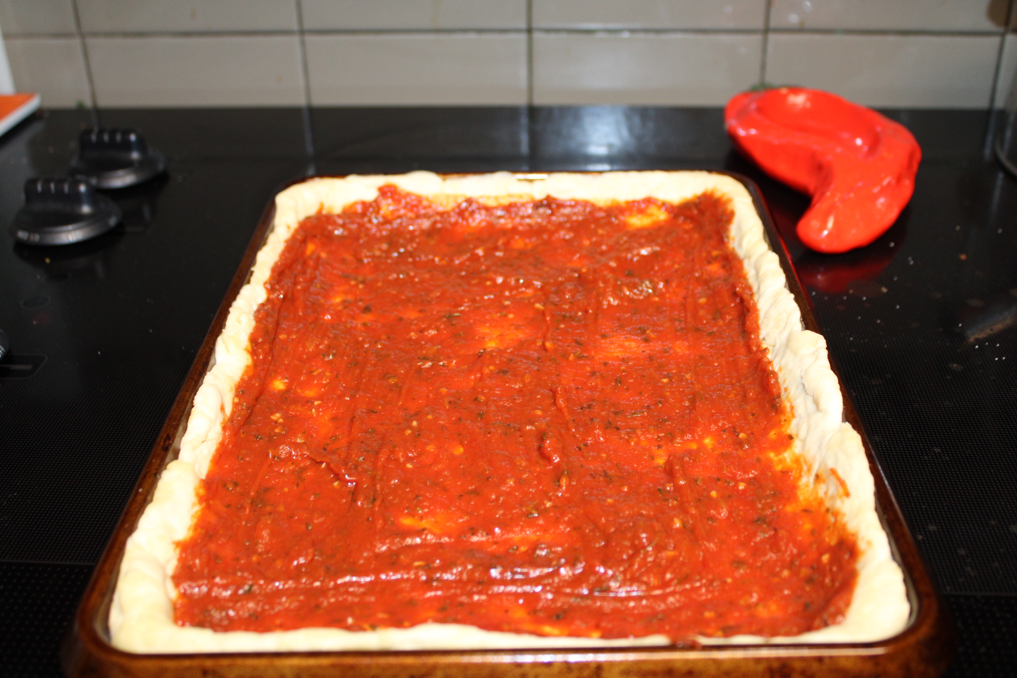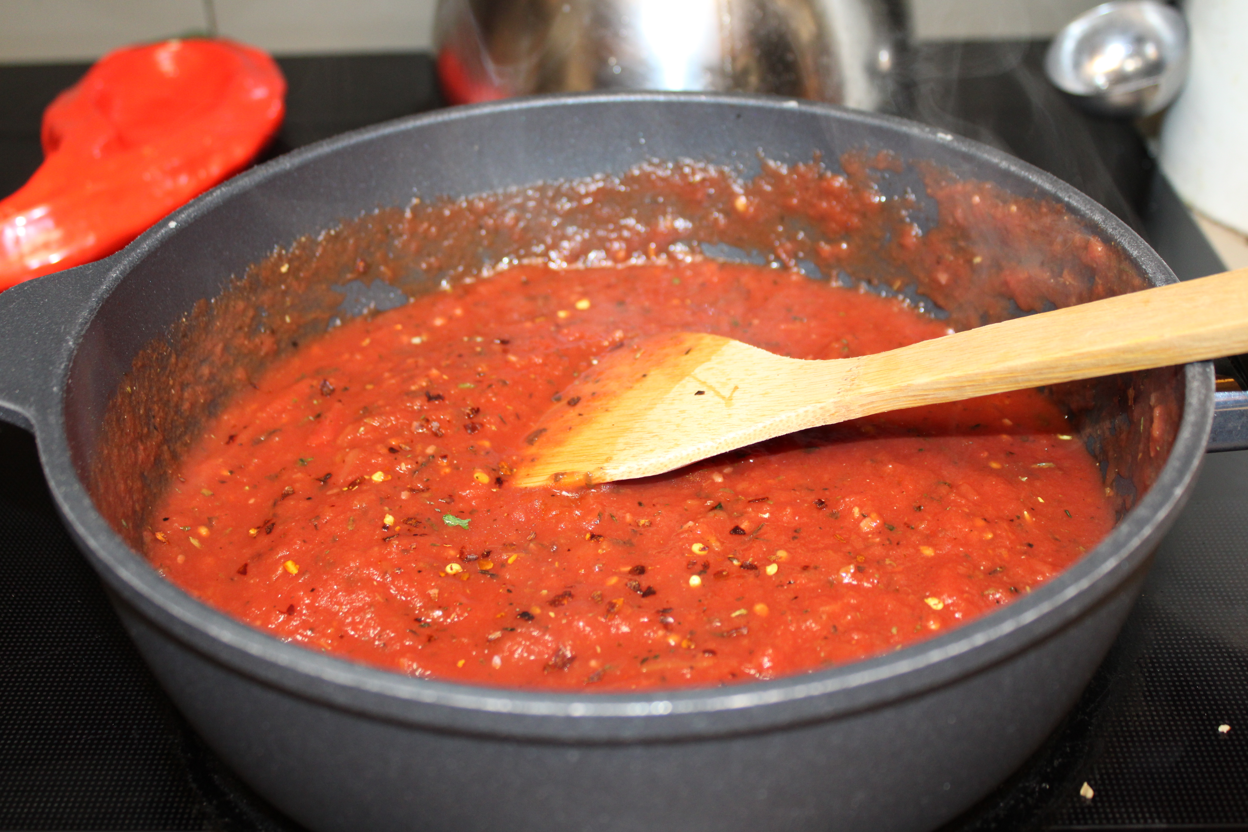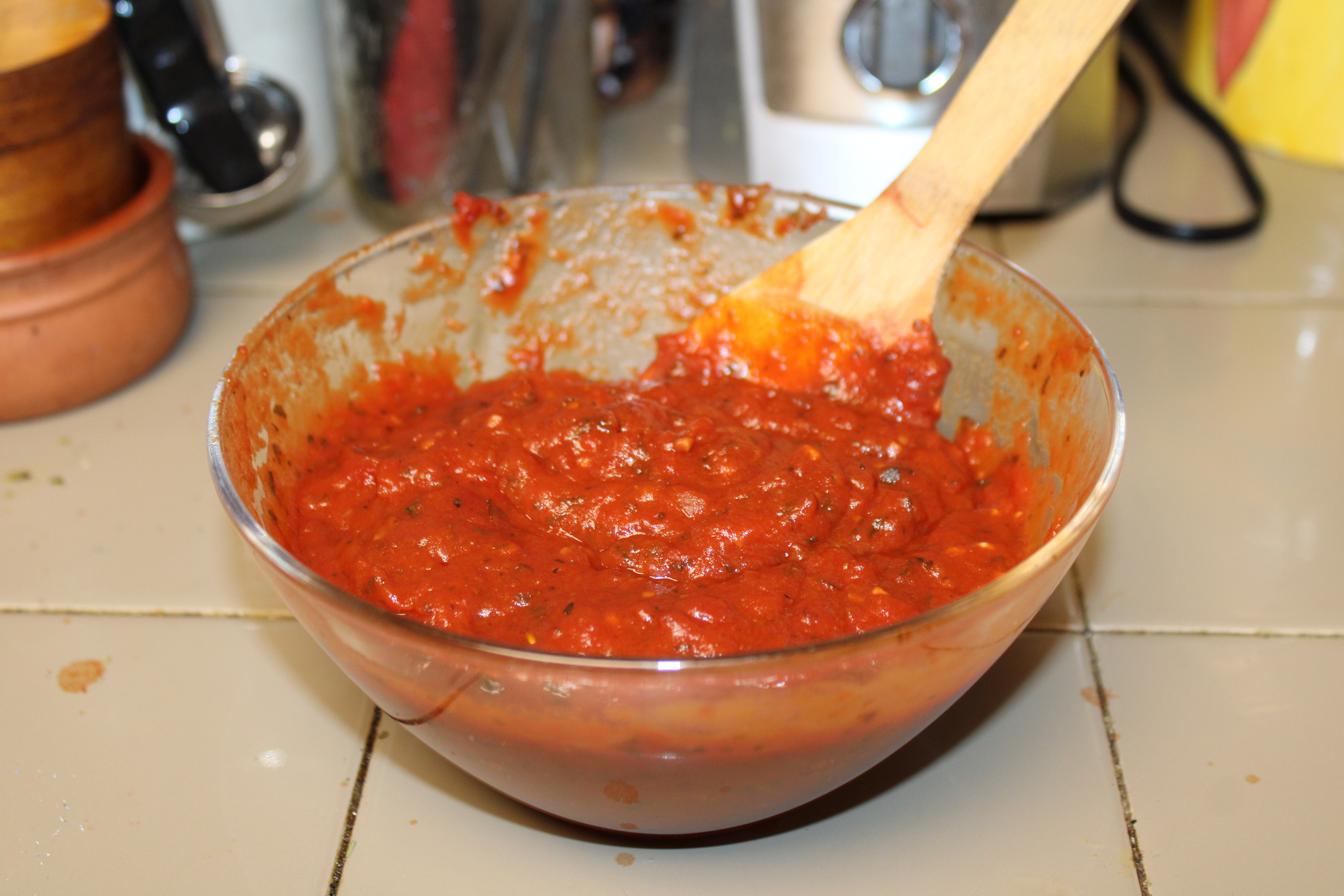 Add crushed tomatoes and sugar. Season to taste with salt and pepper. Bring pizza sauce to a simmer. Let sauce simmer until concentrated, about 30 minutes or so. Pour into a bowl, set aside to cool completely.