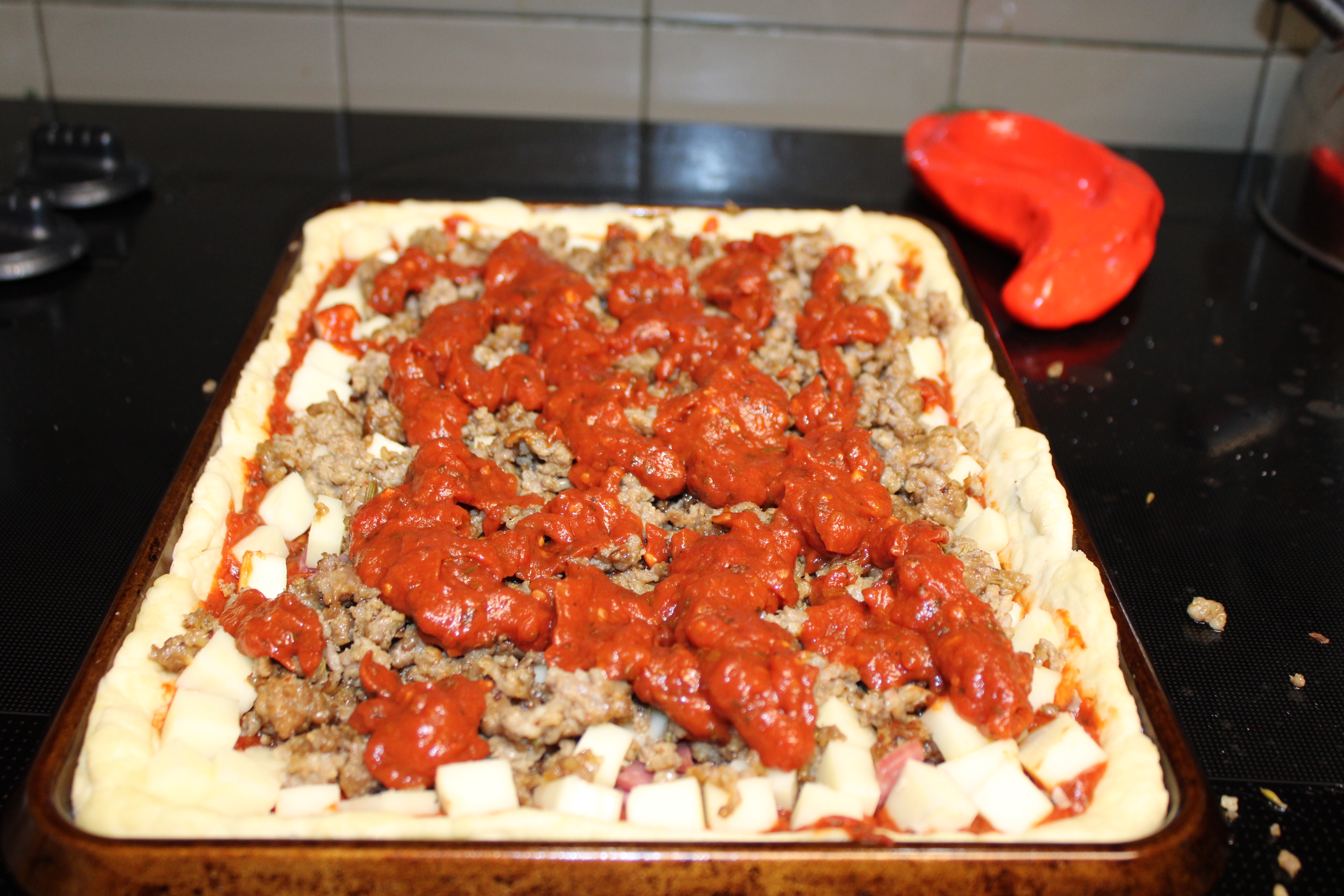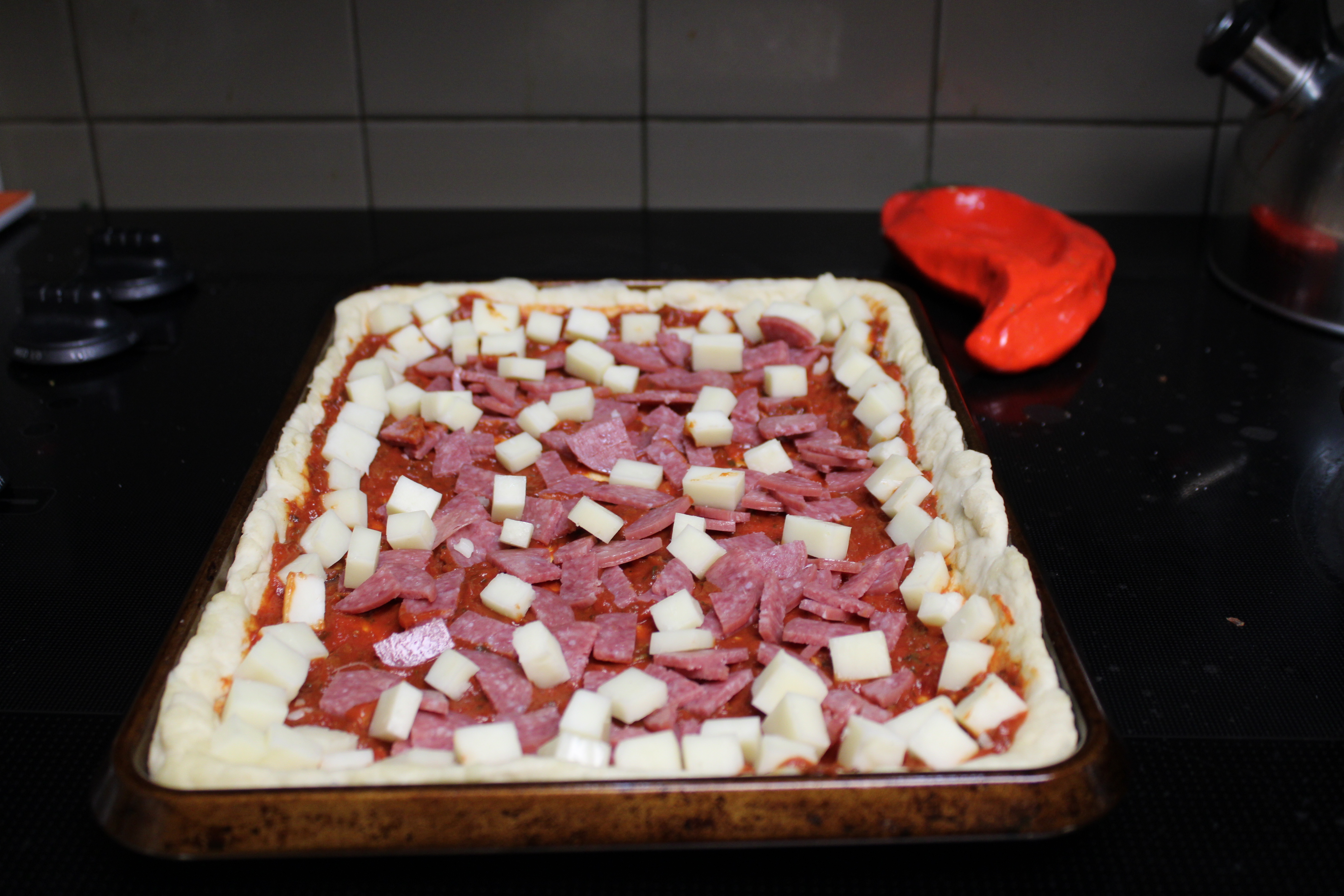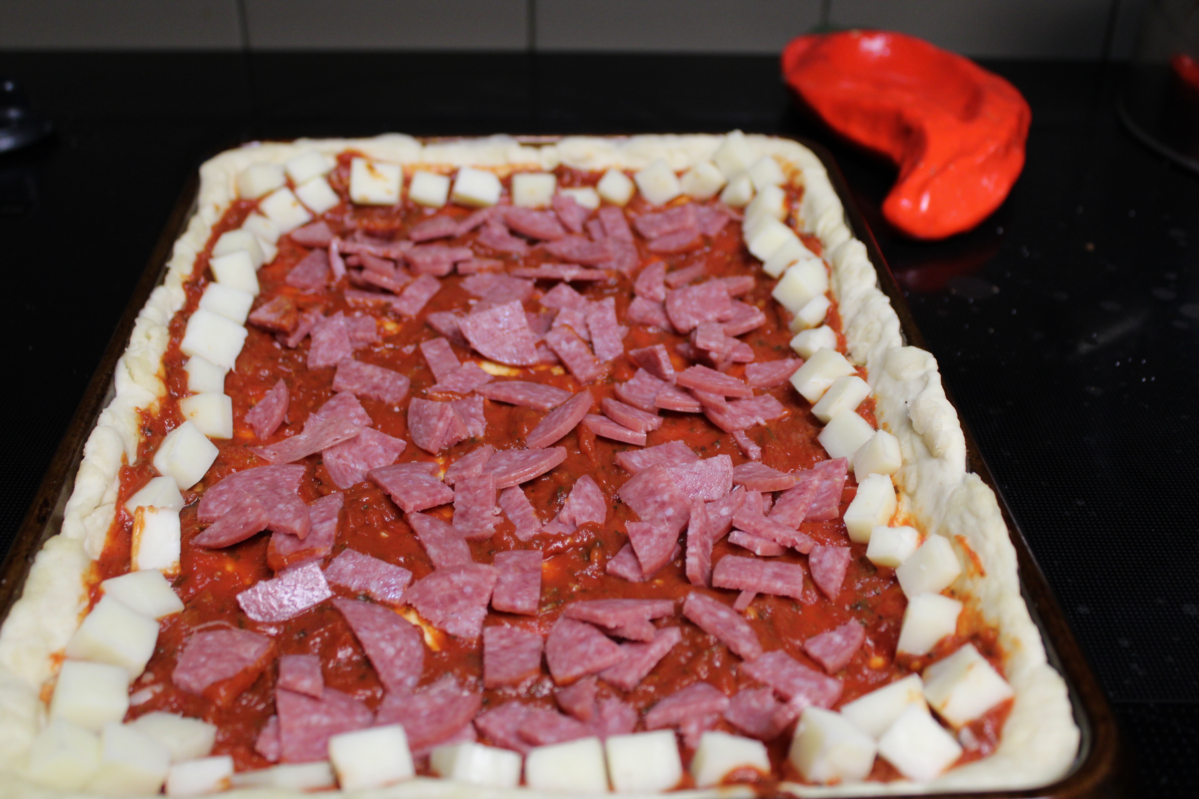Pour about half of the pizza sauce over the dough. Brush to spread out evenly. Rim the outer part of the pizza with cubes of cheese, then scatter salami over sauce. If there are any remaining cubes of cheese left, scatter those over the salami.