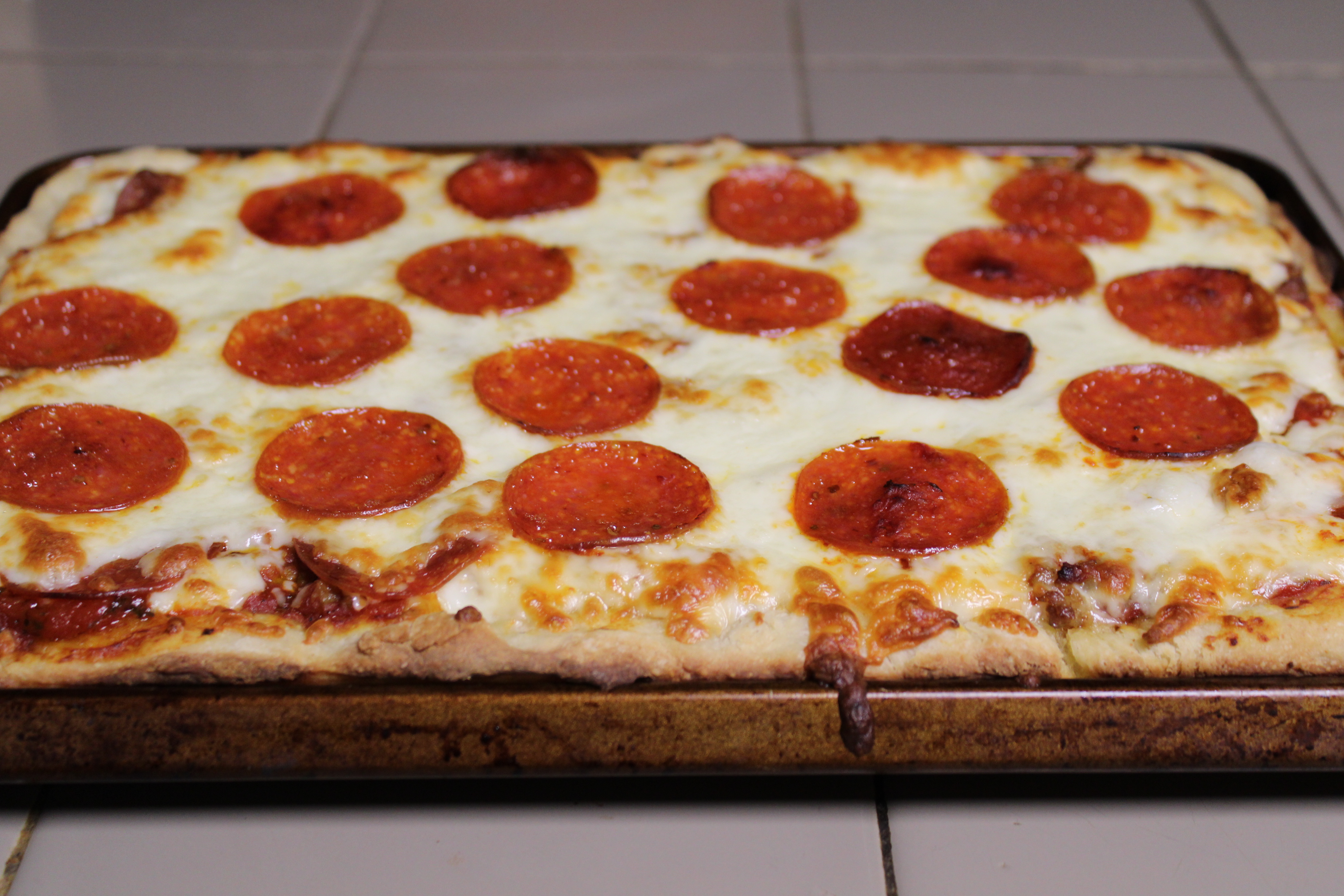 Place pizza in the oven to bake for 10 to 12 minutes, rotating halfway through the cooking time. Turn oven to broil to crisp up the edges. Remove pizza and let it rest for about 8 minutes before slicing into squares.