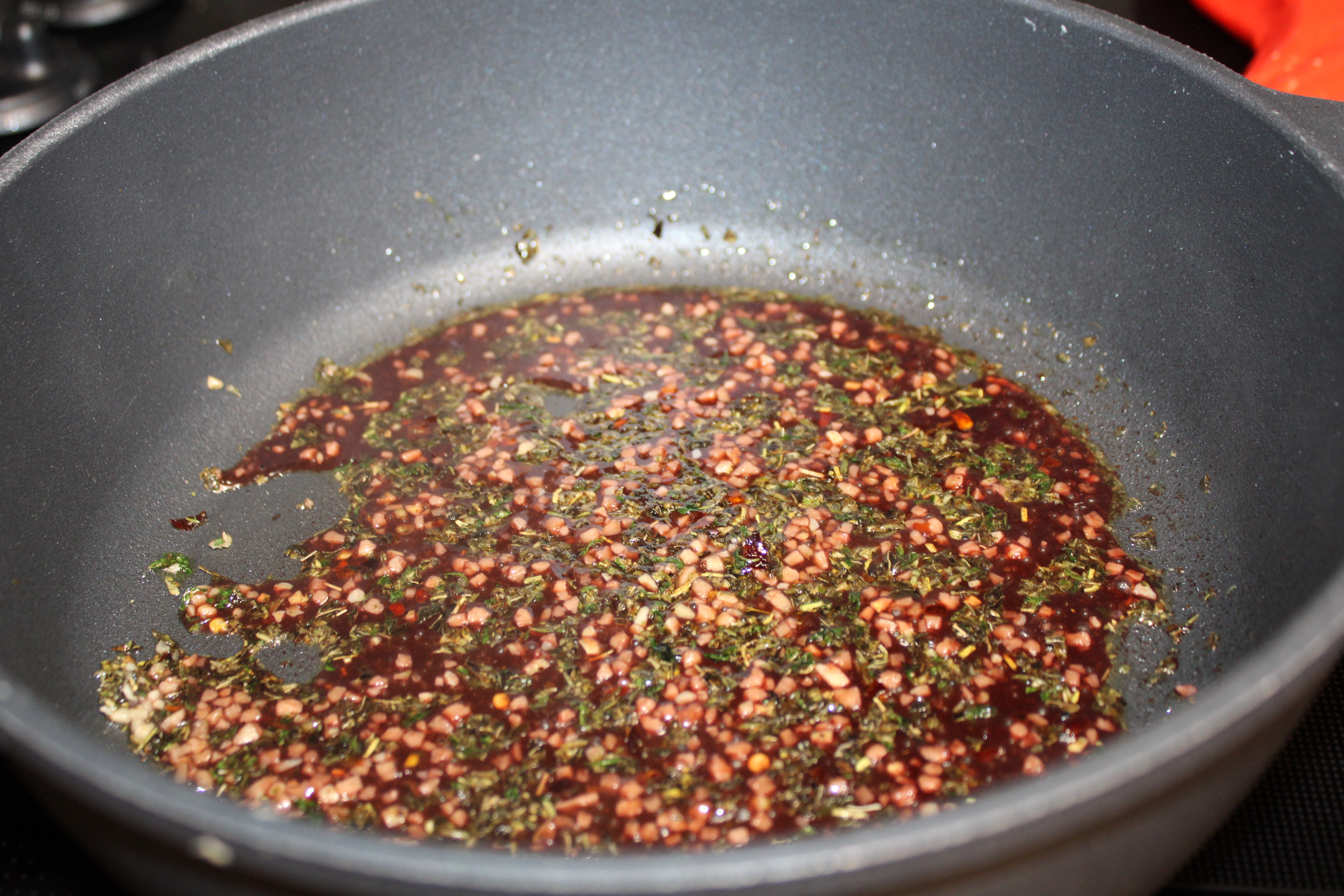 In a saucepan over medium heat, heat oil. Add the Italian seasoning, minced garlic and red pepper flakes. Sauté until fragrant; about 30 seconds. DO NOT let the garlic burn. Add a splash of red wine, swirl the pan to mix.