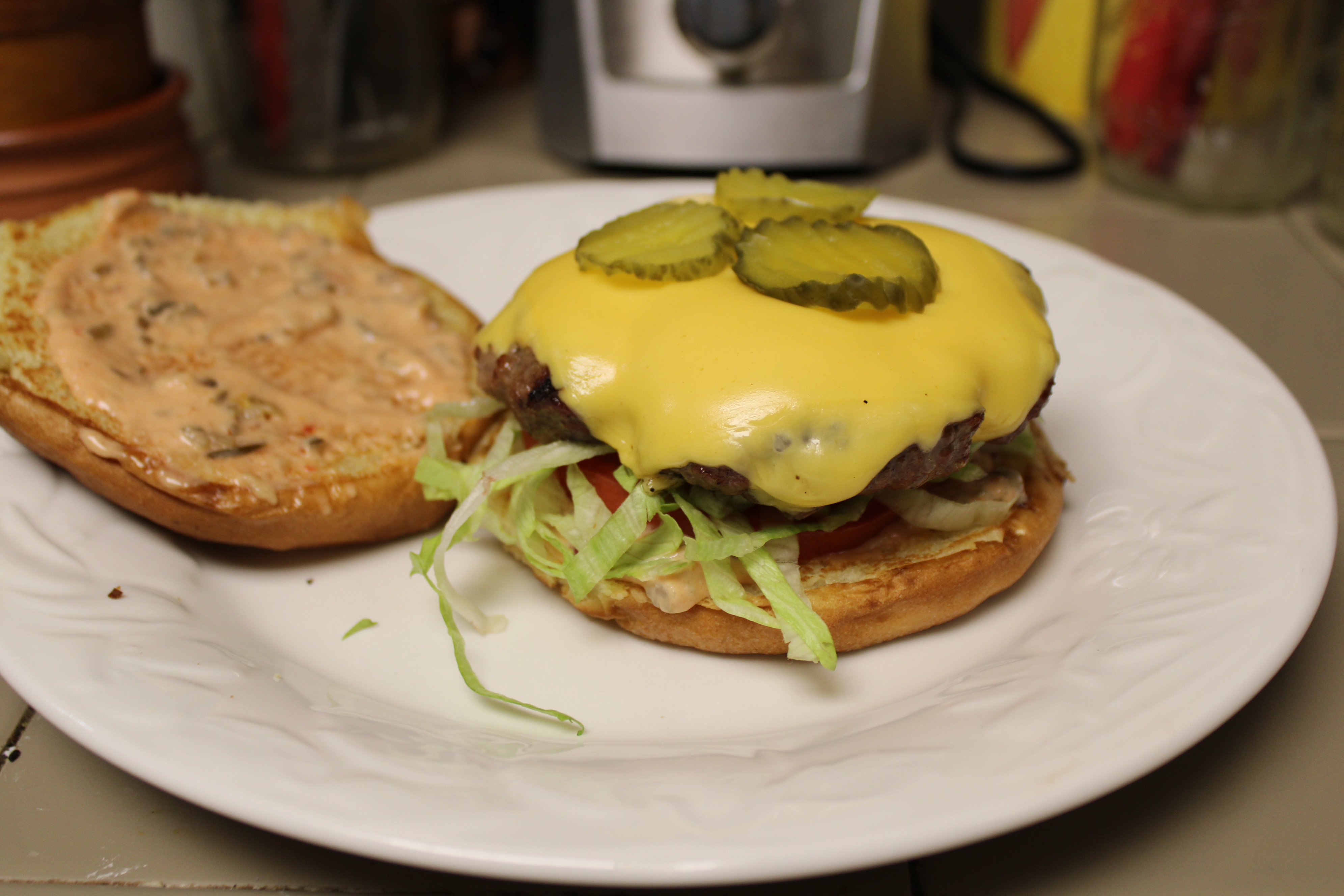 Spread a healthy dollop of Pickle Sauce on the top and bottom toasted buns. Scatter onion on the bottom bun, then a slice of tomato and some shredded lettuce. Top with cheeseburger, some pickles and the top bun. Serve with French Fries and enjoy.
